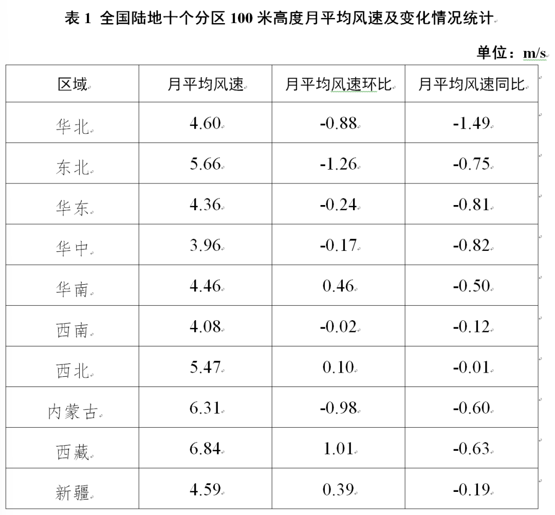 全国陆地及部分海上区域100米高度月平均风速环比分布(单位:m/s)