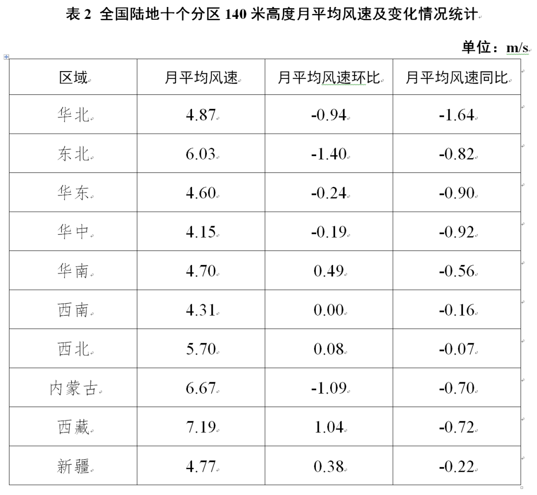 全国陆地十个分区(详见附件1)100米、140米高度月平均风速及环比、同比变化情况如表1和表2所示。从表中可以看出,2026年3月,东北、西北、内蒙古、西藏四个区域100米高度月平均风速超过5.0 m/s,有利于风力发电。