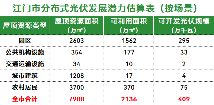 此外,文件还明确江门市分布式光伏发展潜力估算表(按场景),江门市屋顶资源面积合计900万㎡,可利用面积合计2136万㎡,可开发光伏规模合计409万千瓦,具体如下: