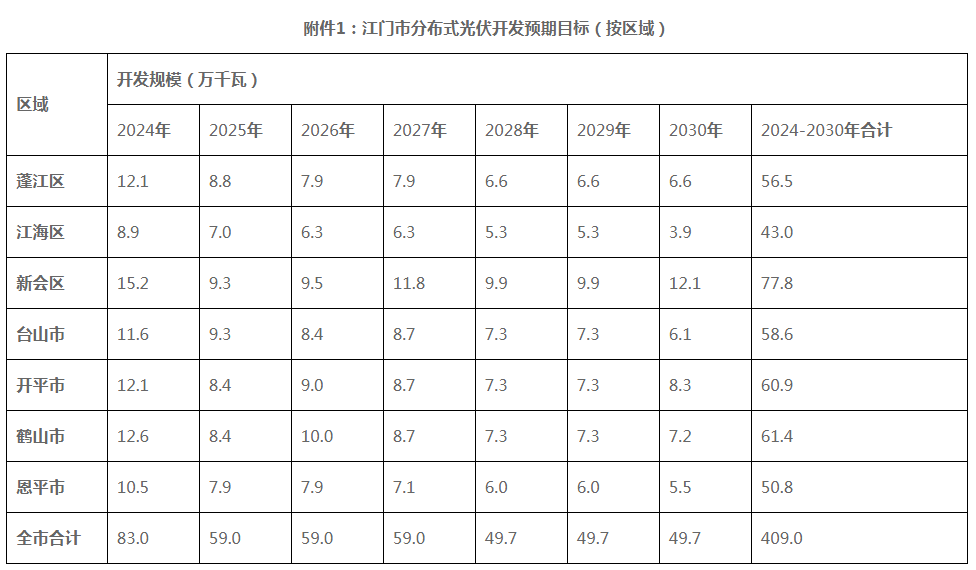 文件明确2024-2030年江门市各区域分布式光伏开发预期目标,开发规模合计409万千瓦,具体如下: