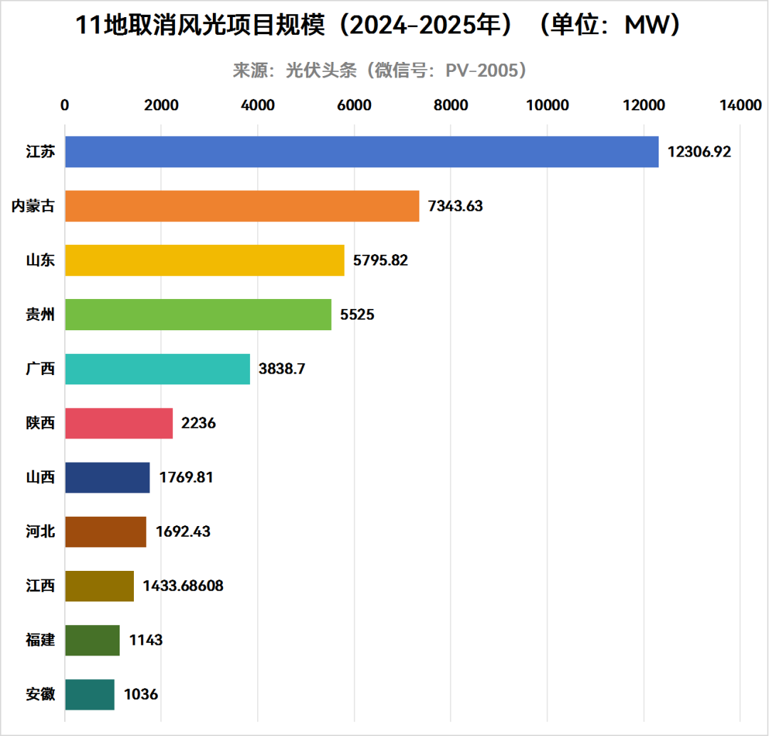 此外,贵州、广西、陕西、山西、河北、江西、福建、安徽8地风光项目取消规模均超1GW。
