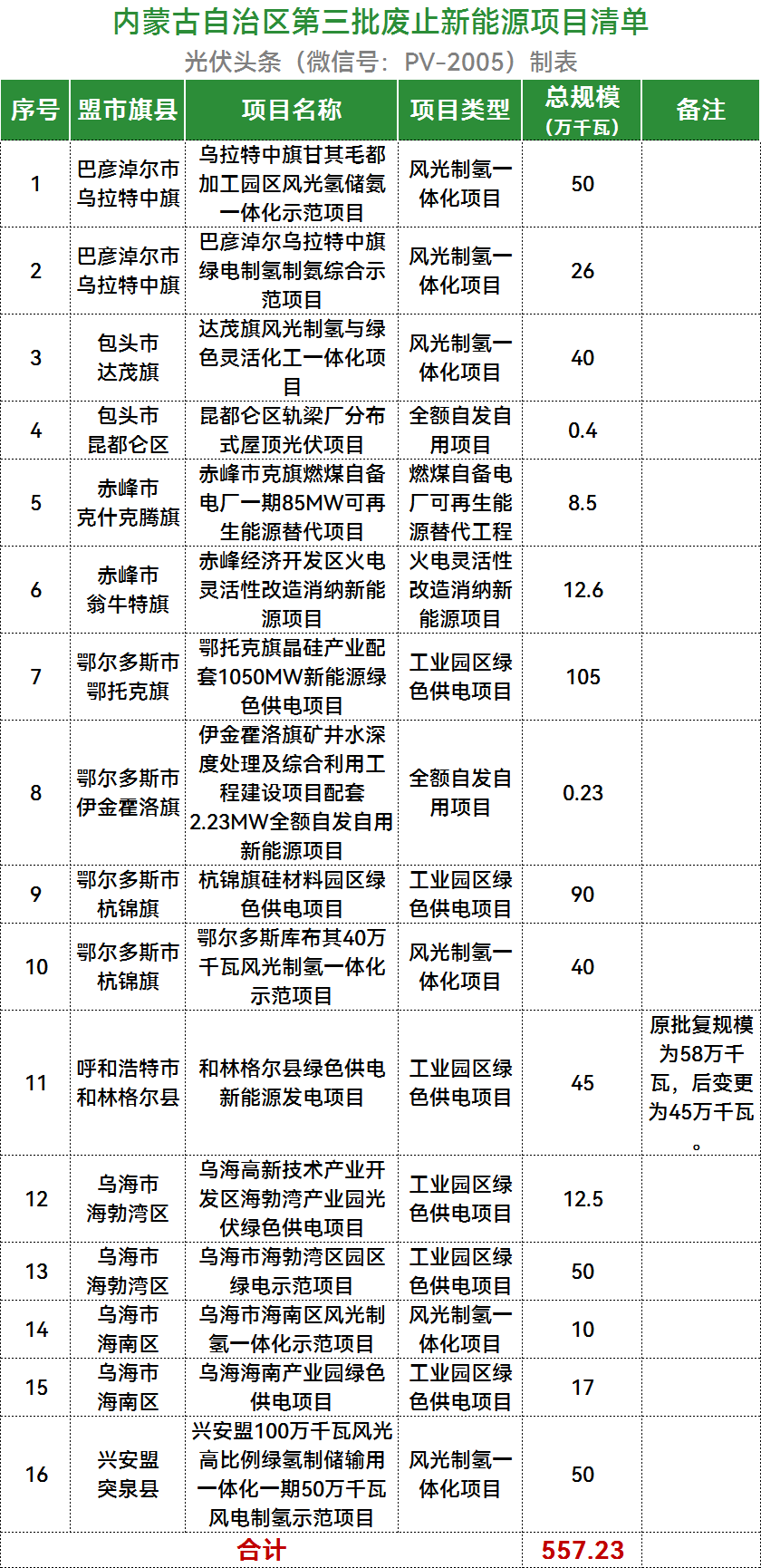 2024年8月8日,内蒙古发布《关于全区第三批废止新能源项目情况的公告》。公告显示,全区第三批共废止新能源项目16个,总规模557.23万千瓦,全部为市场化并网项目。