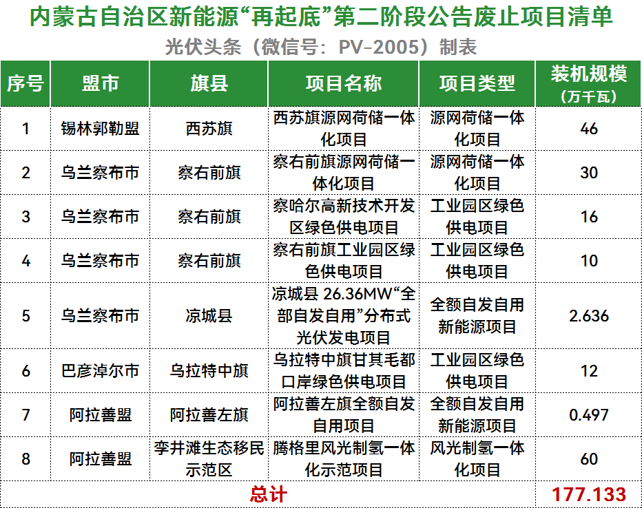 2024年2月8日,内蒙古能源局发布《关于全区新能源“再起底”第二阶段项目废止情况的公告》,内蒙古腾格里60万千瓦风光制氢一体化示范项目等被废止,规模共177.133万千瓦。