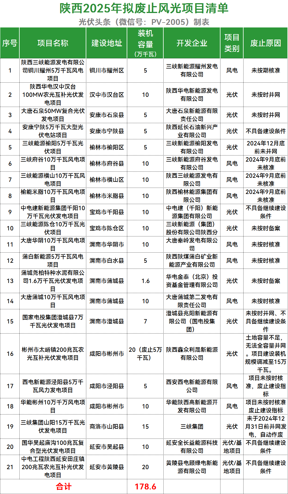 1月以来,陕西铜川市、汉中市、安康市、榆林市、宝鸡市、渭南市、咸阳市、商洛市发布了2021-2023年保障性并网项目拟废止项目清单,规模合计1786MW。