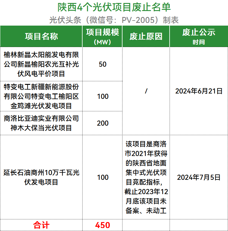2024年6月21日,榆林市发改委发布《关于榆林市2021年保障性新能源项目拟废止项目的公示》。文件指出,对全市2021年度保障性新能源项目进行了梳理,拟对榆林新晶太阳能发电有限公司新晶榆阳农光互补光伏风电平价项目(50MW)、特变电工新疆新能源股份有限公司特变电工榆阳区金鸡滩光伏发电项目(100MW)、商洛比亚迪实业有限公司神木大保当光伏项目(200MW)等3个项目予以废止,废止规模共计350MW。