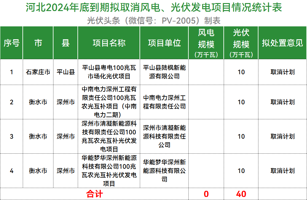 2025年2月20日,河北省公示2024年底到期风电光伏项目拟调整情况。河北拟取消光伏发电项目4个,规模共计400MW。