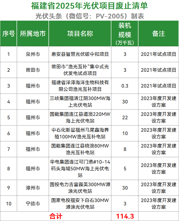 2月19日,福建省发展和改革委员会发布关于废止一批已不具备实施条件的光伏电站项目的通知。文件提出,为规范项目管理,促进资源集约节约利用,福建发改委印发了2021—2023年各年度光伏电站开发建设方案(试点项目),但受国家要素保障部门政策调整等因素影响,部分光伏项目已不具备开发条件。根据各地报来的梳理情况及废止建议,决定废止惠安县智慧光伏碳中和项目等10个项目,共计114.3万千瓦。