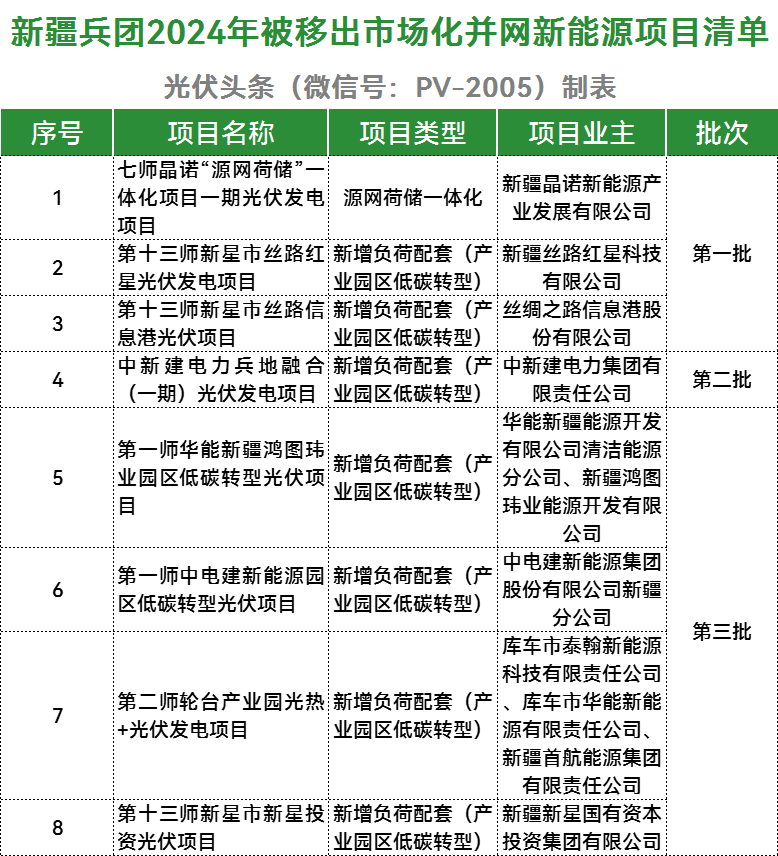 自2024年9月9日起,截至目前,新疆兵团共发布三批通知,共计将8个项目移出市场化并网新能源项目清单。其中,源网荷储一体化项目1个,新增负荷配套(产业园区低碳转型)项目7个。