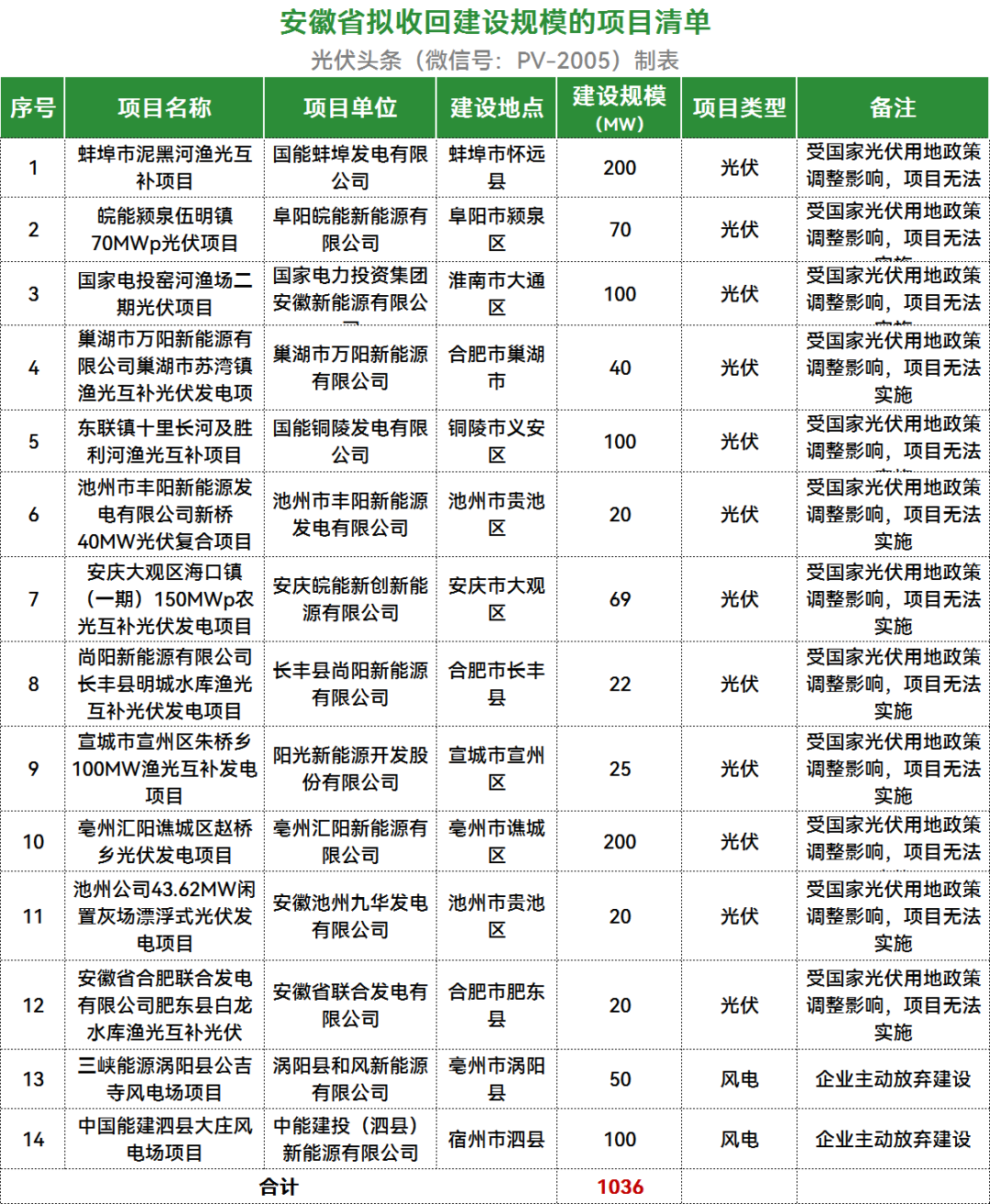 2024年11月26日,安徽省能源局发布关于2021年和2022年部分批次竞争性配置项目拟调整情况的公示。公示显示,拟收回建设规模项目总计1036MW,其中,光伏项目886MW,拟收回建设原因均是受国家光伏用地政策调整影响,项目无法实施。风电项目拟收回150MW,项目分别是三峡能源涡阳县公吉寺风电场项目、中国能建泗县大庄风电场项目,拟收回建设原因均是由于企业主动放弃建设。