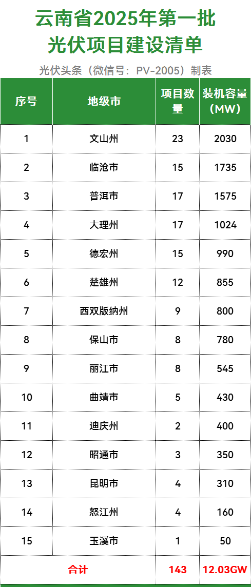 纳入云南省2025年第一批新能源项目开发建设方案实施的项目共175个,装机1448.905万千瓦,其中光伏项目143个,装机1203.4万千瓦;风电项目32个,装机245.505万千瓦(详见附件)。