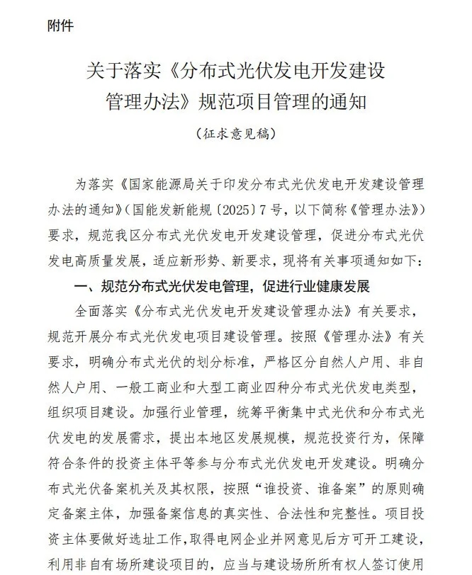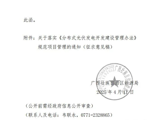 获悉,日前,广西能源局印发《关于落实〈分布式光伏发电开发建设管理办法〉规范项目管理的通知》(征求意见稿)意见的函。