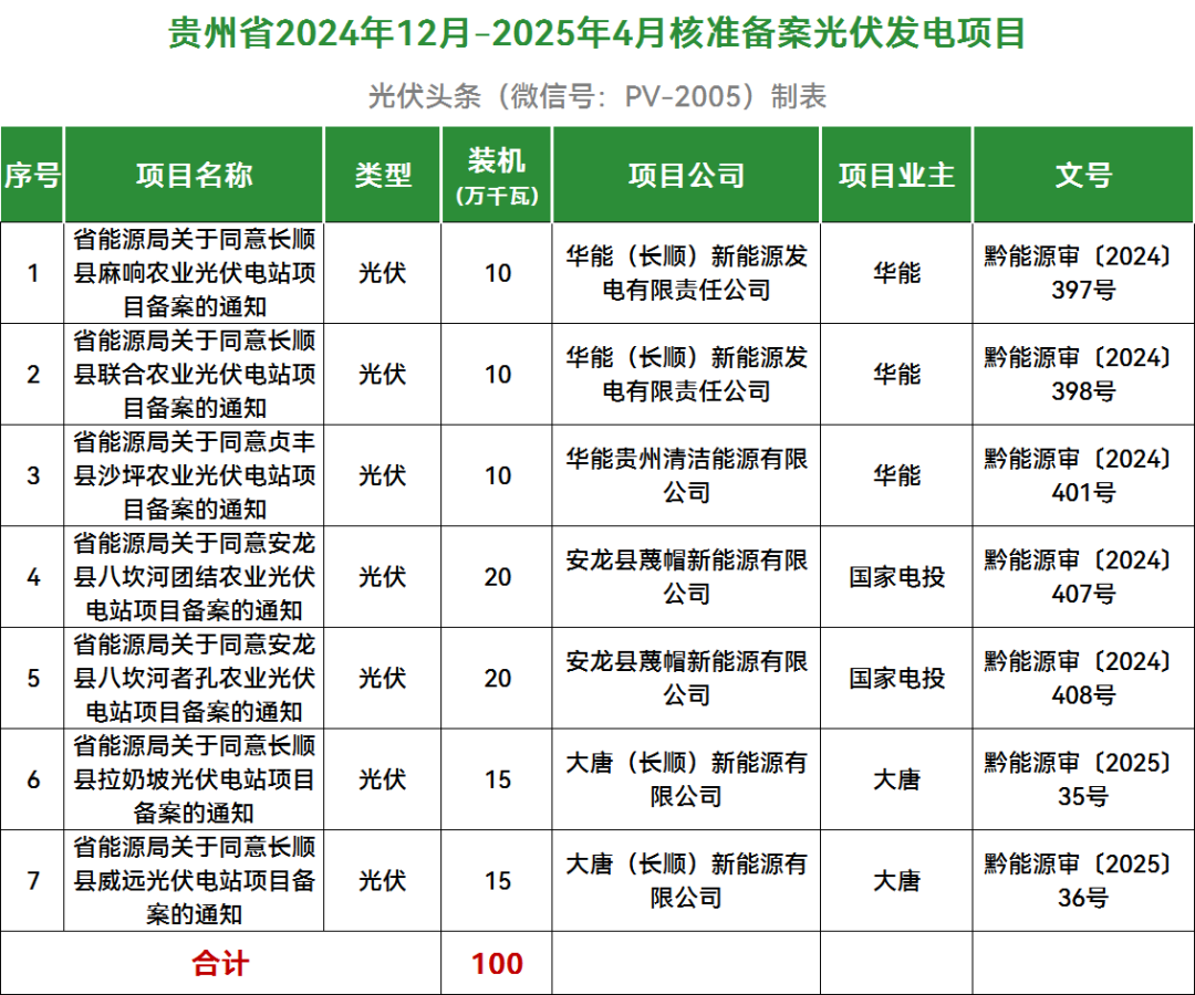 获悉,4月24日,贵州省能源局公布2024年12月-2025年4月核准备案风电光伏发电项目情况。