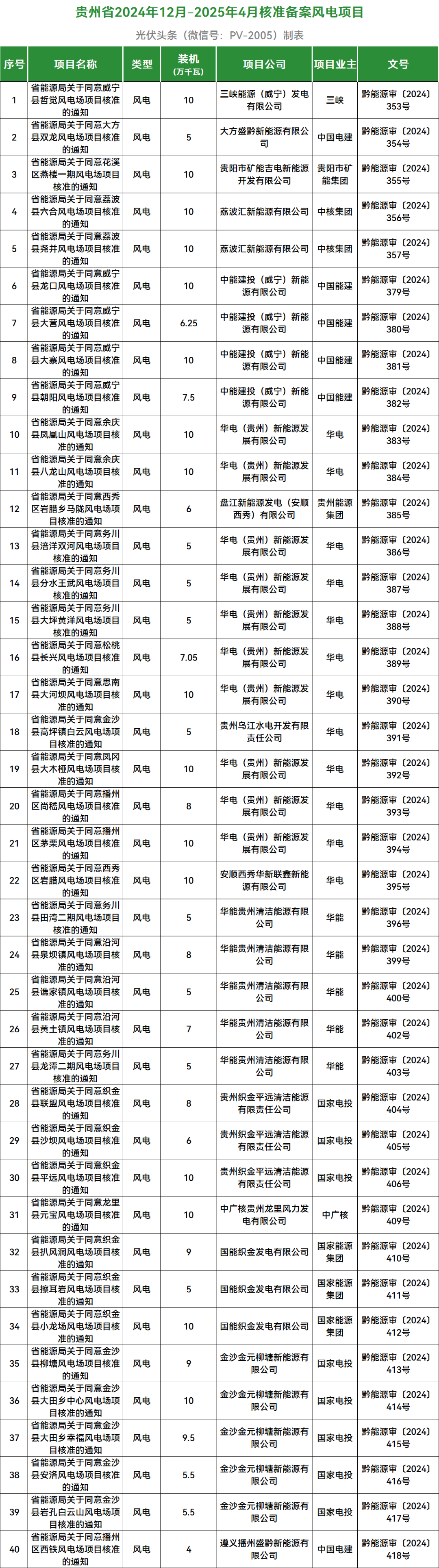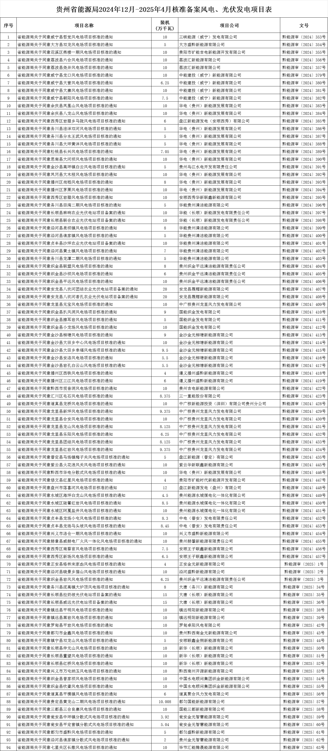 贵州省能源局2024年12月-2025年4月核准备案风电光伏发电项目情况