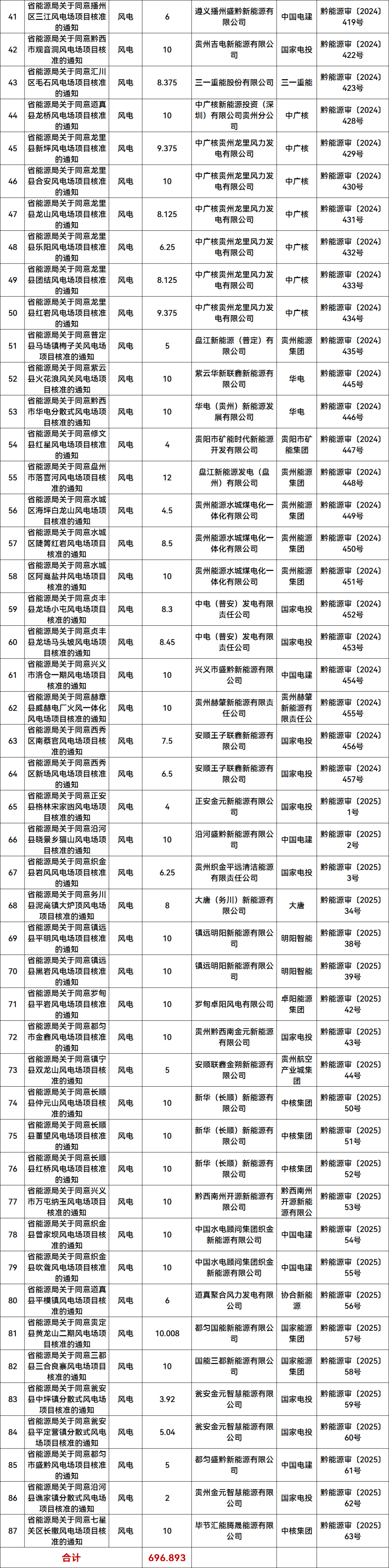 项目清单显示,贵州省能源局2024年12月-2025年4月核准备案风电、光伏发电项目94个,规模共计796.893万千瓦。其中光伏项目7个,规模合计100万千瓦;风电项目87个,规模合计为696.89万千瓦。