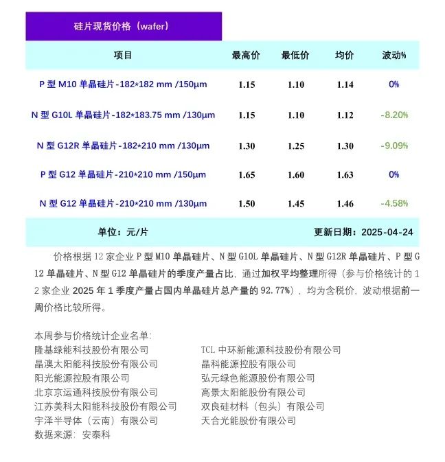 4月24日,硅业分会公布当周单晶硅片价格。其中N型G10L单晶硅片(182*183.75mm/130μm/256mm)成交均价在1.12元/片,周环比跌幅8.20%;N型G12R单晶硅片(182*210mm/130μm)成交均价在1.30元/片,周环比跌幅9.09%;P型G12单晶硅片(210*210mm/150um)成交均价在1.63元/片,周环比持平;N型G12单晶硅片(210*210 mm/150μm)成交均价在1.46元/片,周环比跌幅4.58%。