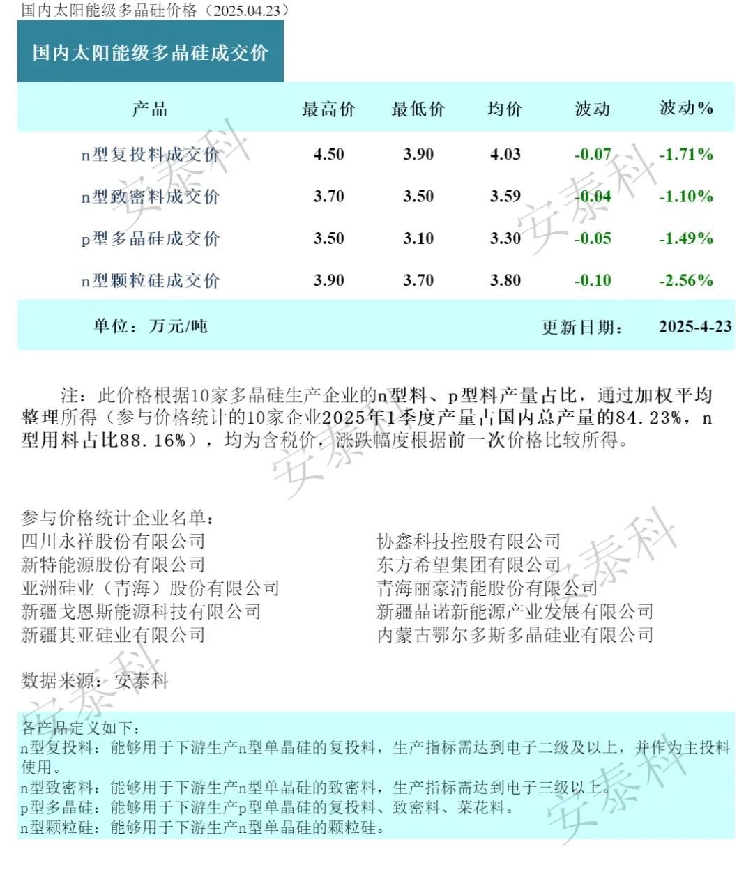 获悉,4月30日,硅业分会公布本周硅料价格。
