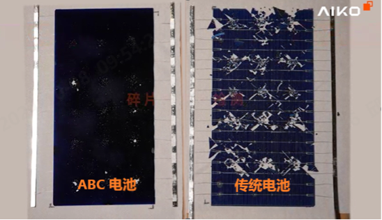 以下简单介绍ABC产品优势,其中之一是ABC电池显著的抗隐裂优势。下图展示了在电池片撞击测试实验中、ABC电池由于机械强度高而碎裂风险低于传统电池的效果。
