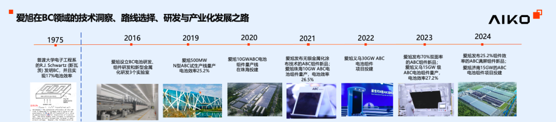 从P型到N型,很多同行选择了进步空间相对较小、技术难度相对较低的Topcon和HJT作为产品研发和更新换代的努力方向。爱旭在对太阳电池技术现状及其中长期发展趋势认真洞察和谨慎分析的基础上,选定技术难度高、挑战大、但进步空间更大的BC作为我们从P型PERC电池向下一代电池技术演进的方向,期望能够跳过中间一些过渡型技术路线的选择,取得更进一步的产品技术领先。因此我们在2016年分别设立了BC电池研发、组件研发和新型金属化研发3个实验室,专注于BC产品技术领域的各项研发工作,其中重点是隧穿氧化层多晶硅钝化的全背接触,我们把这个产品命名为ABC(即 All Back Contact),把这个产品技术作为产业化的主攻方向。在随后的几年中分别建成BC电池及组件的中试和量产线,首次实现了BC技术的大规模产业化。其中的几个里程碑事件分别是:2021年6月发布无银金属化技术的ABC产品;同年10GW级无银金属化ABC电池、组件实现量产,电池效率达到26.5%;2023年12月发布70%及以上双面率的ABC产品;同年15GW 级的高双面率ABC组件实现量产,电池效率达到27.2%;2024年6月发布25.2%组件效率的ABC满屏组件产品,15GW的满屏ABC电池组件项目开始投建。