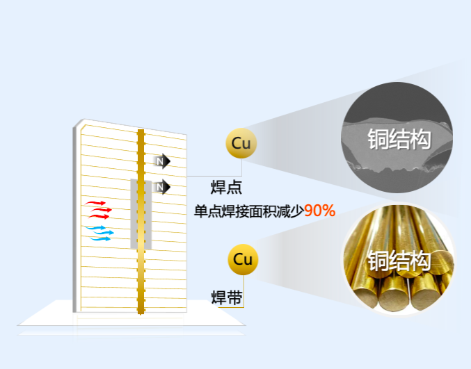 当前组件环节的关键技术,首先是0BB串焊。0BB串焊接通常会因铜焊带与银细栅线之间的熔合或粘合质量差而造成不良。虚焊和过焊的比例很高,导致组件的可靠性和安全性出问题。基于无银金属化的专有技术,爱旭成功地解决了这一挑战。铜焊带和铜细栅的合金化质量非常好,几乎没有虚焊和过焊问题的存在,组件输出功率和可靠性得到了充分保障。