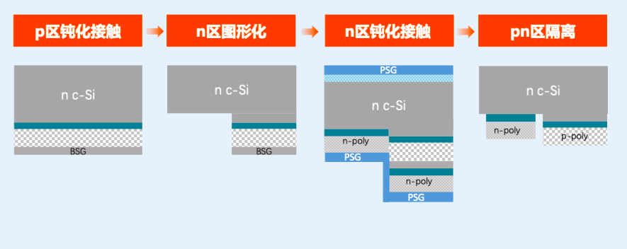 电池环节,在过去,BC电池制备基本上都是采用一步法来同时制备p、n区的隧穿氧化层、甚至包括多晶硅层。例如,先制备统一的隧穿层和多晶硅前驱体层,然后在需要制备p区和n区的上面分别沉积磷硅玻璃层和硼硅玻璃层,然后再通过统一的高温退火实现p区和n区多晶硅的掺杂。这种方案的显著缺点是无法满足p、n区对隧穿层实际上的不同要求,p、n区的钝化接触性能只能折中考虑;爱旭发展的两步法制备钝化接触膜层的技术路径,不仅消除了p区更高温制备对n区的不利影响,而且更重要的是实现了p、n区隧穿层和掺杂层的分别制备,方便实现p、n区各自的钝化接触的最优化。