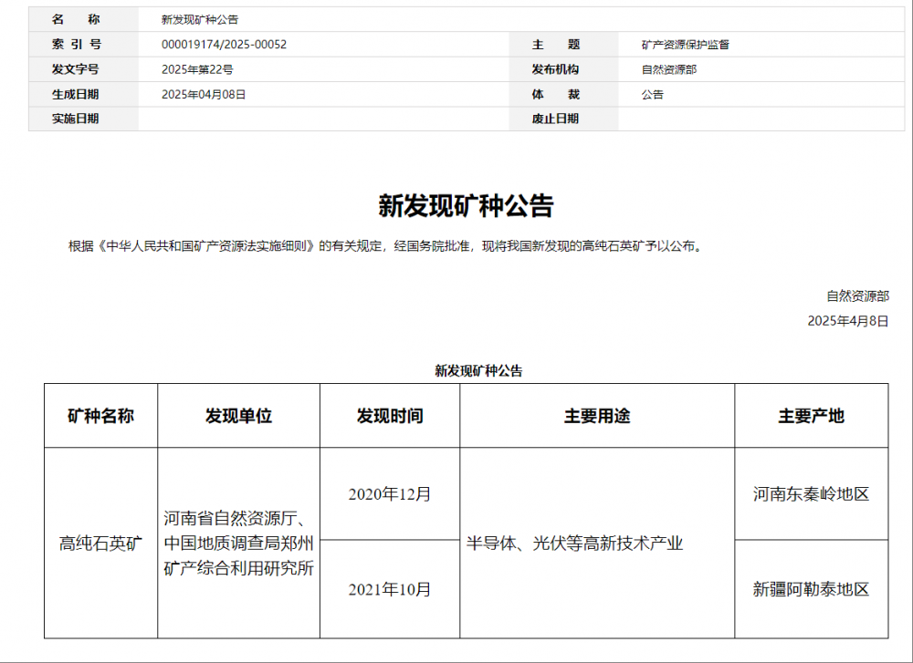 2025年4月10日,中国自然资源部一纸公告,将高纯石英矿列为第174号新矿种。