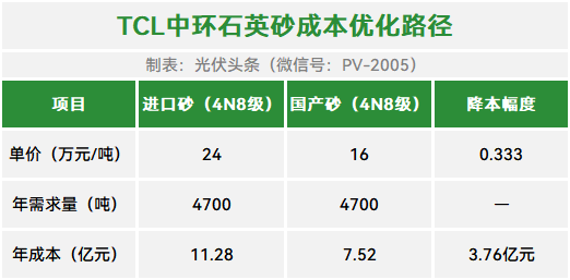 自供矿源,让硅片企业亲自当上了矿老板。以TCL中环为例,其2025年硅片产能规划达180GW,按单GW消耗26吨石英砂计算,年需求近4700吨。若全部采用进口砂,成本将超11亿元;切换国产砂后,成本直接砍掉3.3亿元——相当于每片硅片降本0.15元。