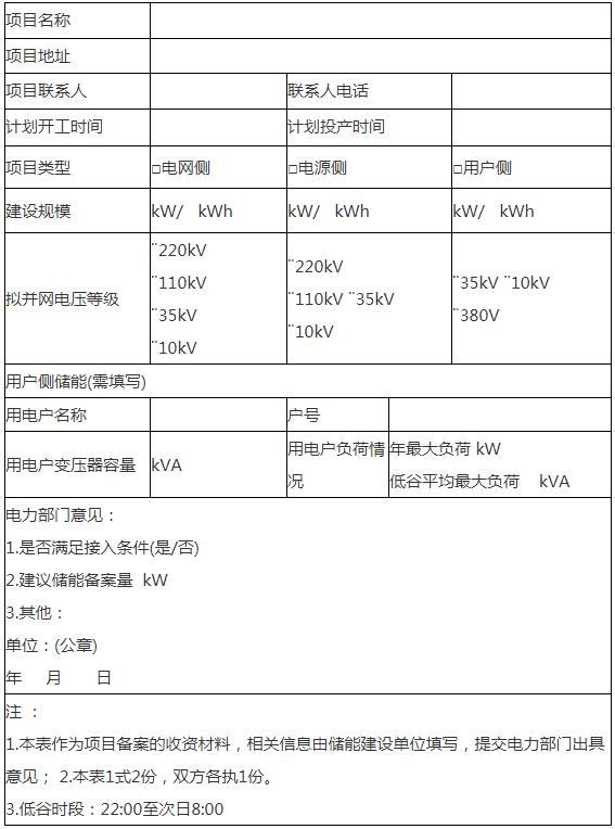 (六)新型储能项目备案内容应包括:项目建设单位基本情况,项目名称、建设地点、建设规模、建设内容(含技术线、应用场景等,并明确项目为电源侧储能、电网侧储能或用户侧储能)、开工投产时间,项目总投资额,项目安全责任(明确项目单位的安全生产主体责任,并落实项目安全监管责任),项目符合产业政策声明。新型储能项目须在备案前提供电网接入咨询意见(附件2)。