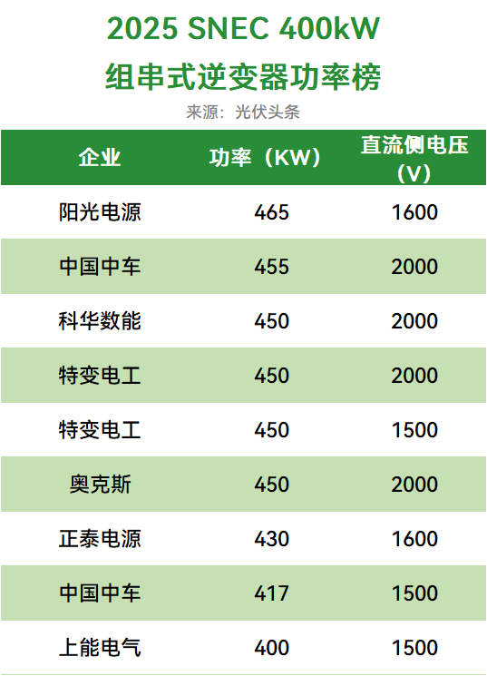 光伏头条观察,在2024年SNEC中,一众光伏逆变器龙头推出了350kW组串式逆变器。2025年,阳光电源、特变电工、中车、正泰电源等光伏逆变器龙头迅速将逆变器引入了400kW+时代。