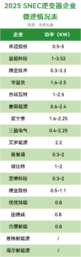 此外,光伏头条统计,思格新能源、艾罗能源、爱士惟、古瑞瓦特、固德威、华昱欣、三晶电气、优优绿能、合康新能、海尔新能源、恩易浦、储比特、艺唯科技、麦田能源、腾圣技术等15家企业均推出了微逆产品。