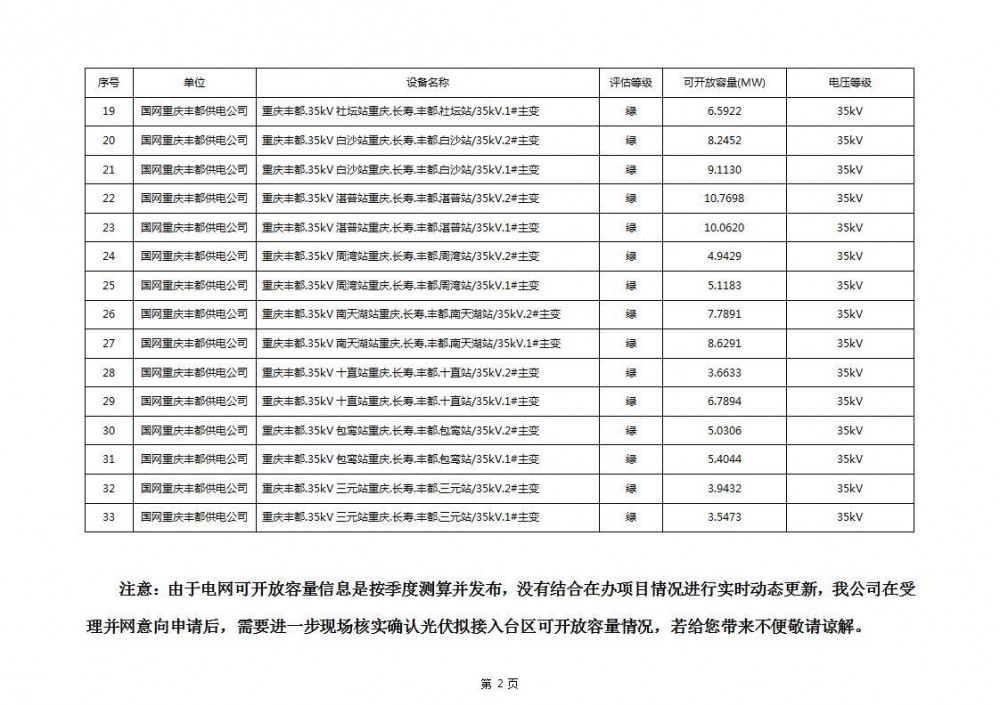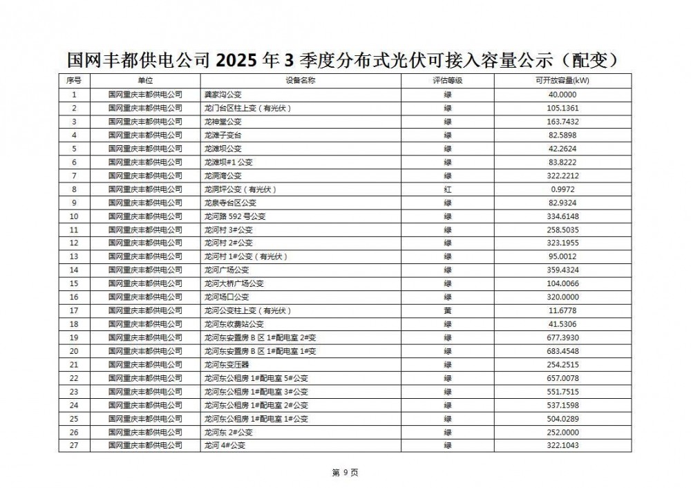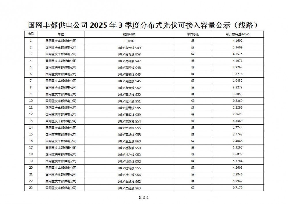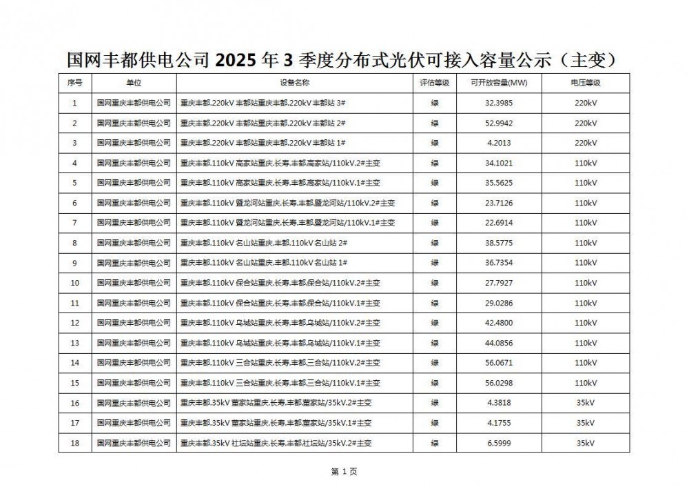 6月30日,重庆市丰都县发改局发布关于公布丰都县2025年三季度分布式光伏可开放容量信息的通知。