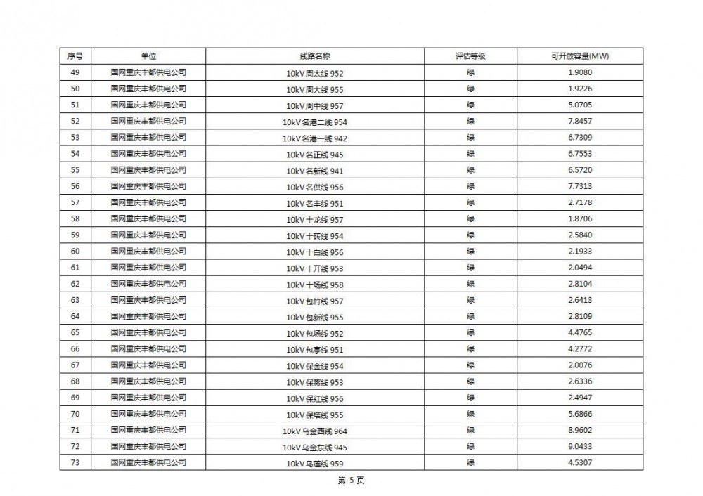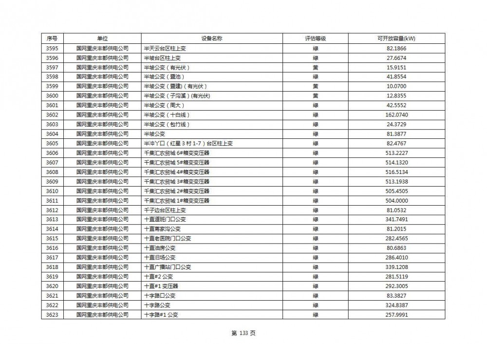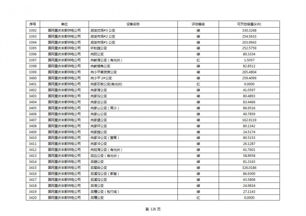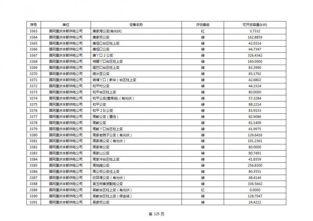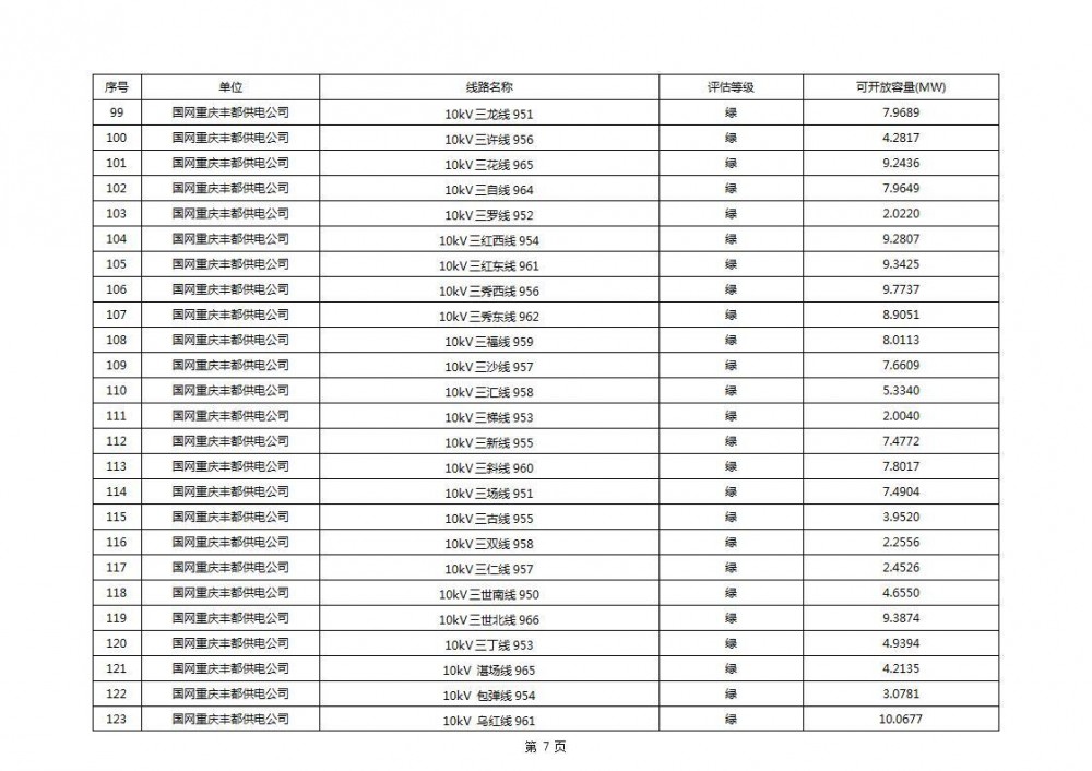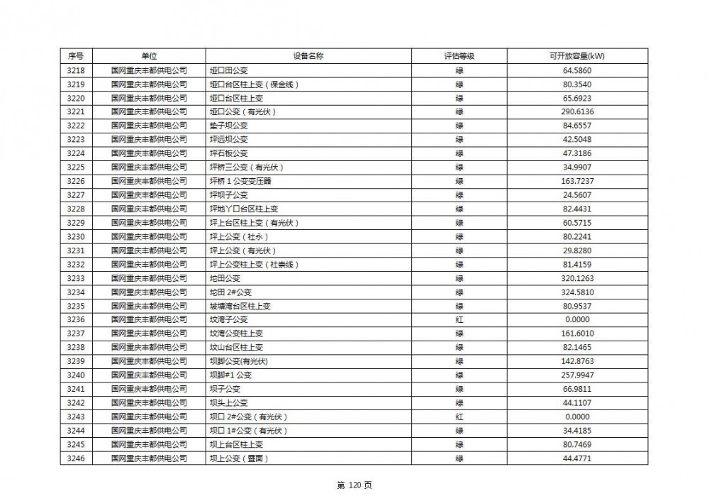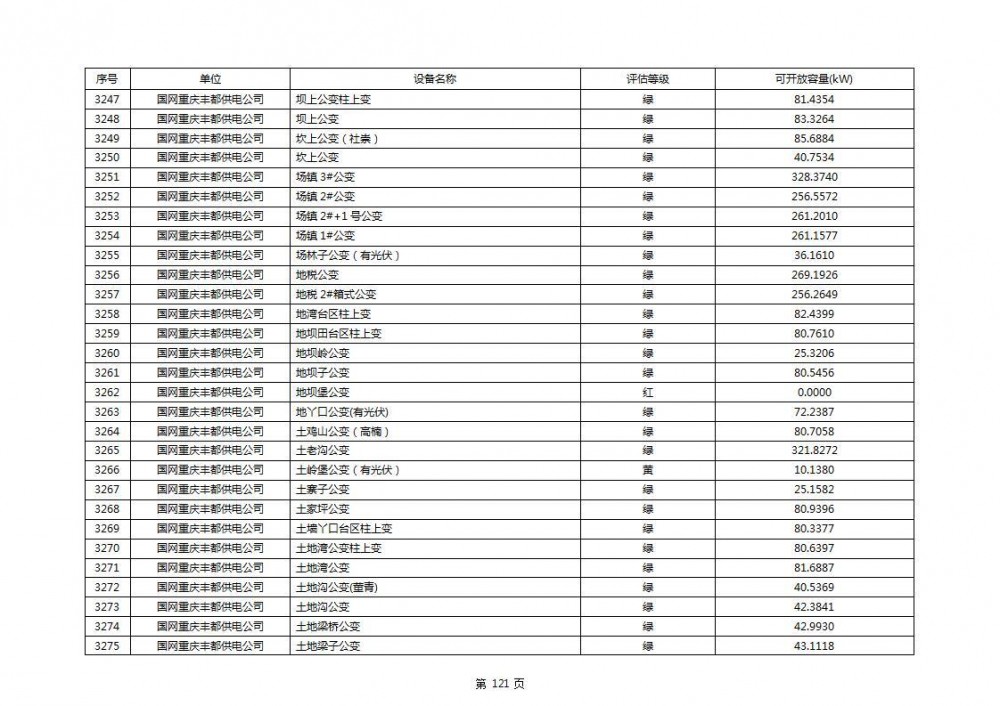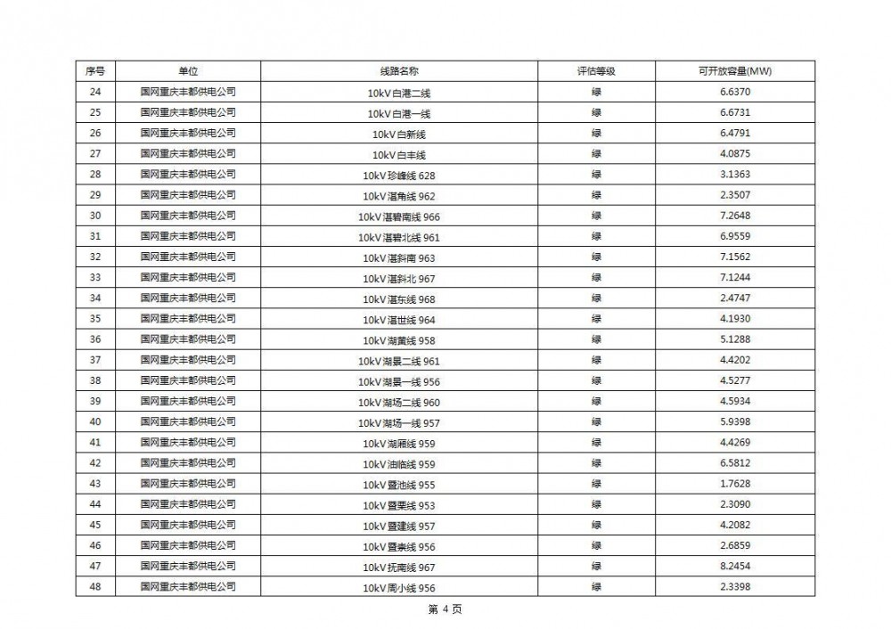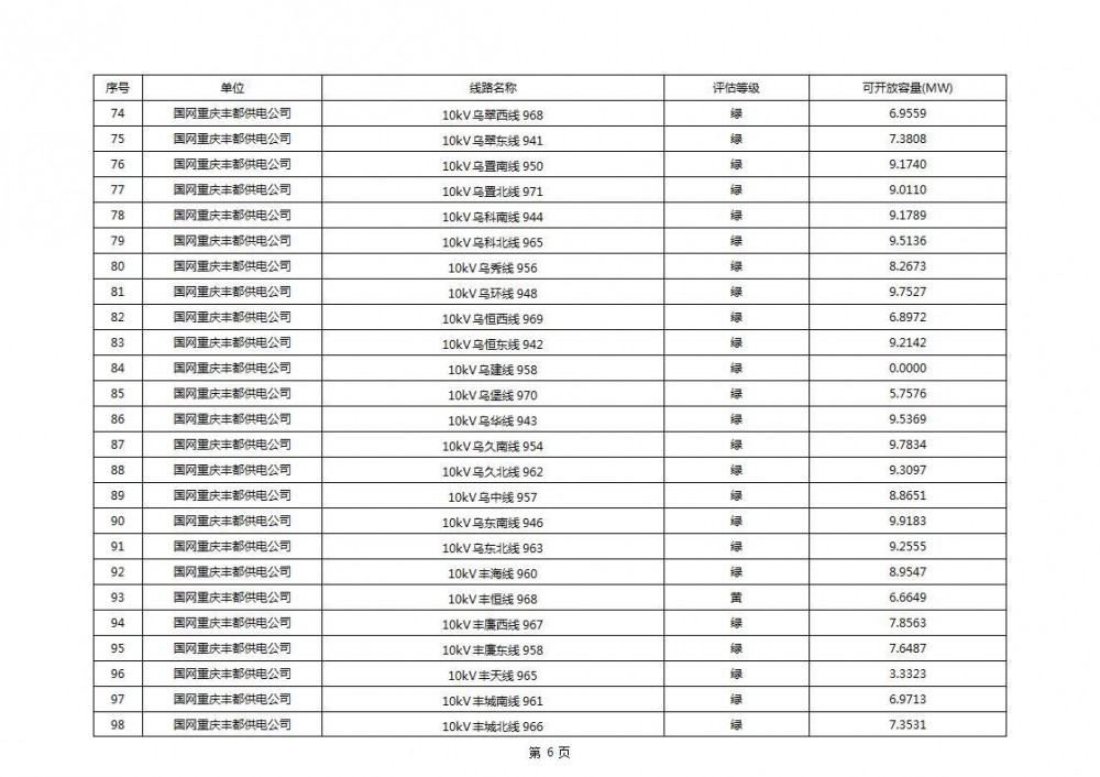 根据公示文件,丰都县10kV线路33个主变全部为绿色,可开放容量651.256MW。126个线路,仅一个黄区,其余全部为绿色,可开放容量为683.855MW。