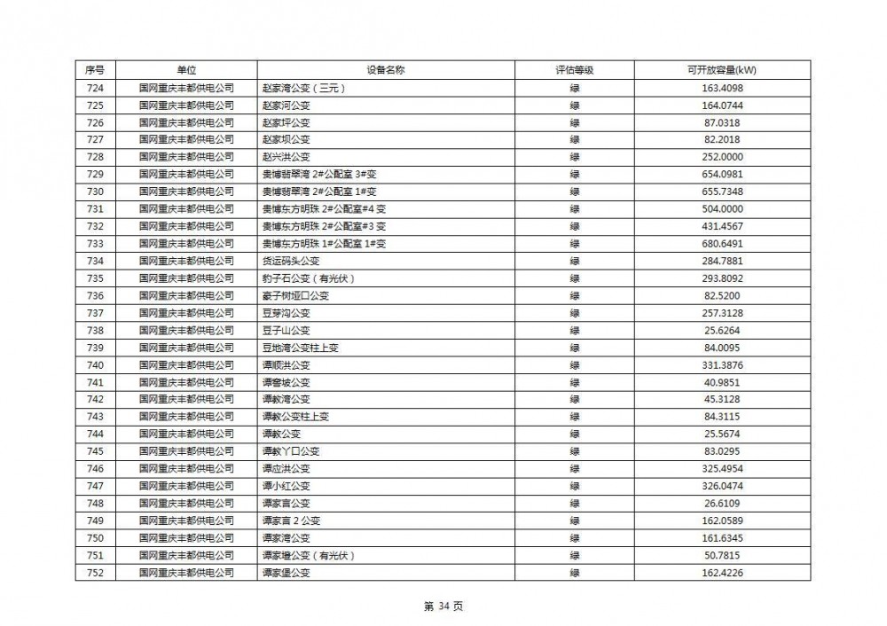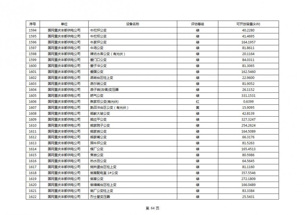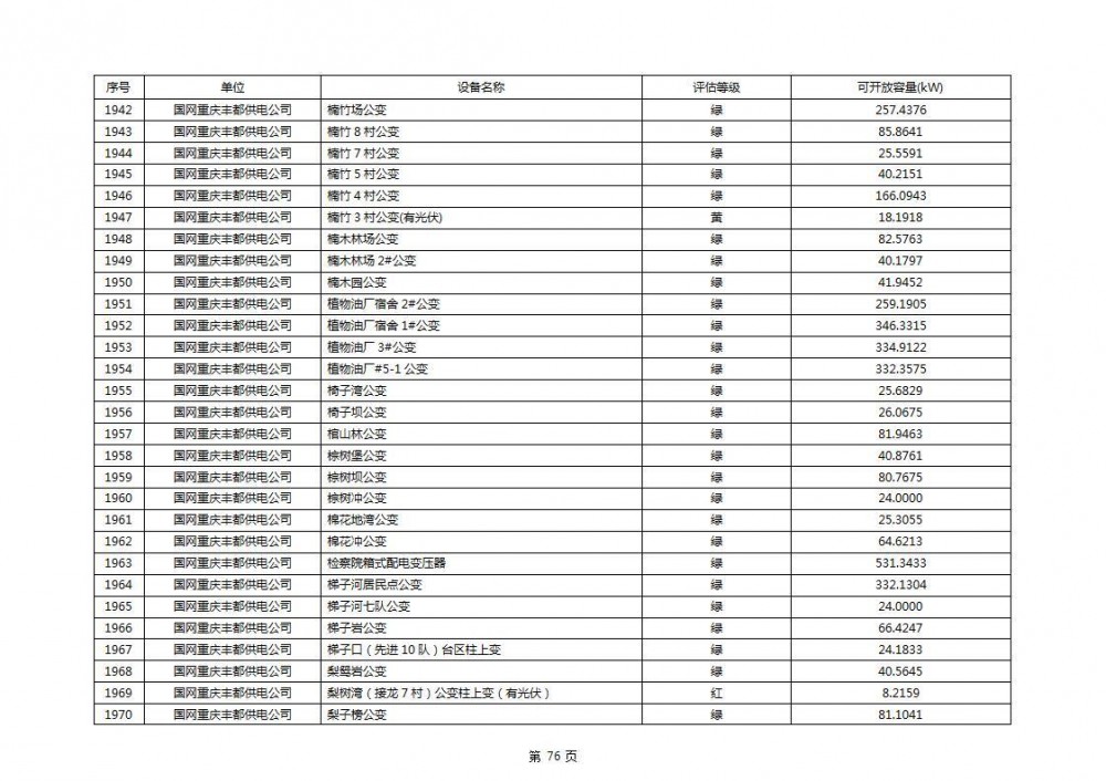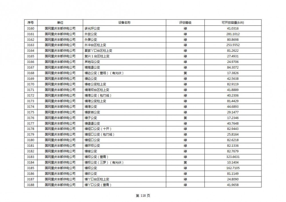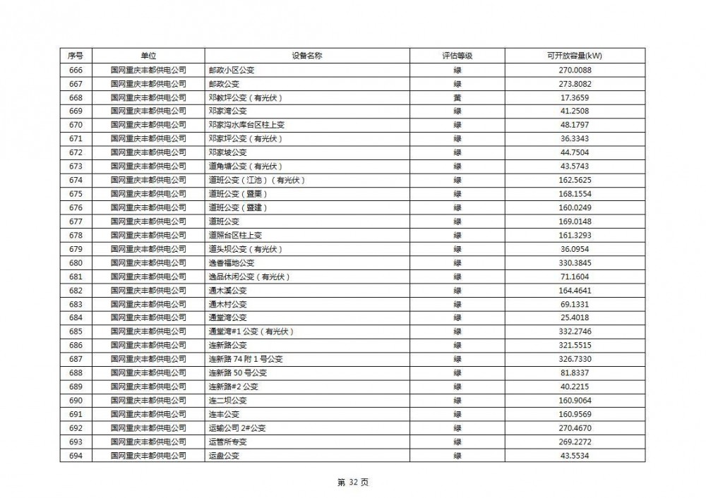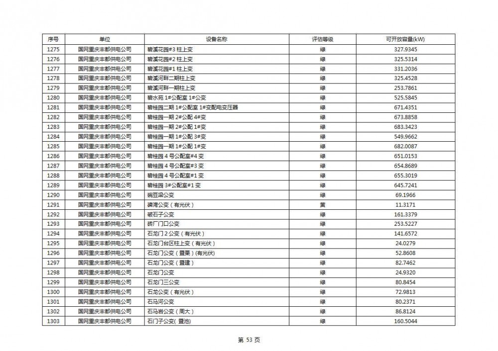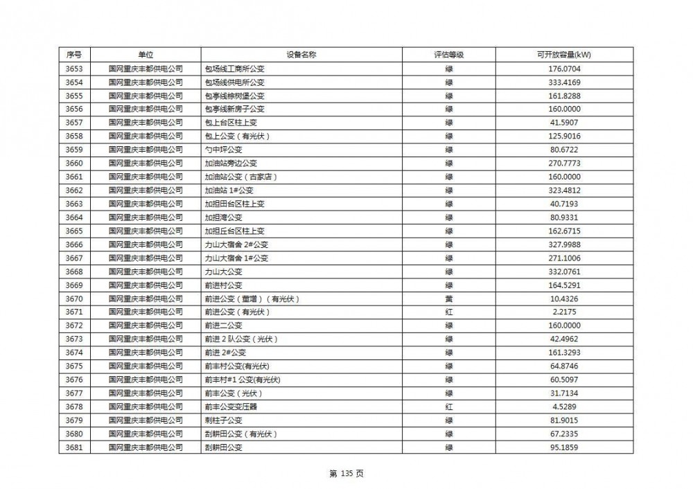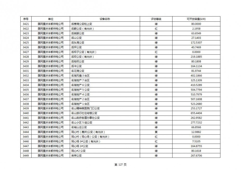 根据公示文件,丰都县10kV线路33个主变全部为绿色,可开放容量651.256MW。126个线路,仅一个黄区,其余全部为绿色,可开放容量为683.855MW。