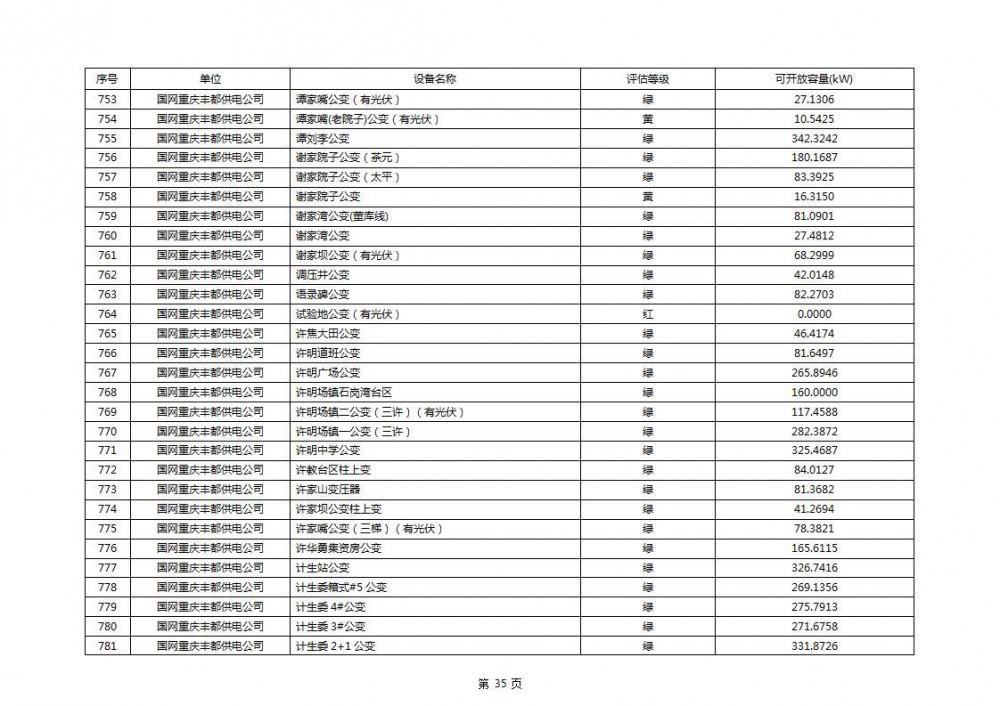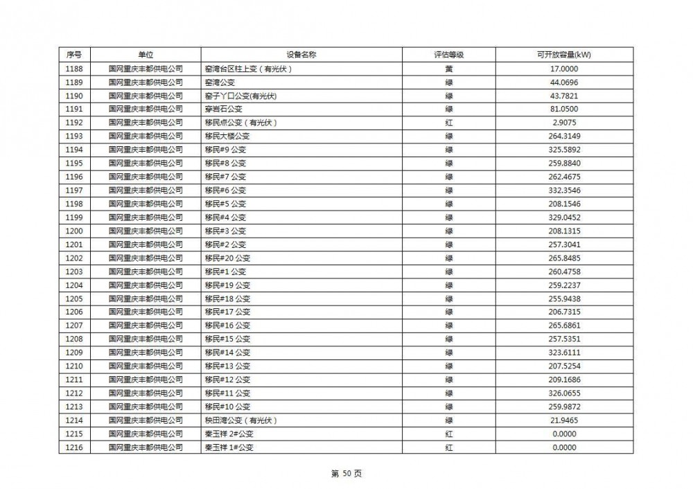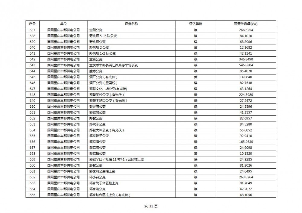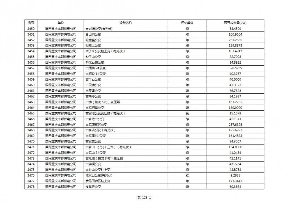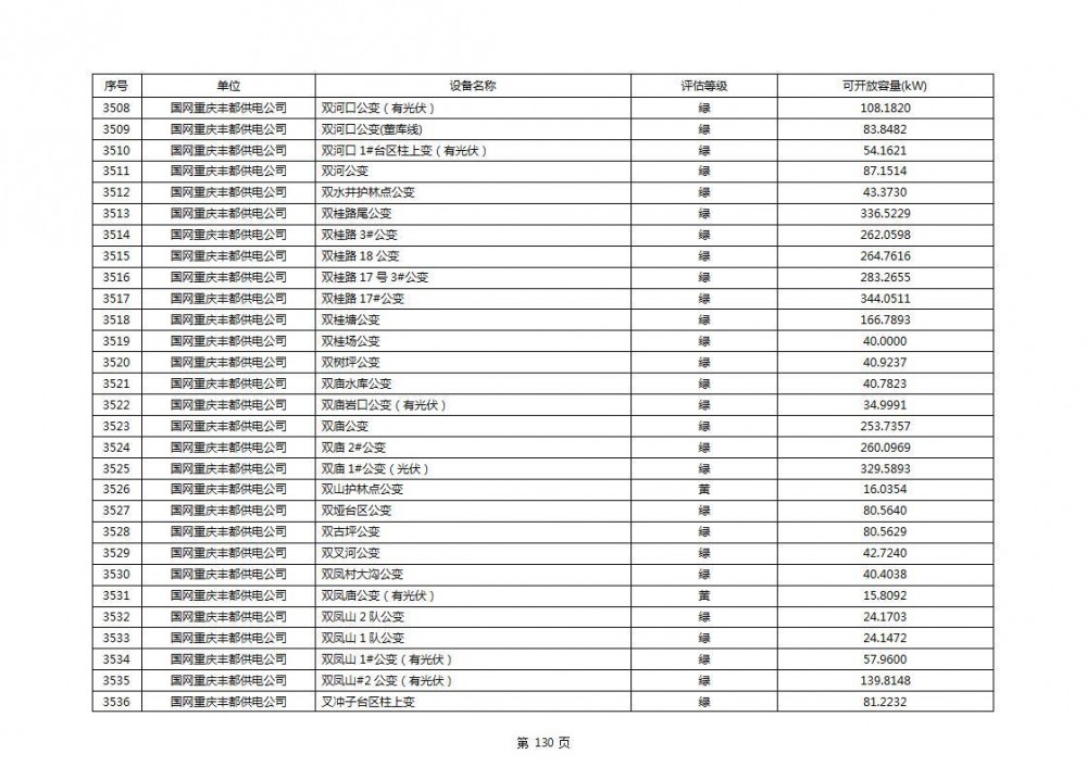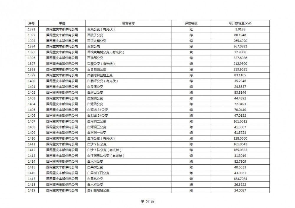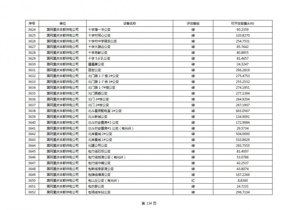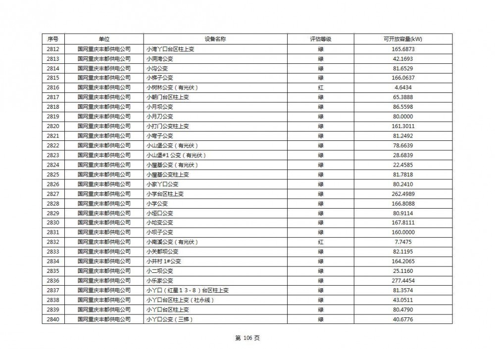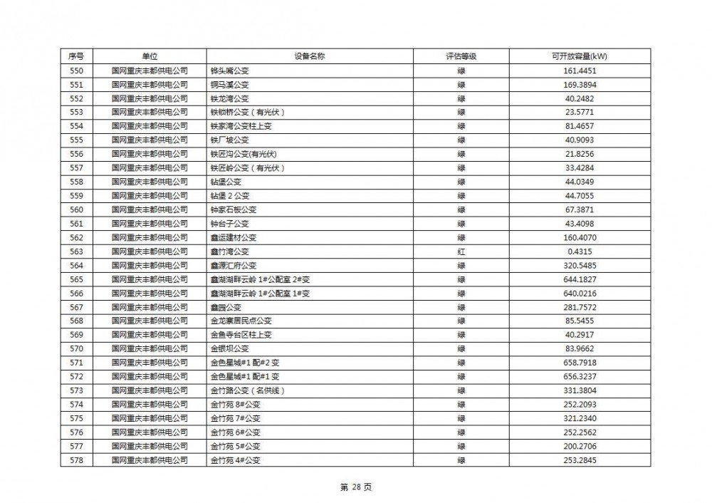 根据公示文件,丰都县10kV线路33个主变全部为绿色,可开放容量651.256MW。126个线路,仅一个黄区,其余全部为绿色,可开放容量为683.855MW。