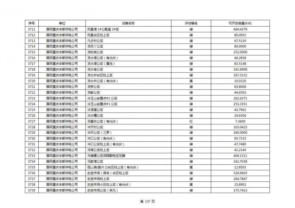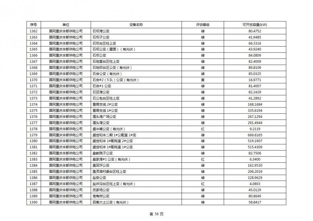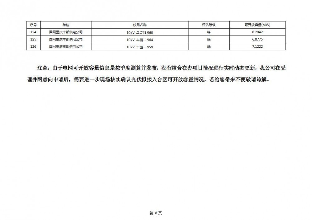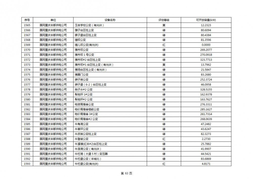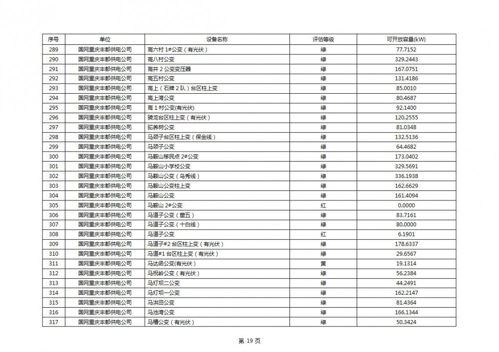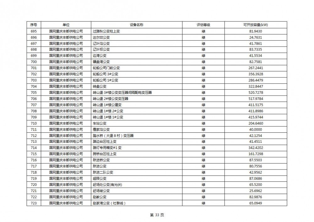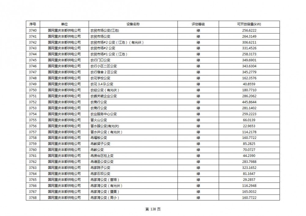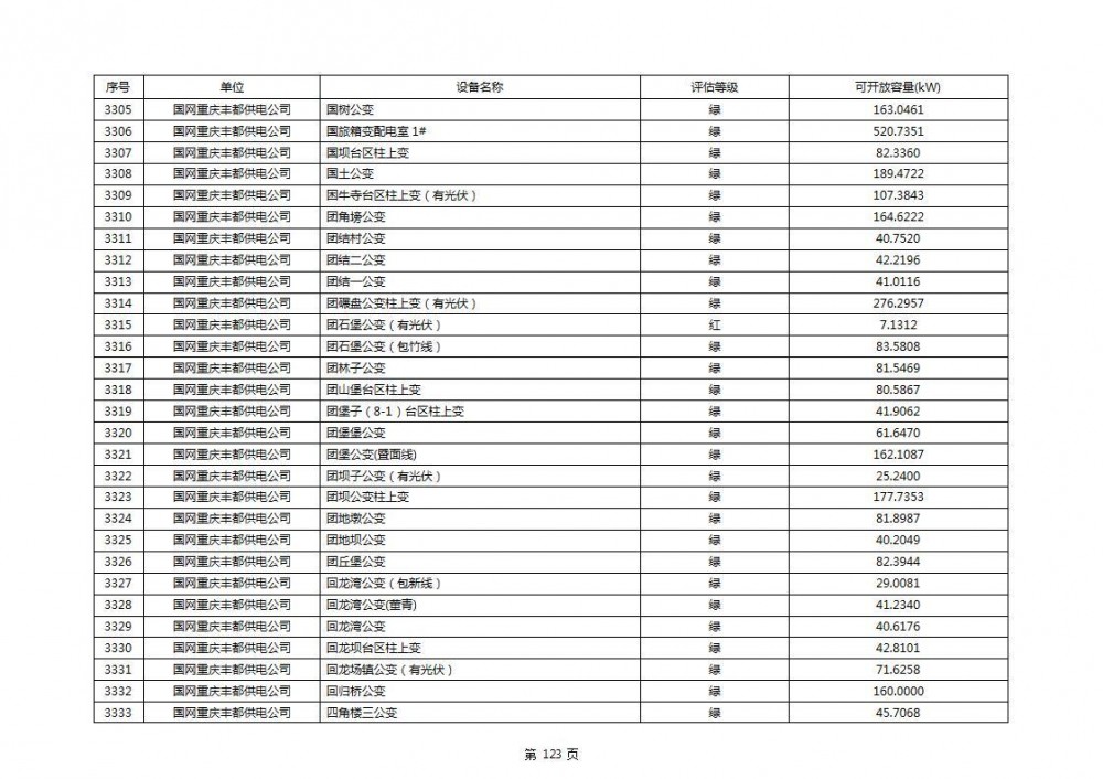 根据公示文件,丰都县10kV线路33个主变全部为绿色,可开放容量651.256MW。126个线路,仅一个黄区,其余全部为绿色,可开放容量为683.855MW。
