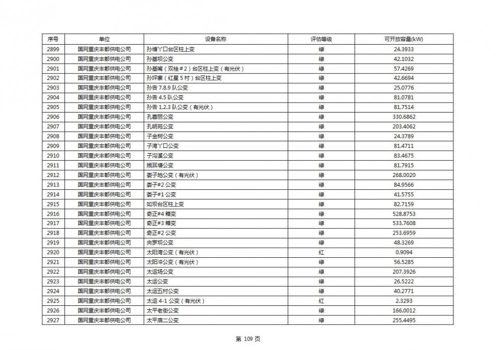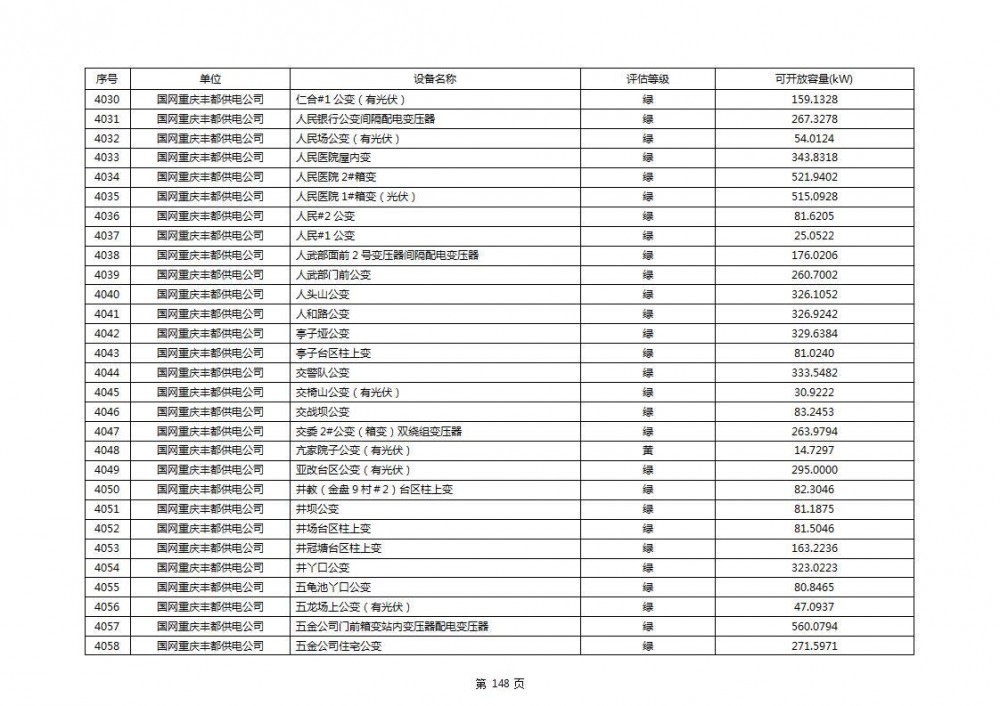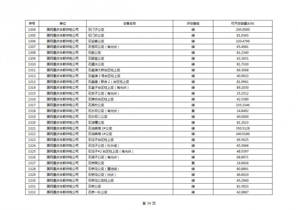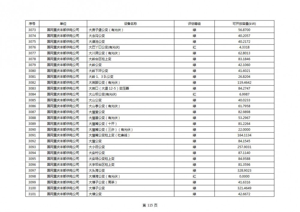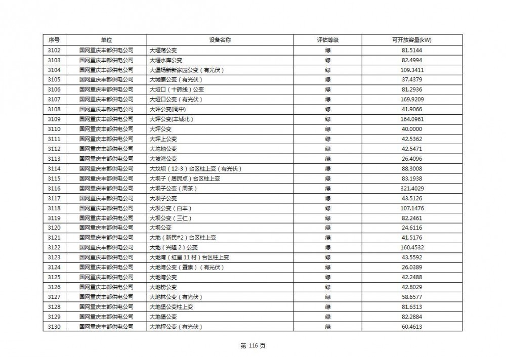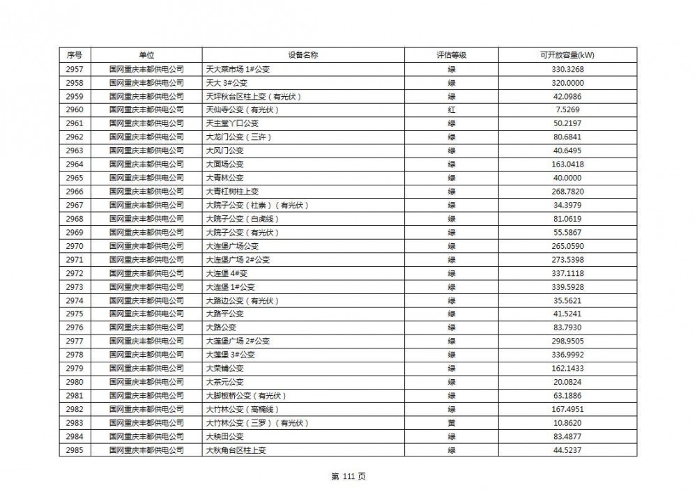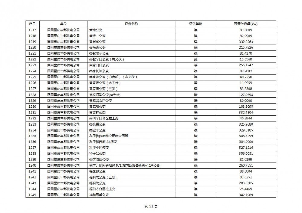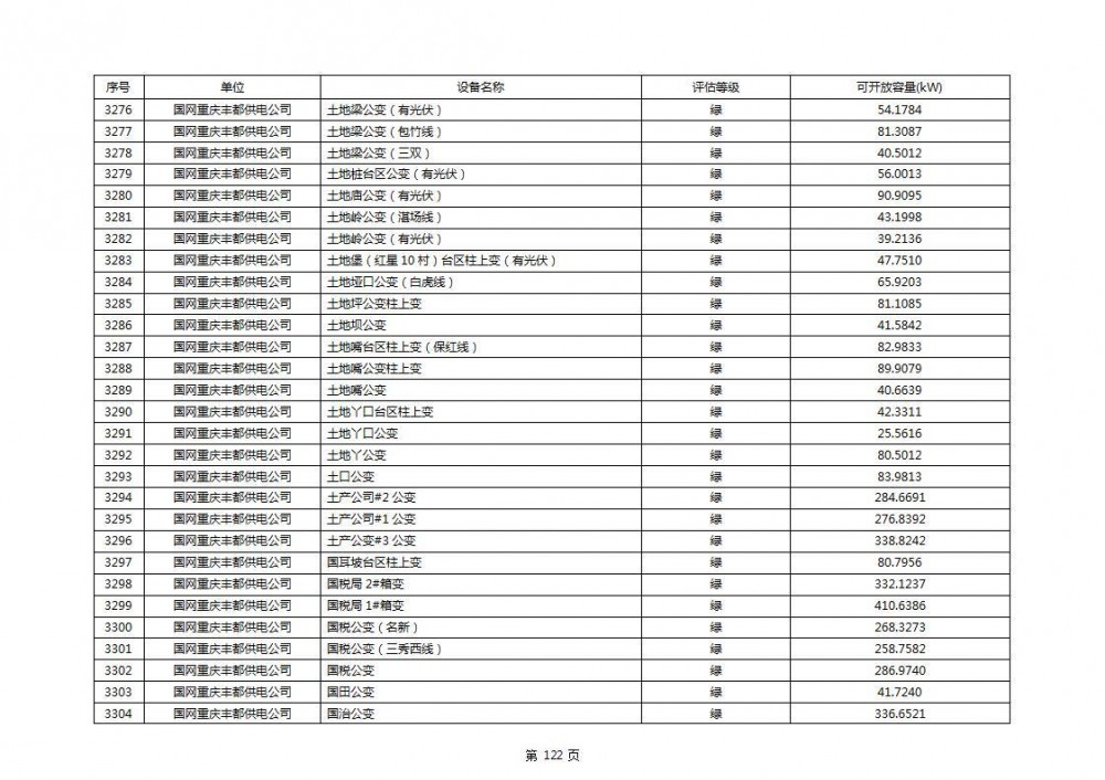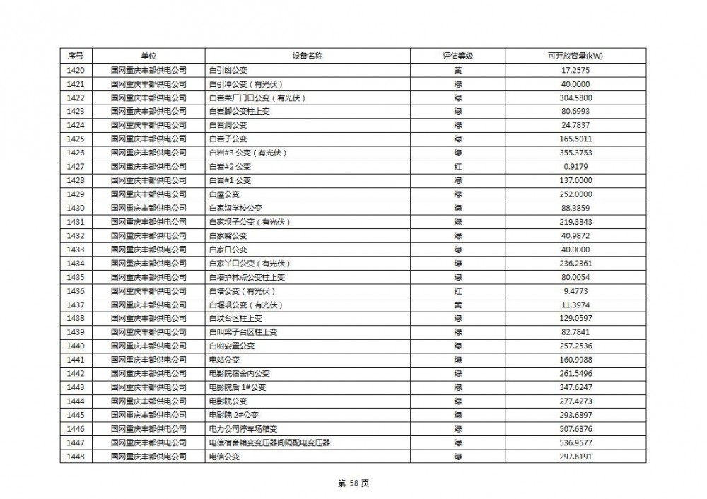 根据公示文件,丰都县10kV线路33个主变全部为绿色,可开放容量651.256MW。126个线路,仅一个黄区,其余全部为绿色,可开放容量为683.855MW。