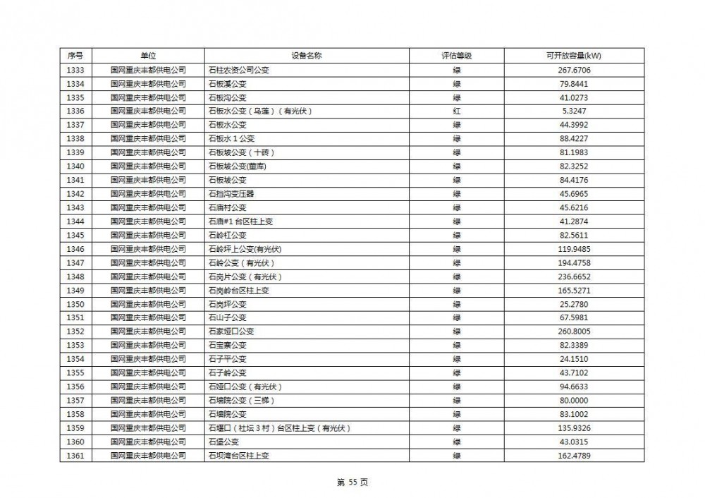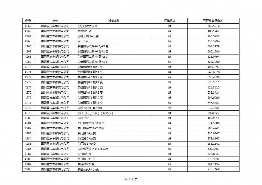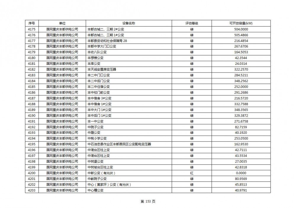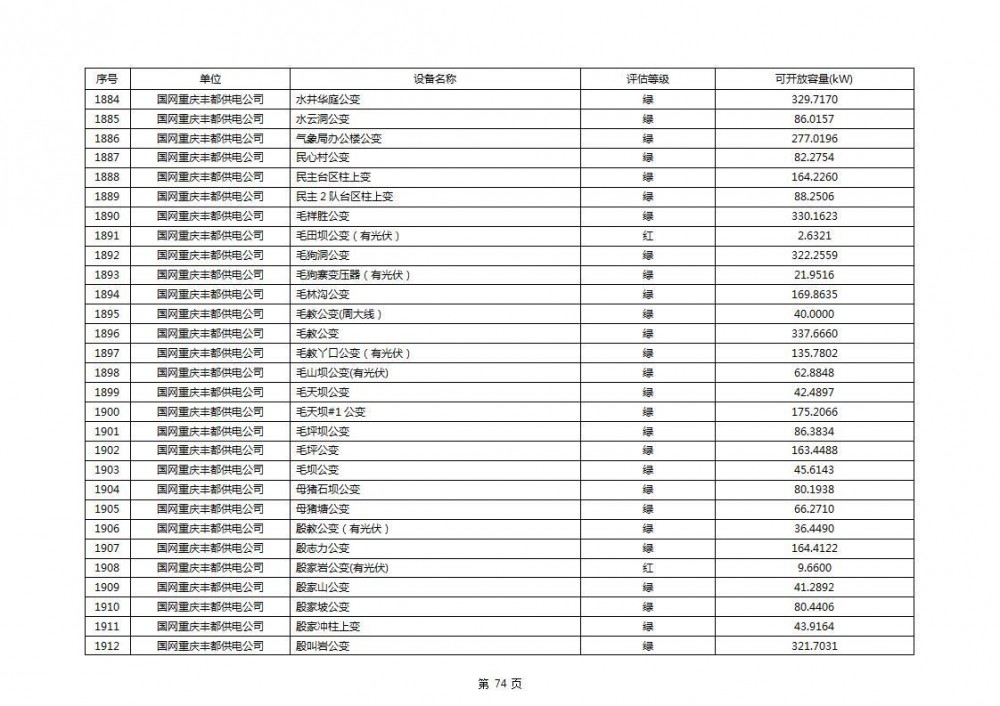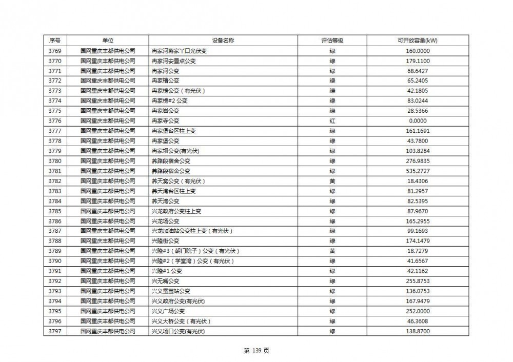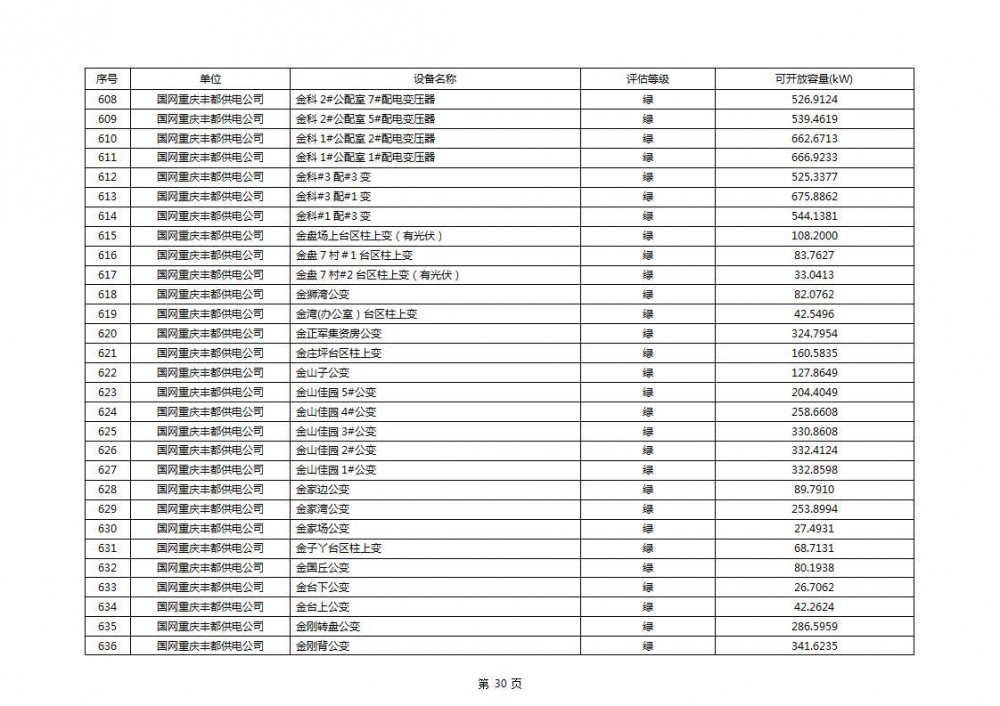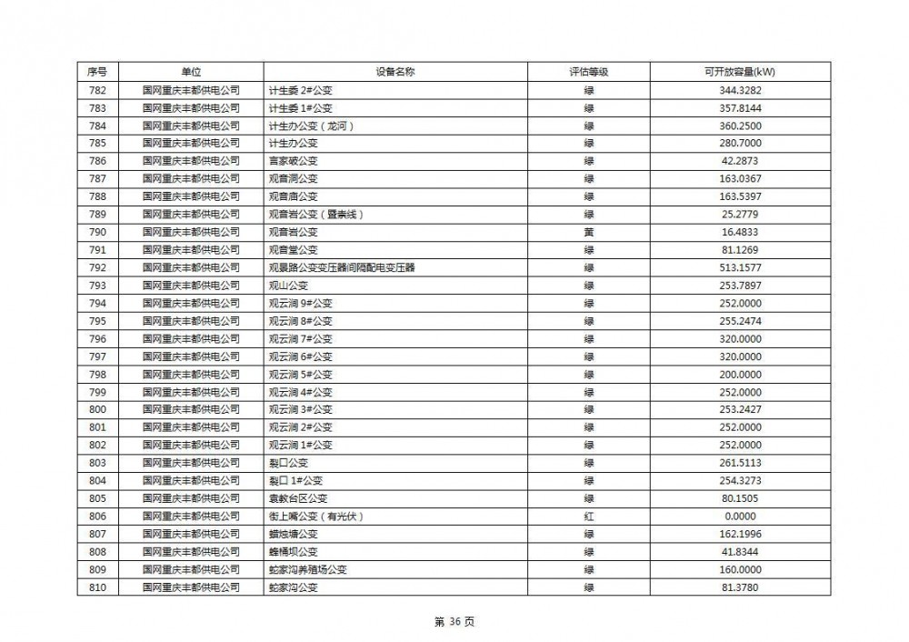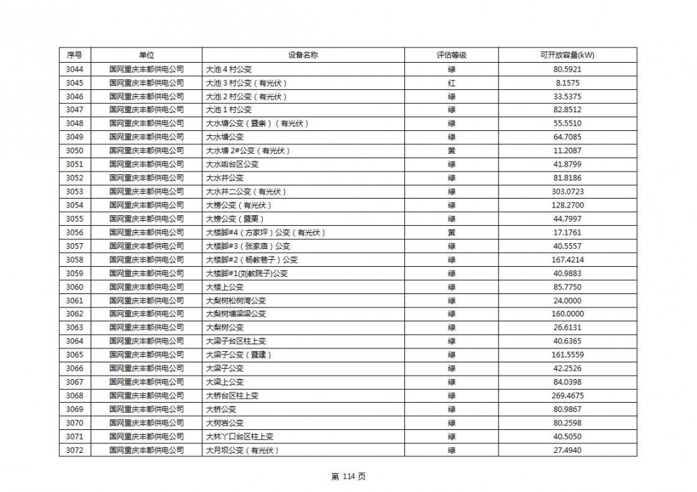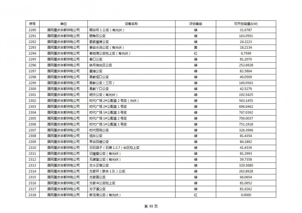 根据公示文件,丰都县10kV线路33个主变全部为绿色,可开放容量651.256MW。126个线路,仅一个黄区,其余全部为绿色,可开放容量为683.855MW。