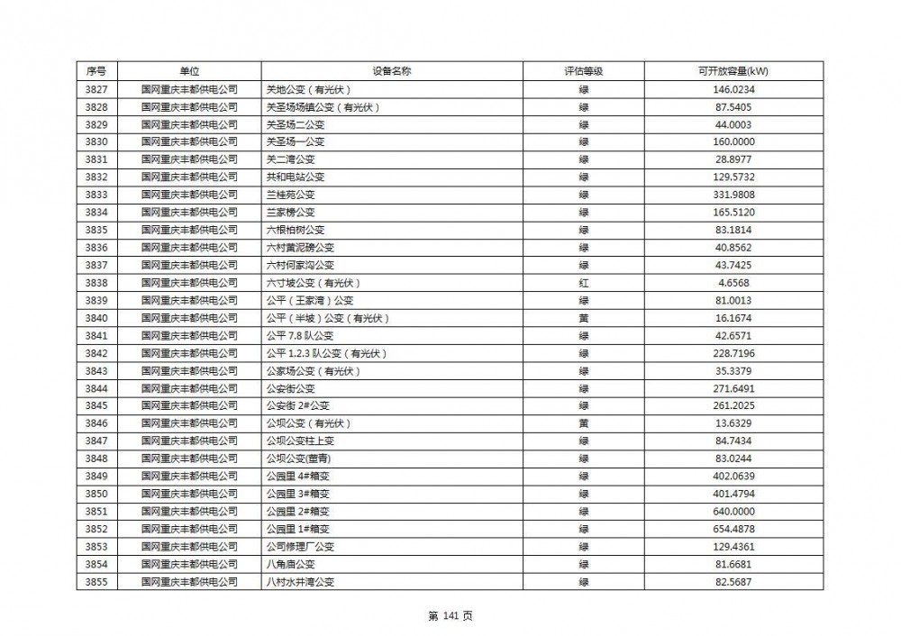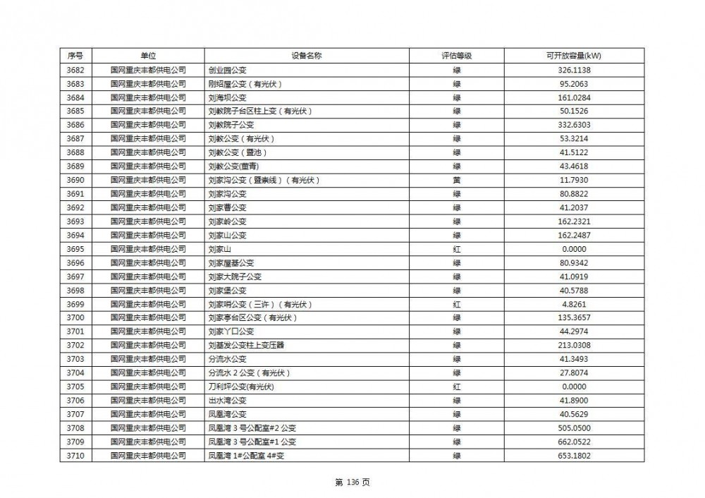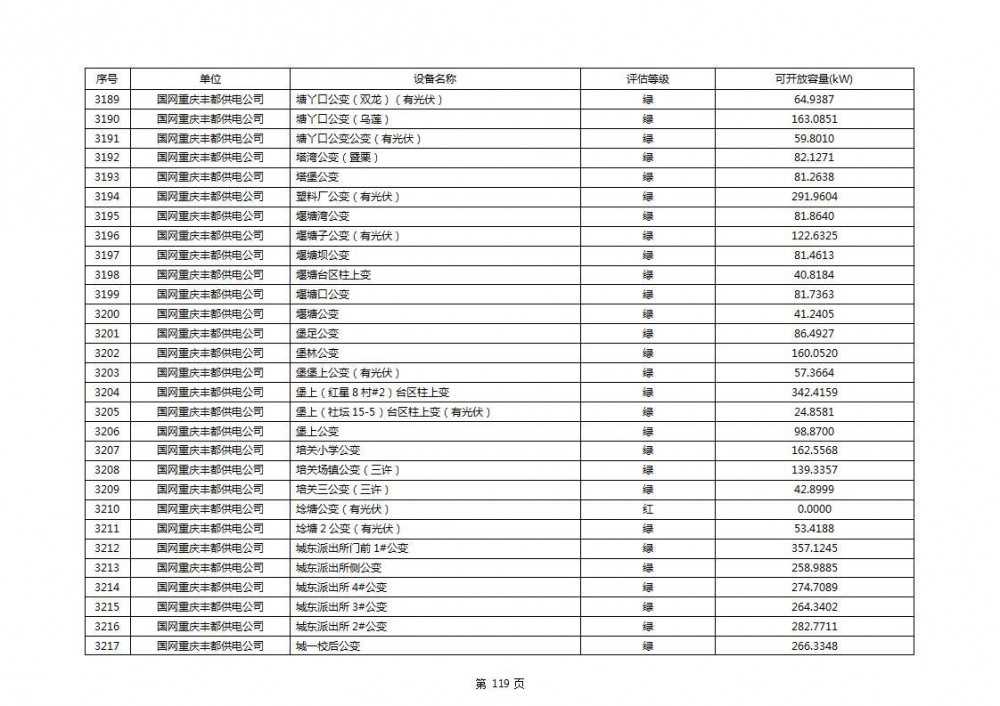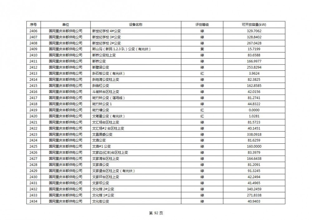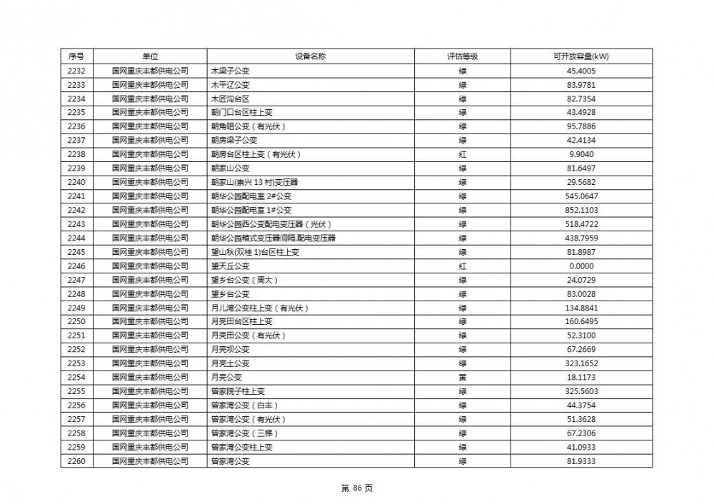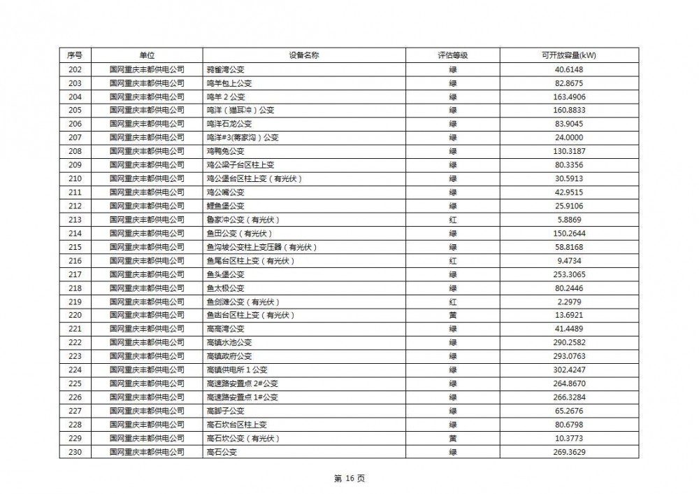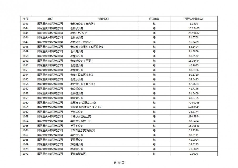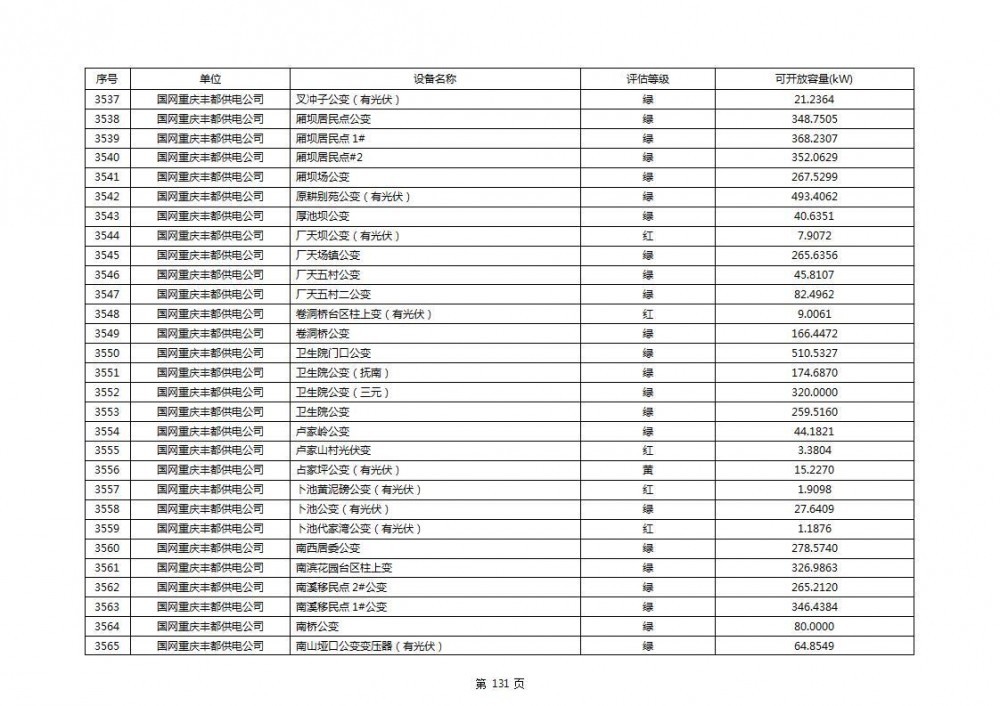 根据公示文件,丰都县10kV线路33个主变全部为绿色,可开放容量651.256MW。126个线路,仅一个黄区,其余全部为绿色,可开放容量为683.855MW。