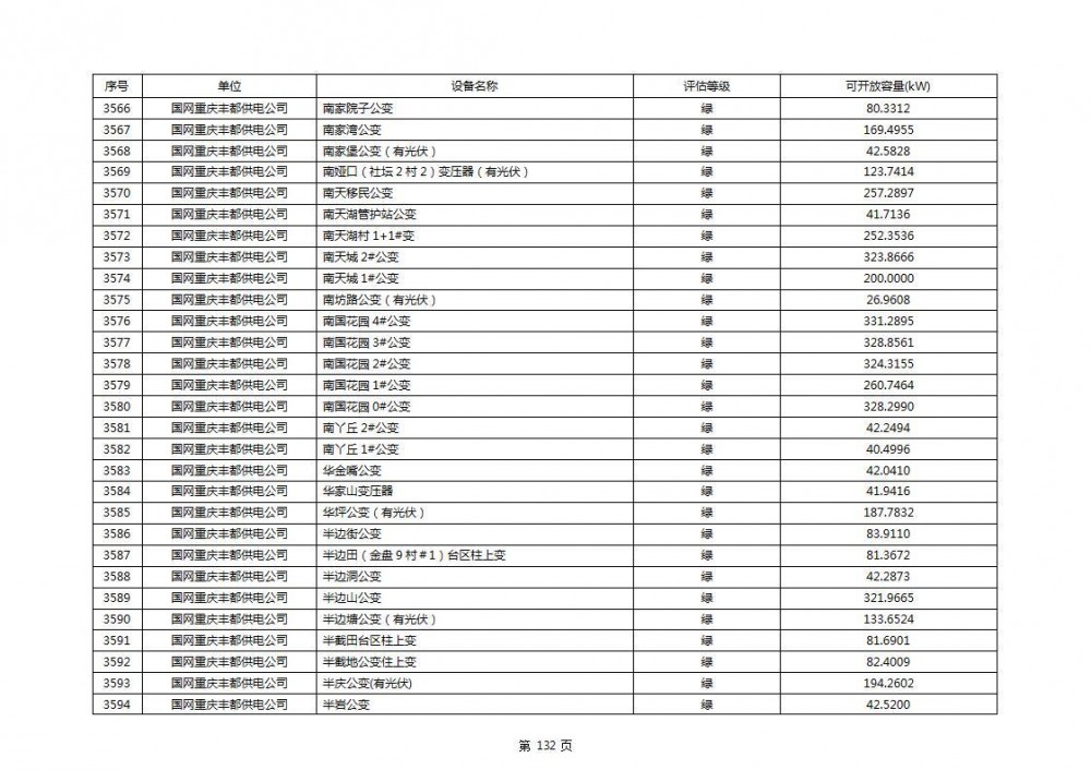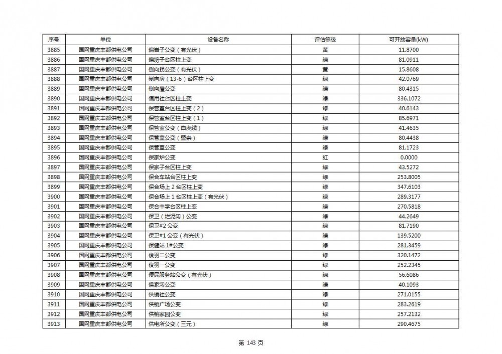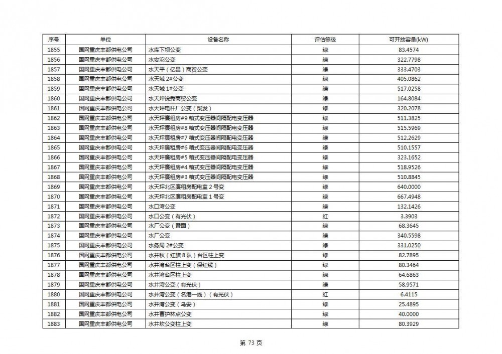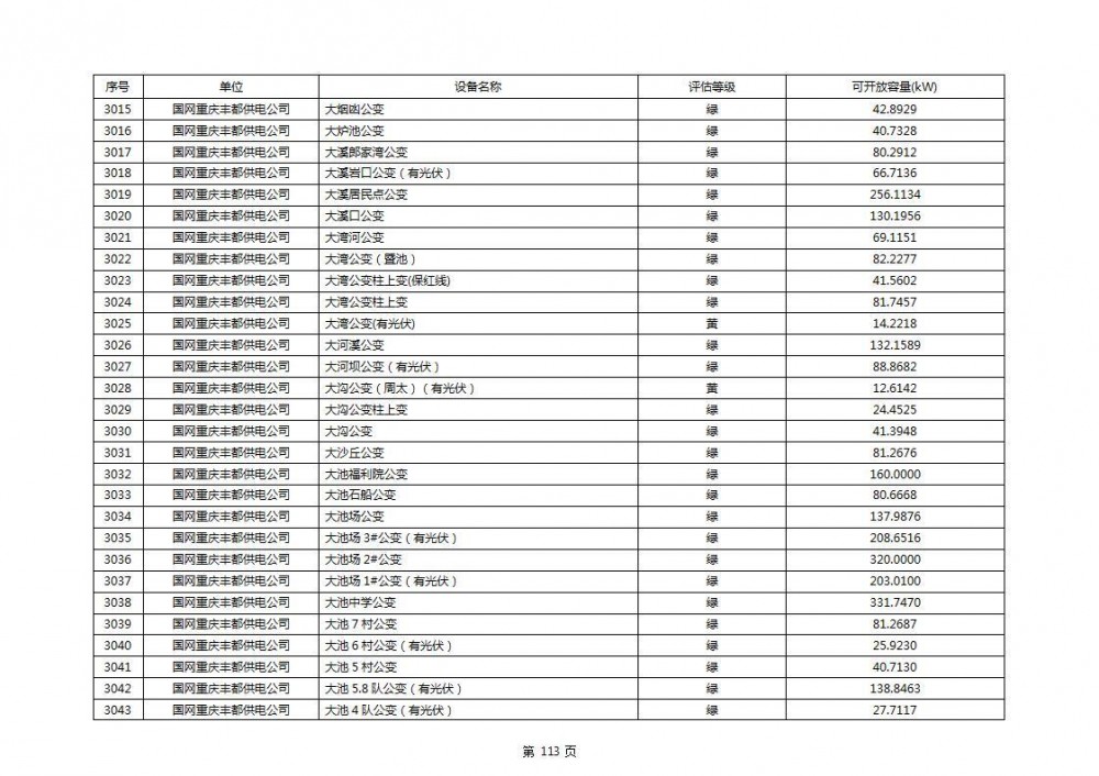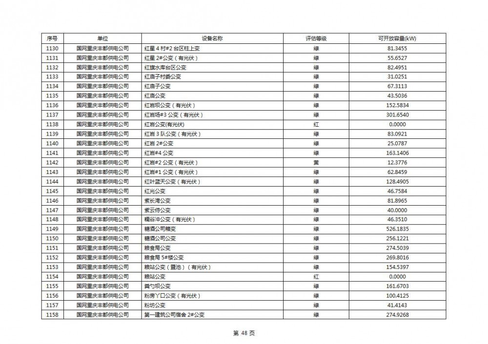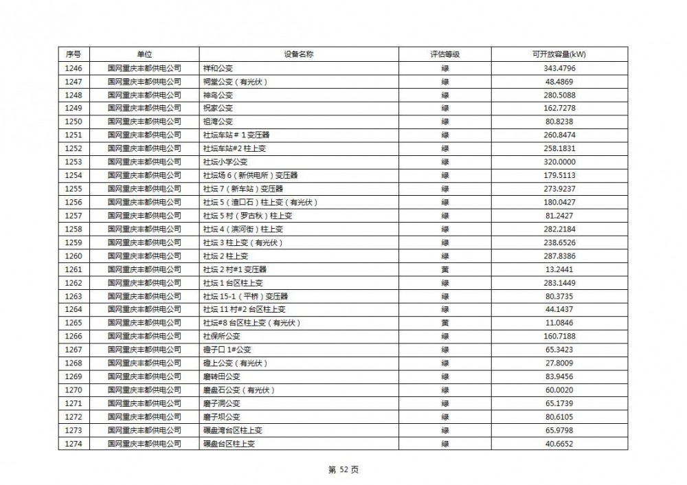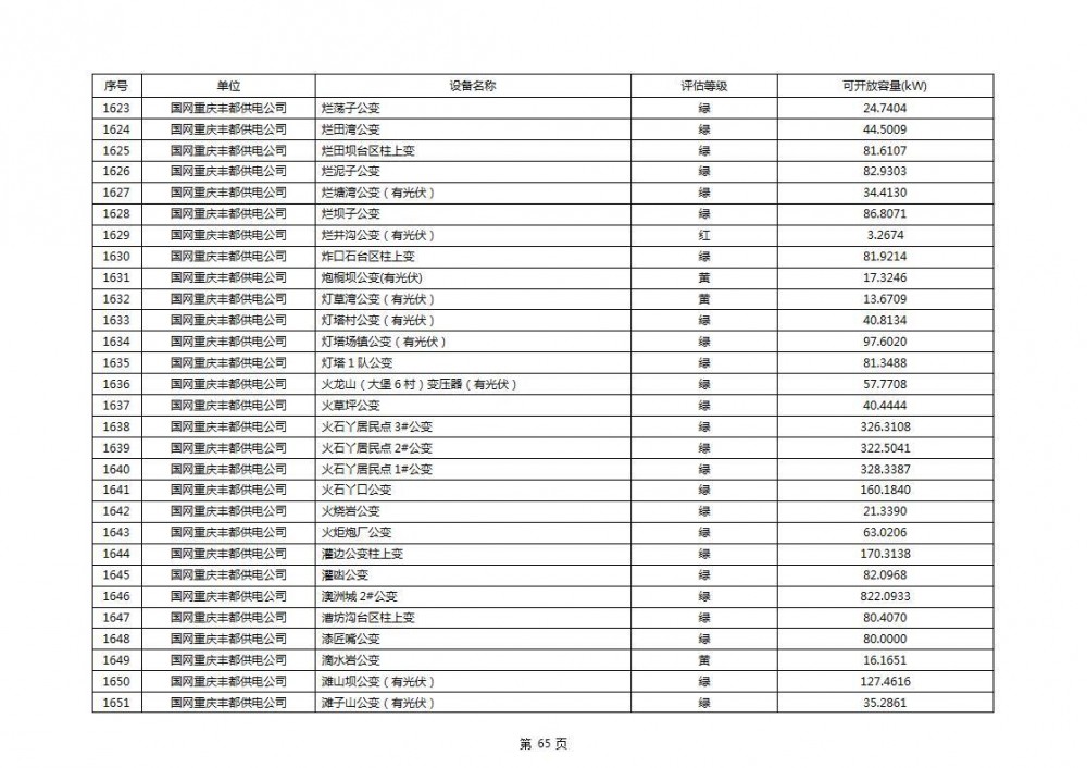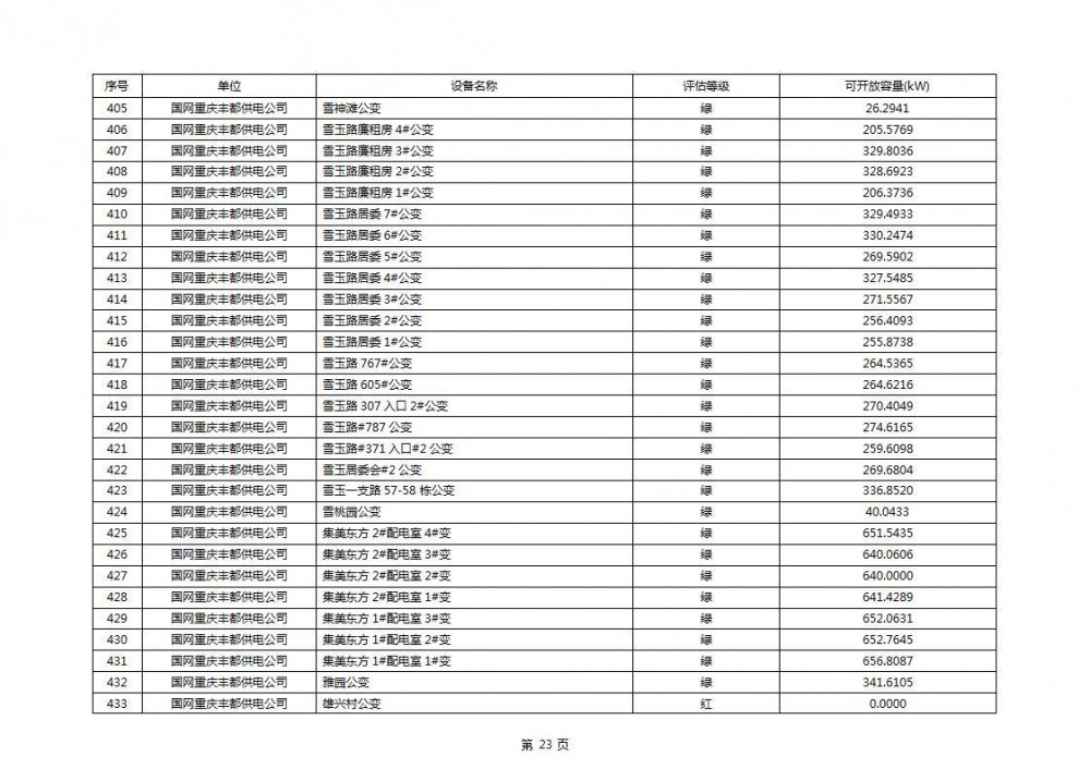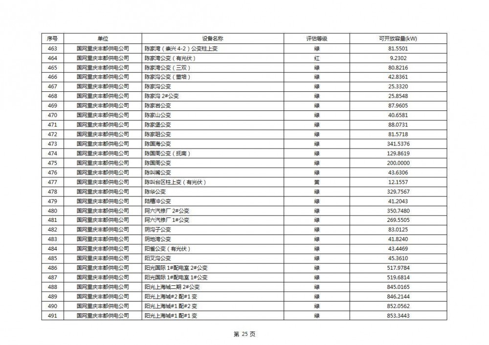 根据公示文件,丰都县10kV线路33个主变全部为绿色,可开放容量651.256MW。126个线路,仅一个黄区,其余全部为绿色,可开放容量为683.855MW。