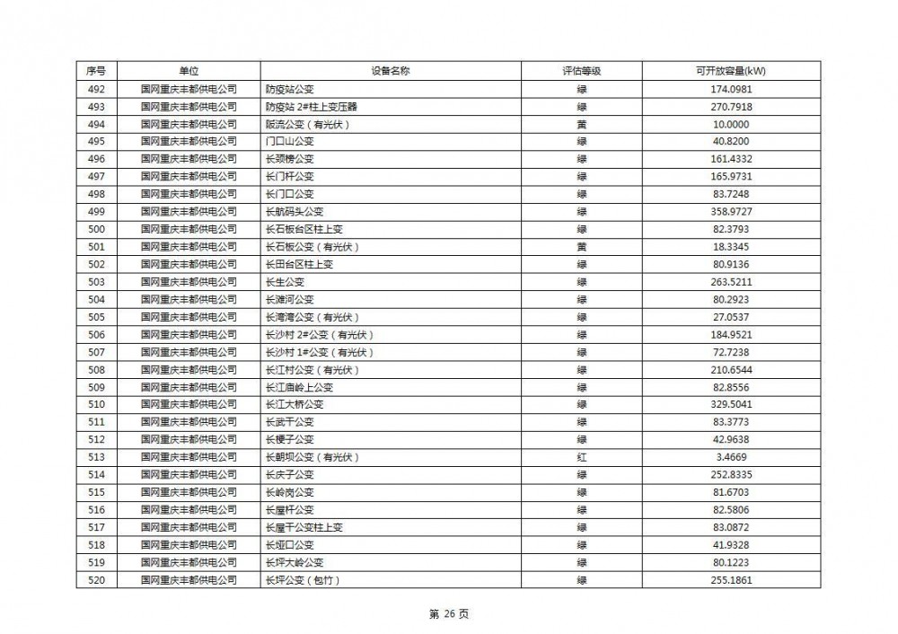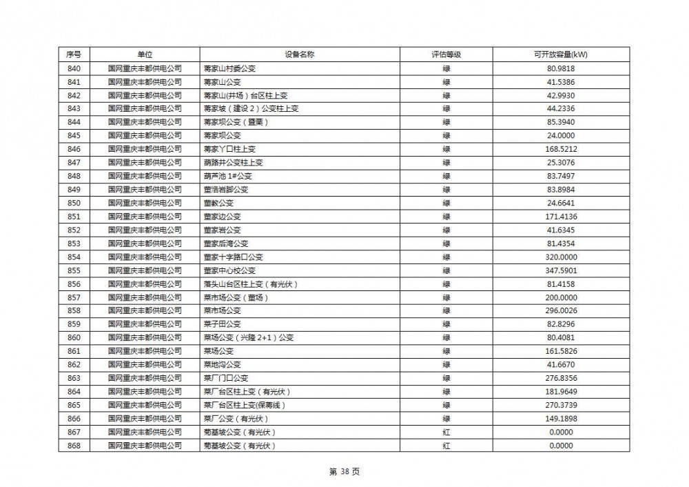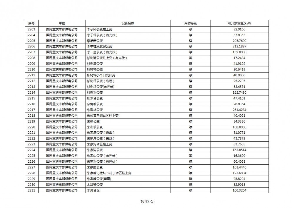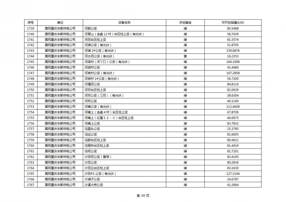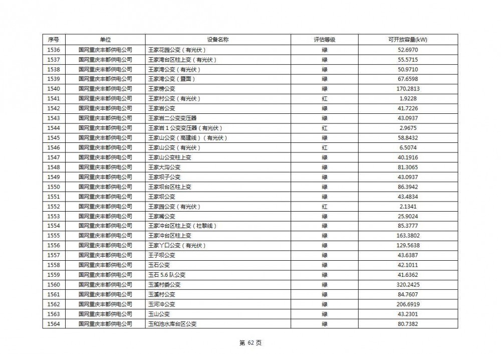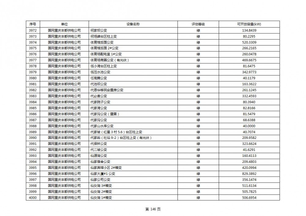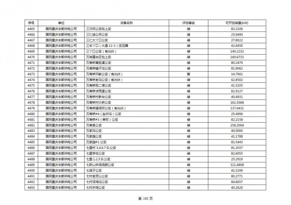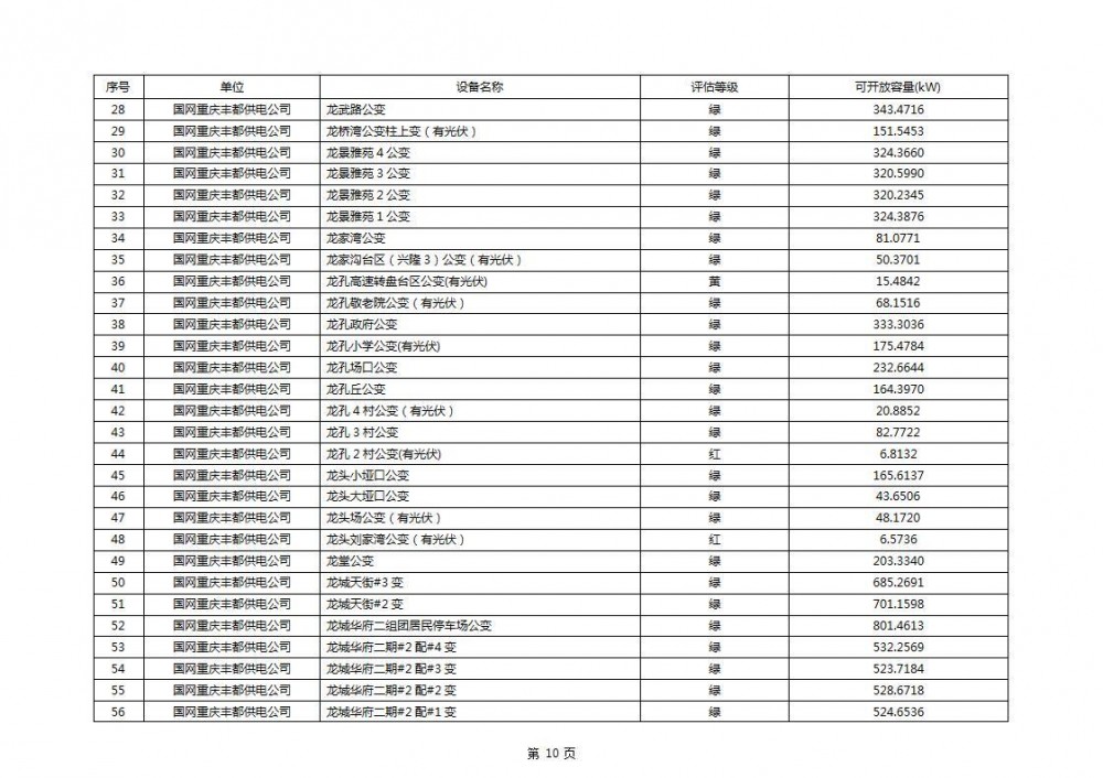根据公示文件,丰都县10kV线路33个主变全部为绿色,可开放容量651.256MW。126个线路,仅一个黄区,其余全部为绿色,可开放容量为683.855MW。