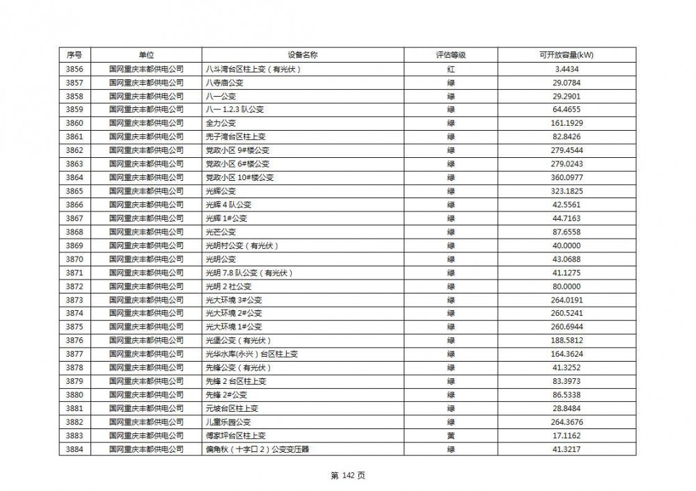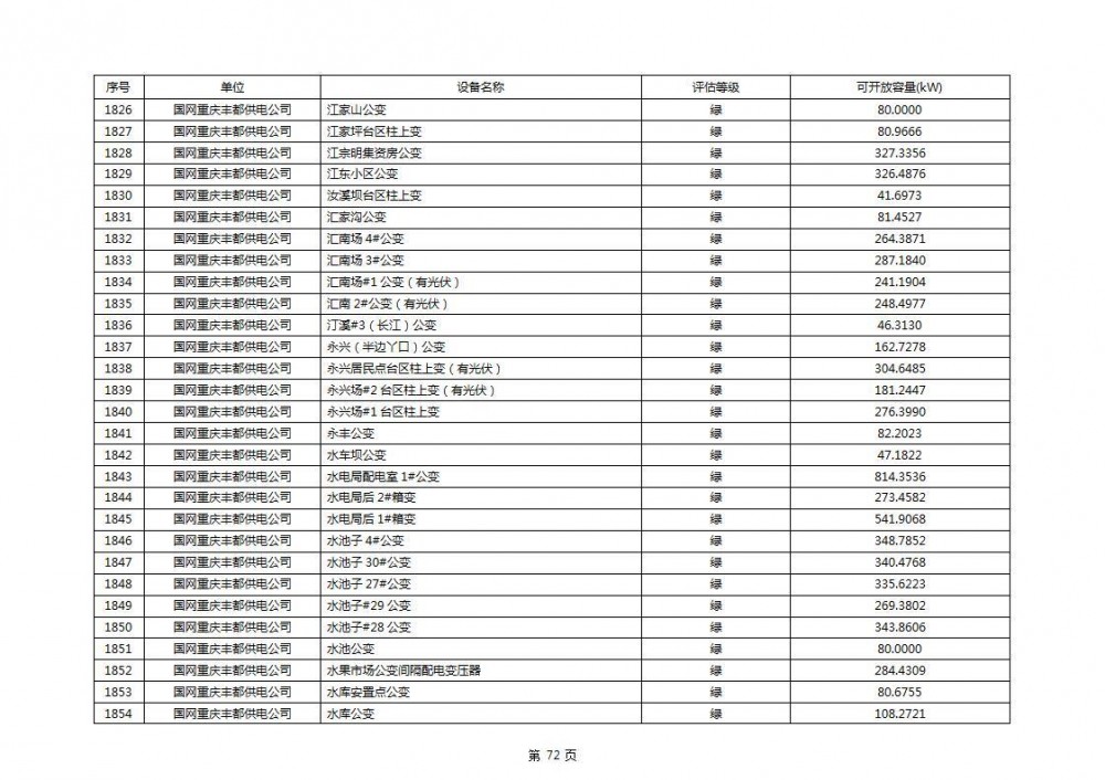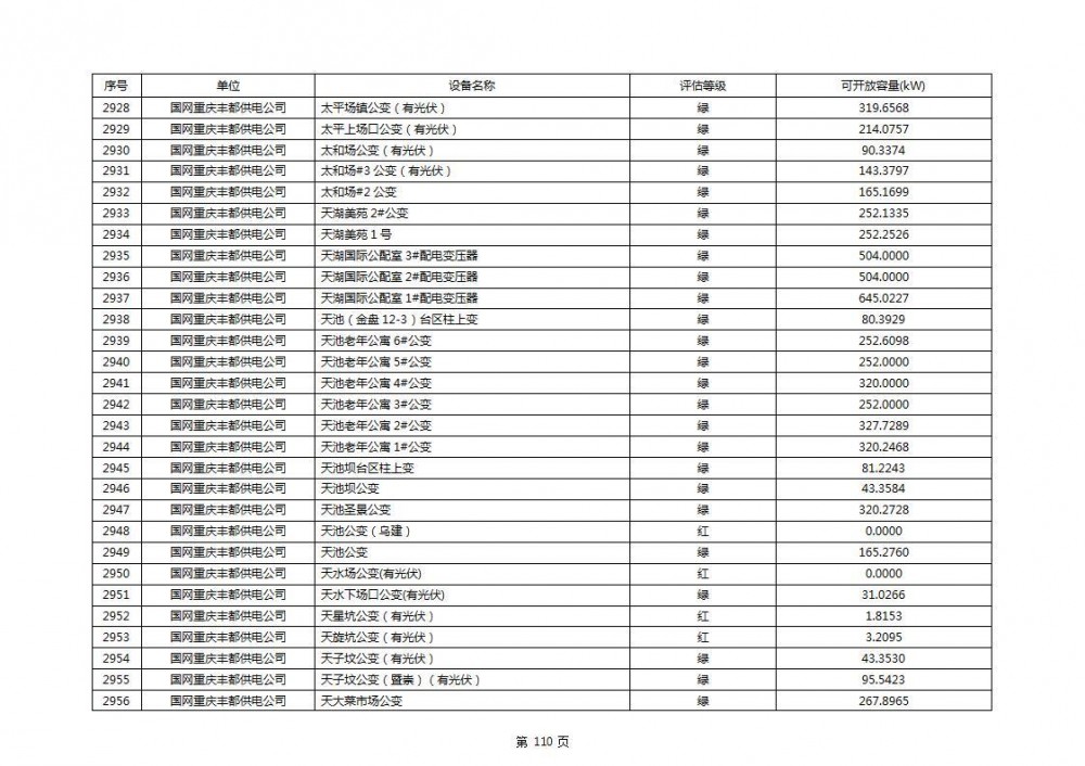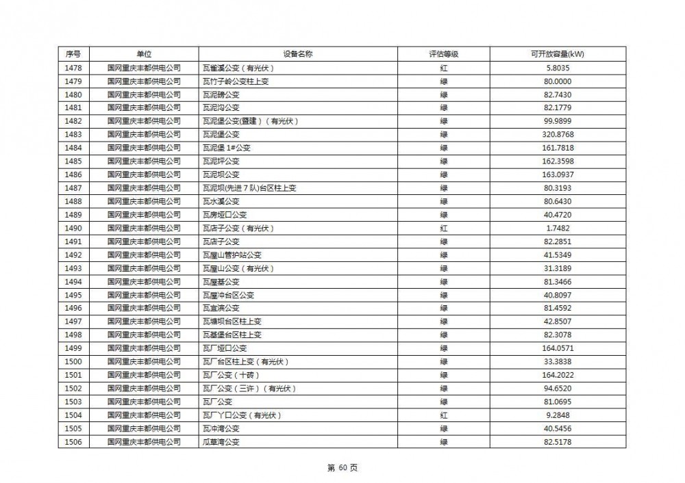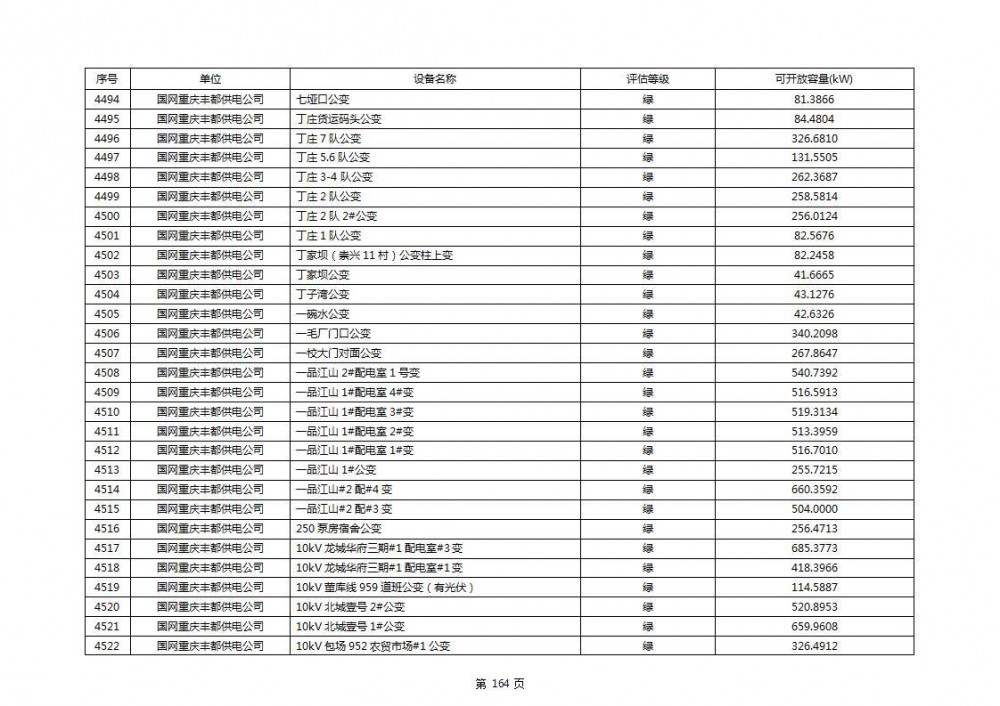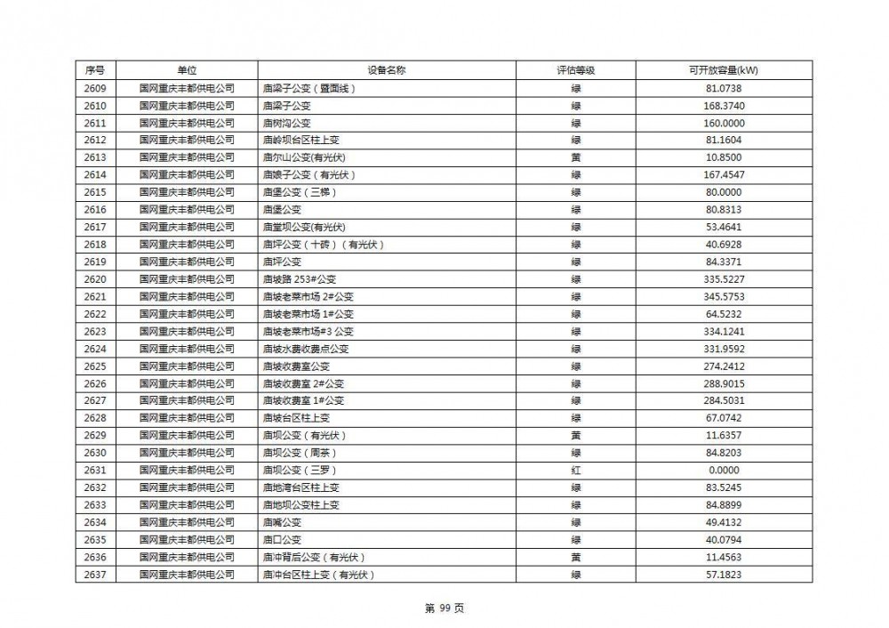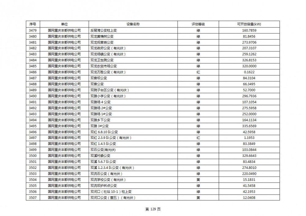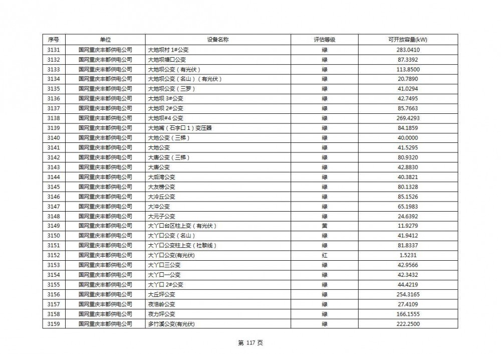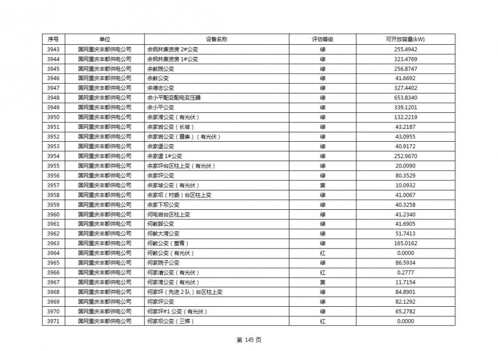 根据公示文件,丰都县10kV线路33个主变全部为绿色,可开放容量651.256MW。126个线路,仅一个黄区,其余全部为绿色,可开放容量为683.855MW。
