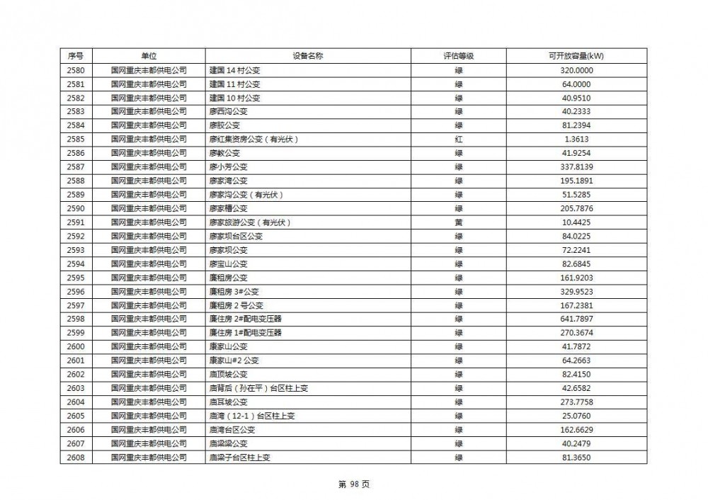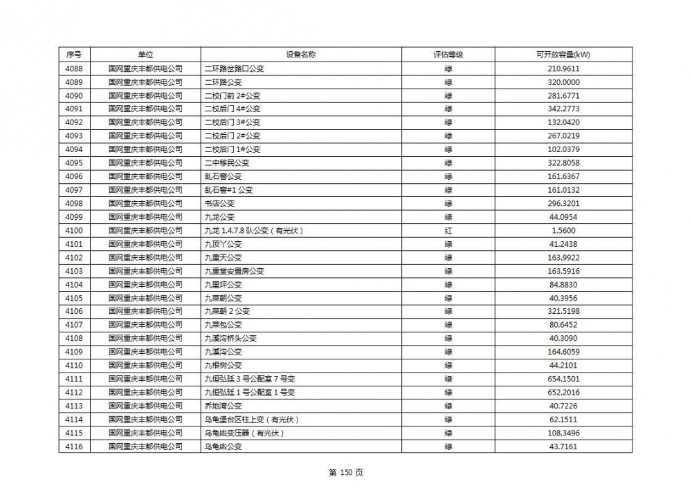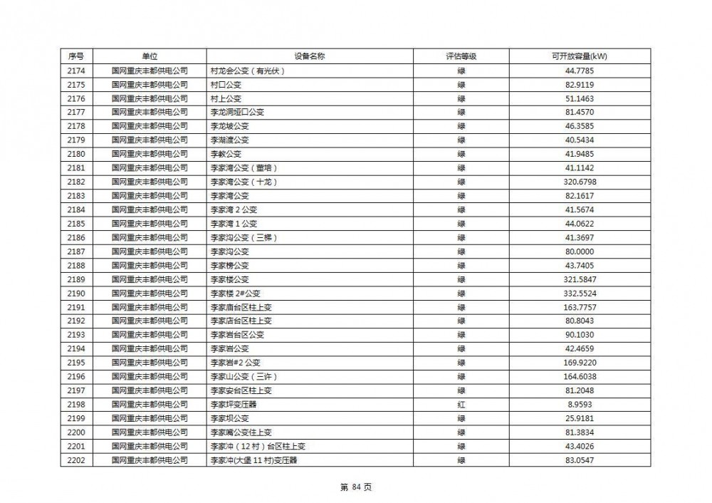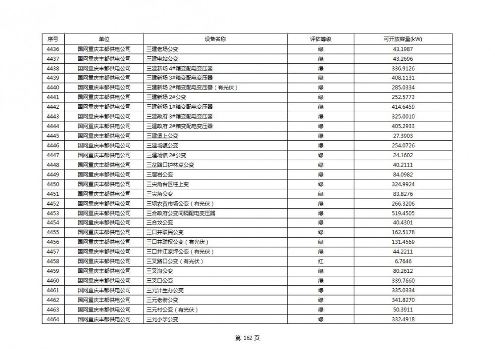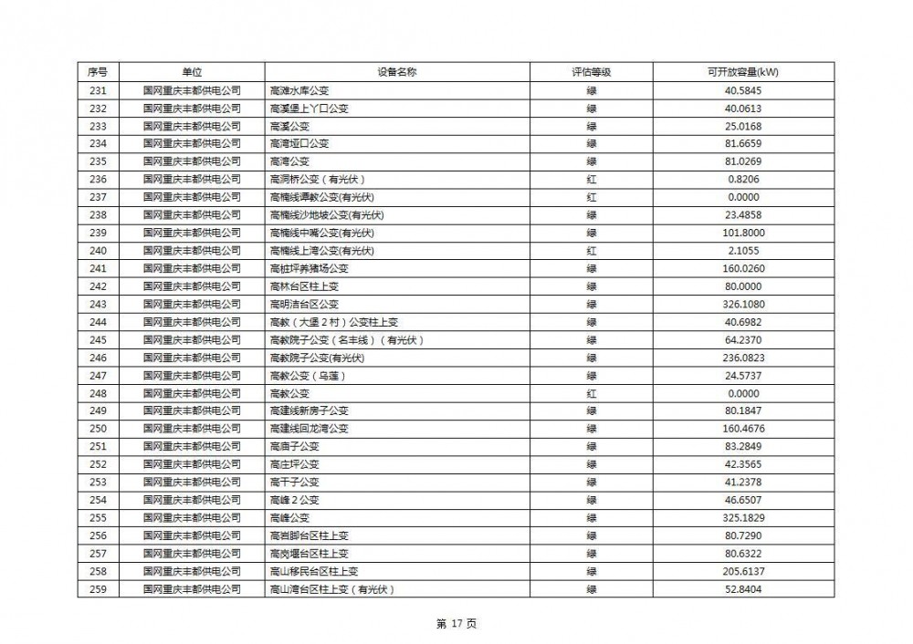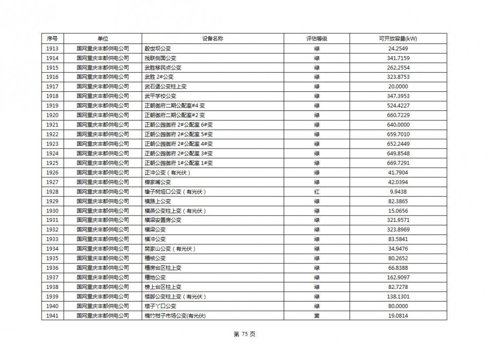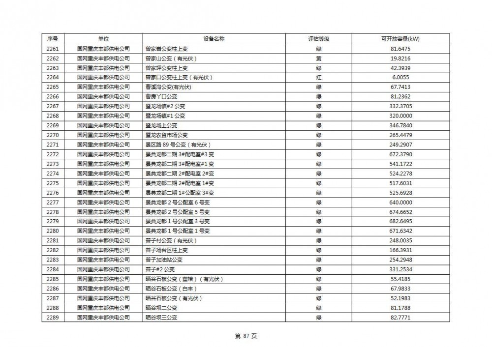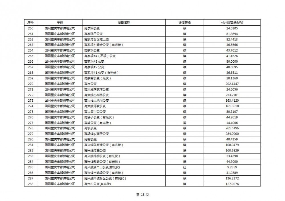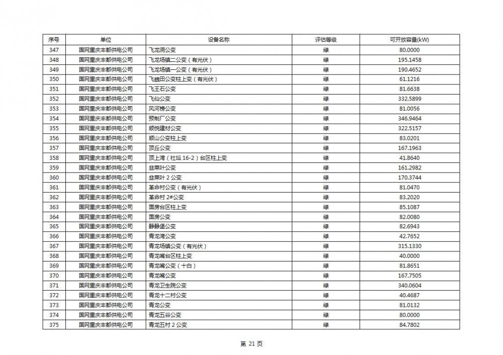 根据公示文件,丰都县10kV线路33个主变全部为绿色,可开放容量651.256MW。126个线路,仅一个黄区,其余全部为绿色,可开放容量为683.855MW。