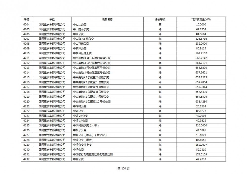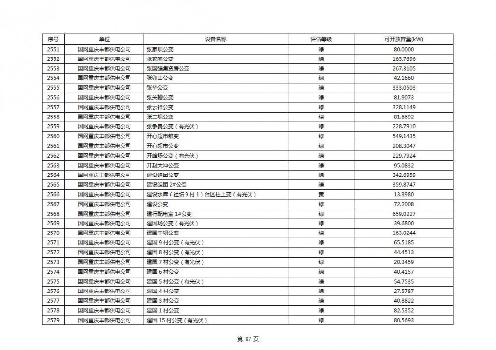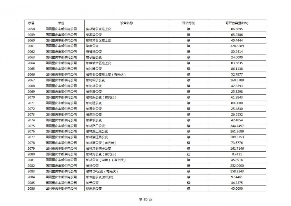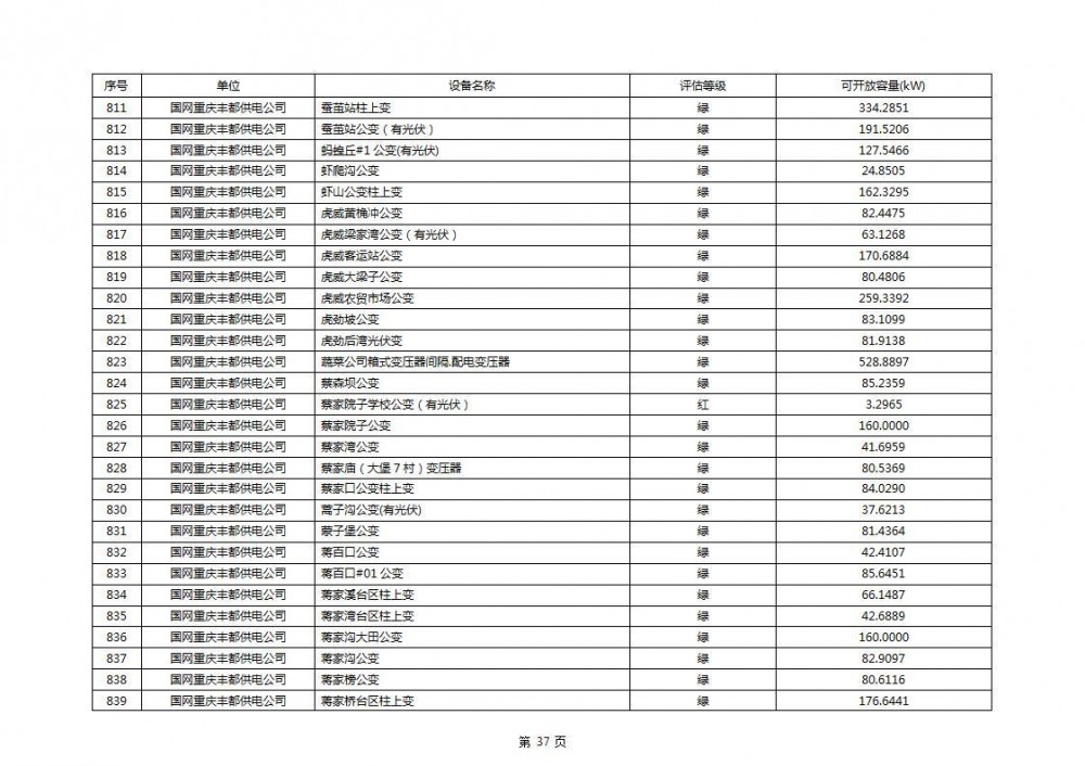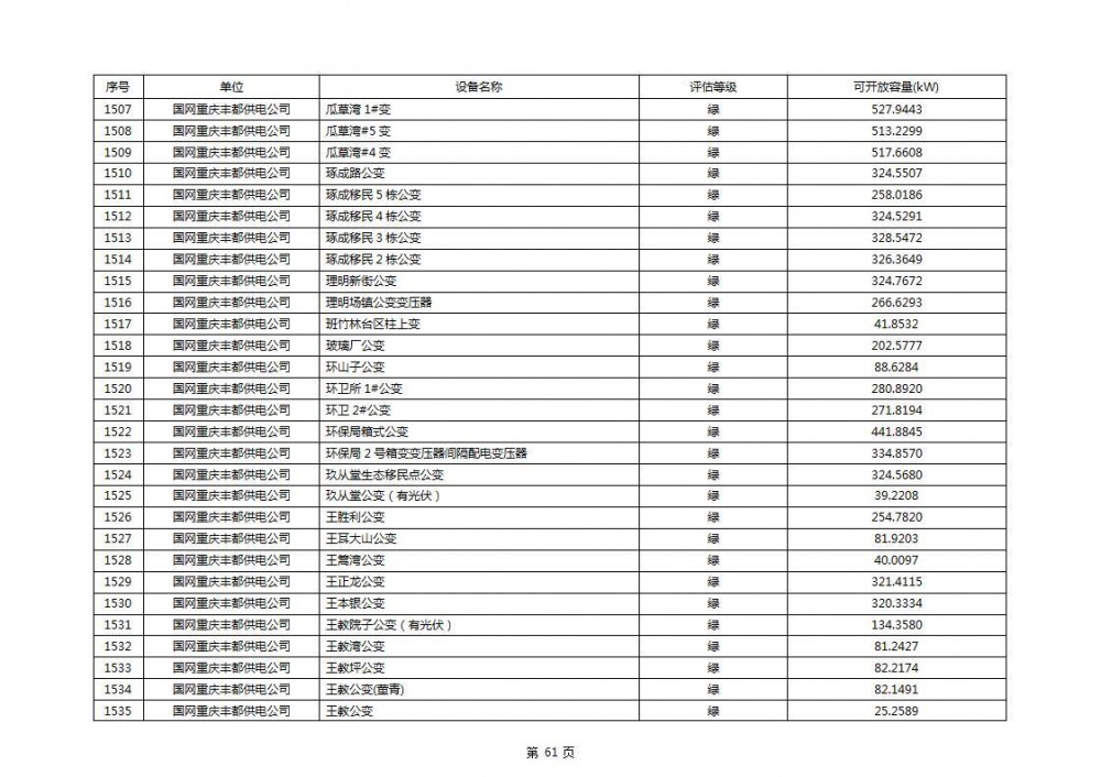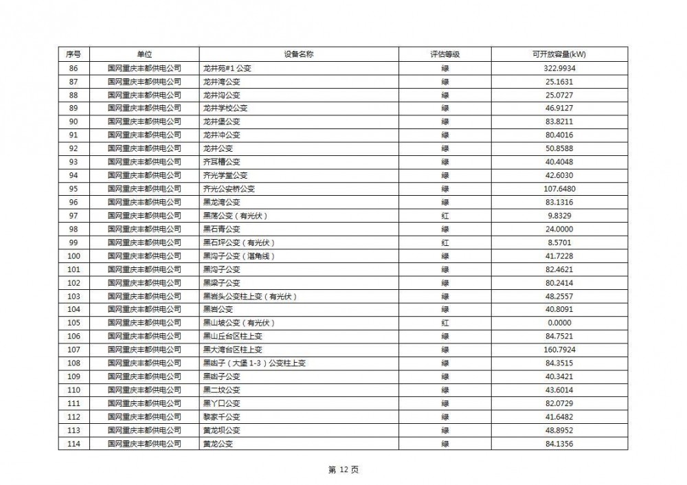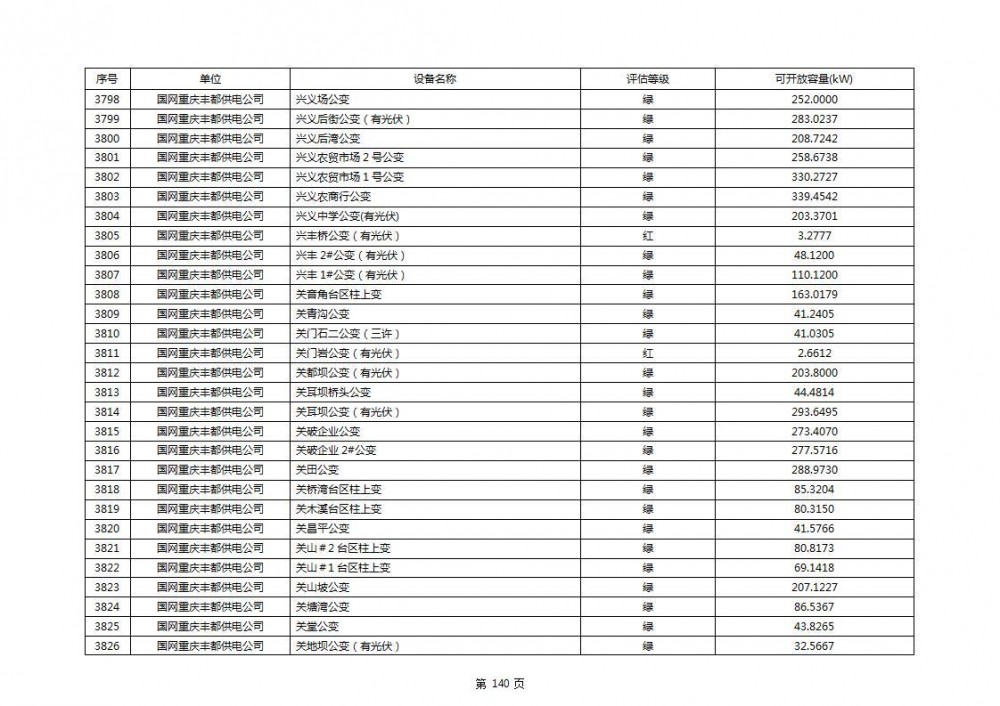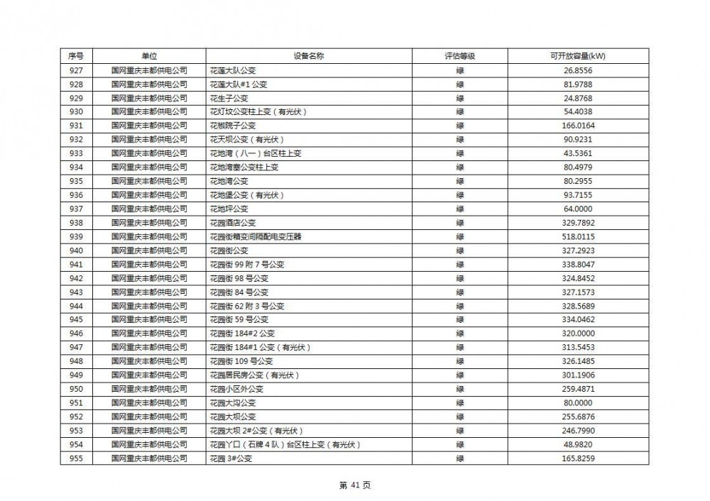 根据公示文件,丰都县10kV线路33个主变全部为绿色,可开放容量651.256MW。126个线路,仅一个黄区,其余全部为绿色,可开放容量为683.855MW。
