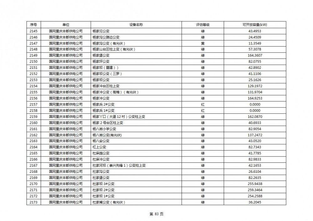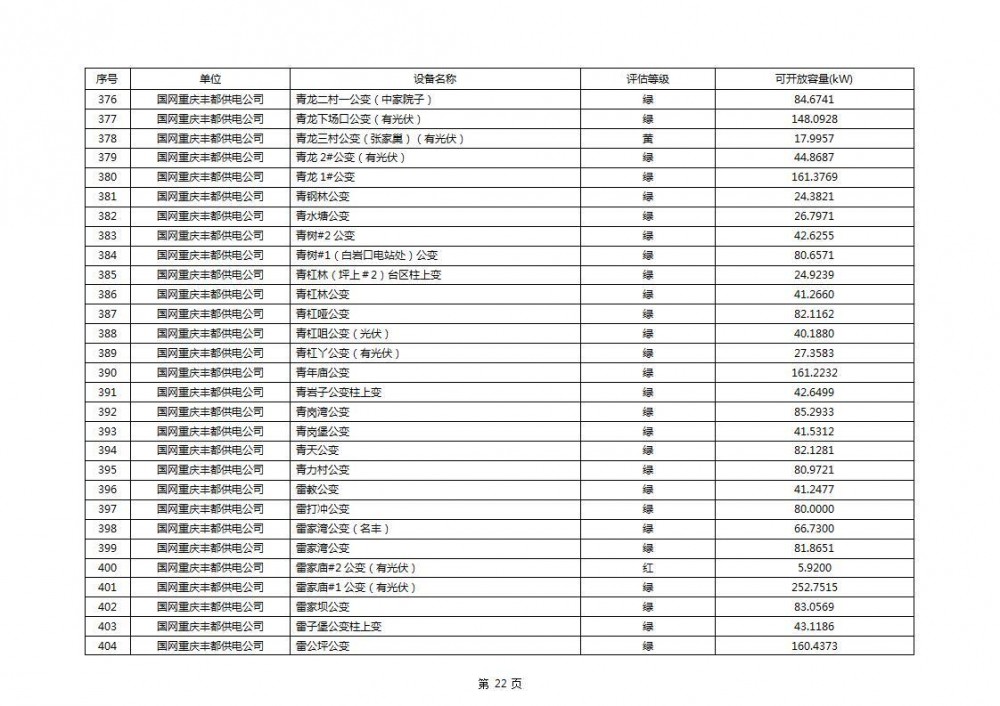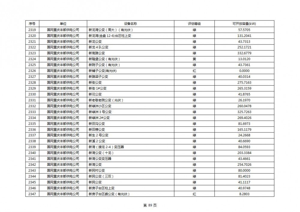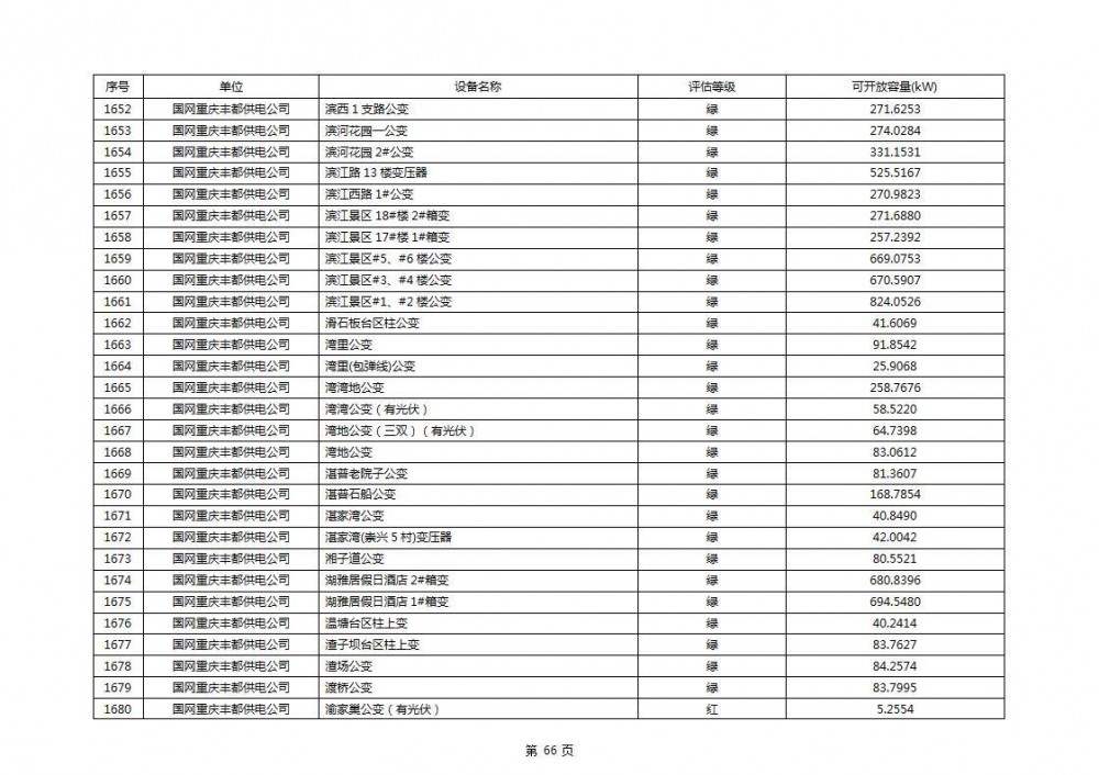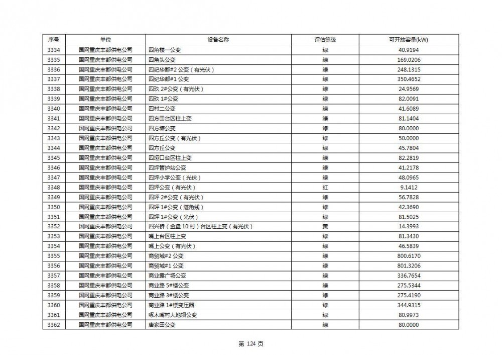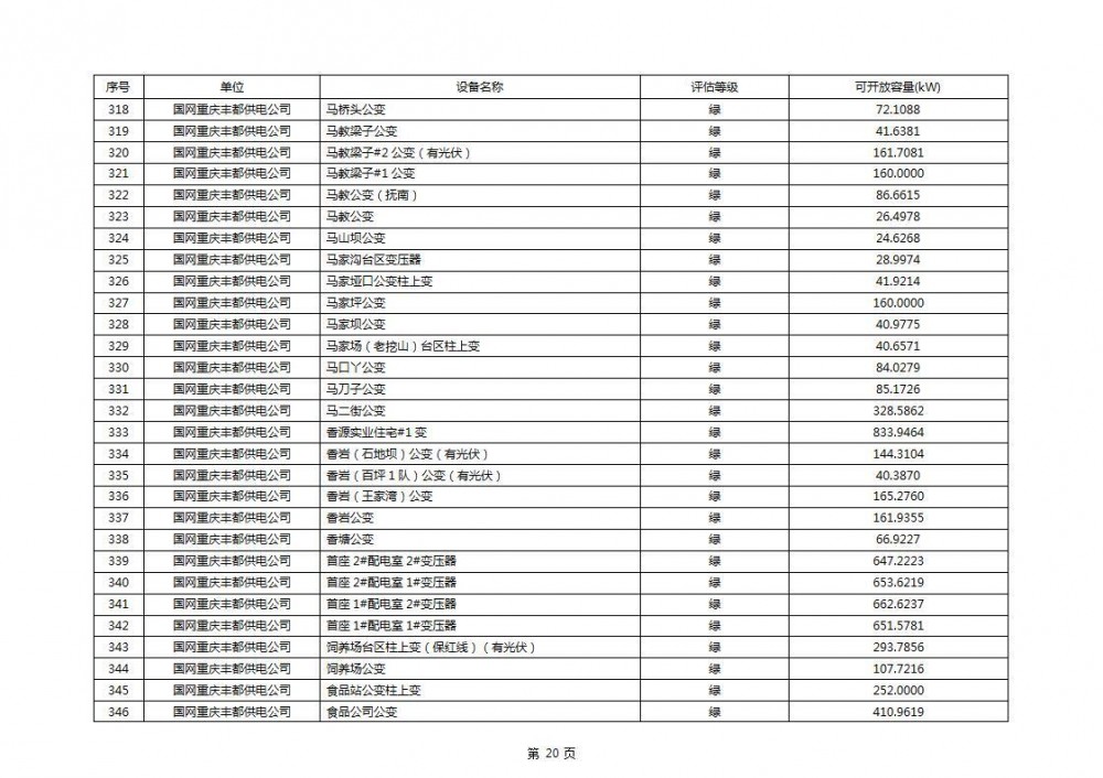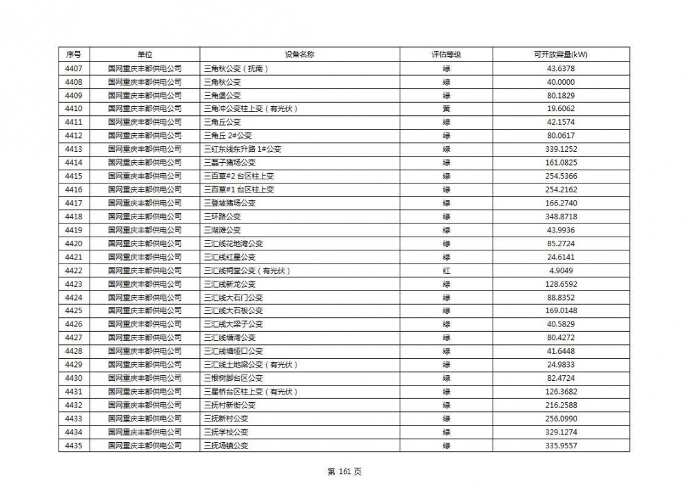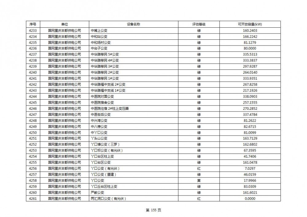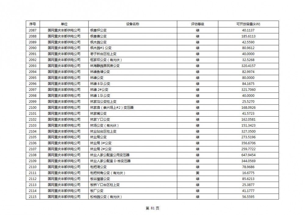 根据公示文件,丰都县10kV线路33个主变全部为绿色,可开放容量651.256MW。126个线路,仅一个黄区,其余全部为绿色,可开放容量为683.855MW。