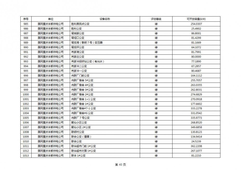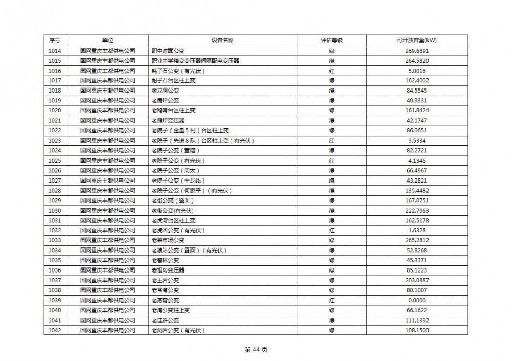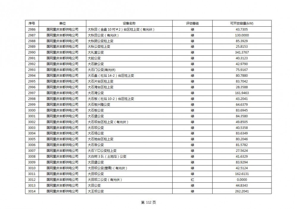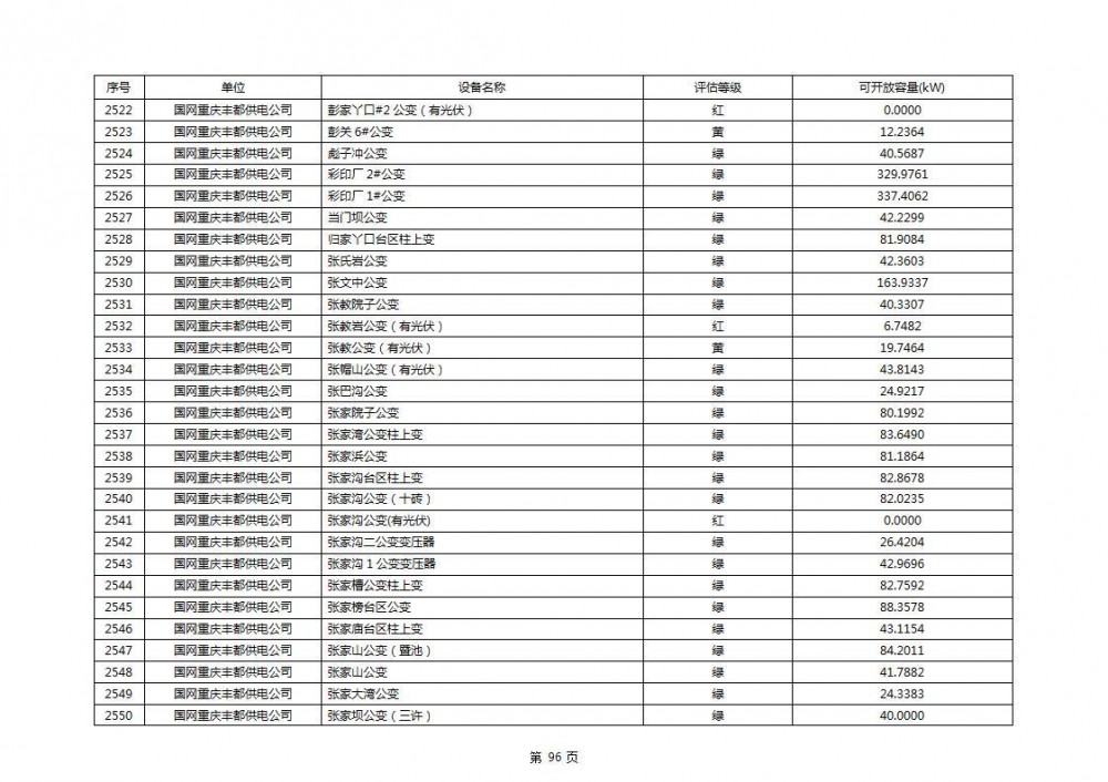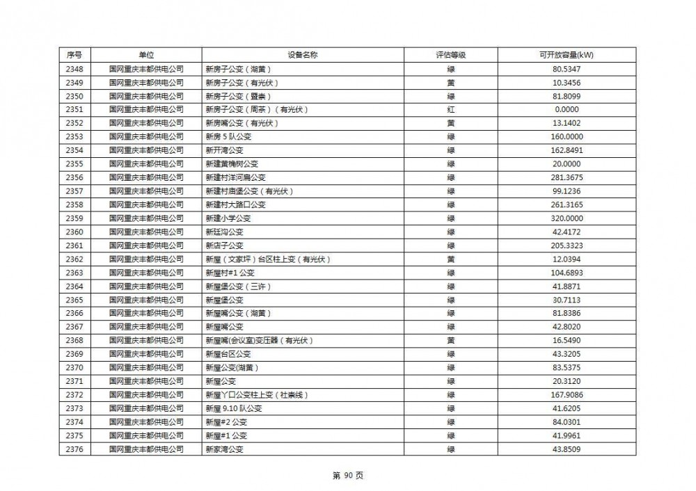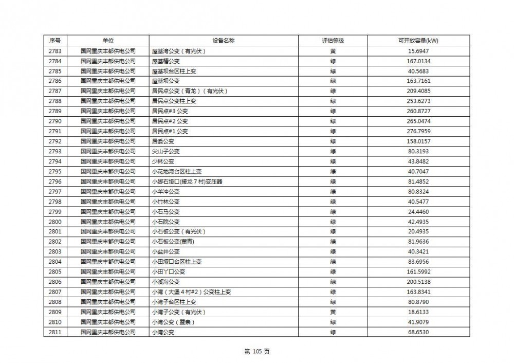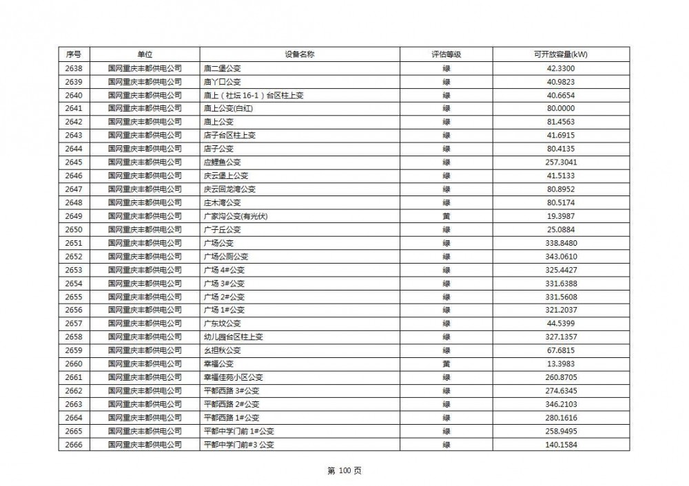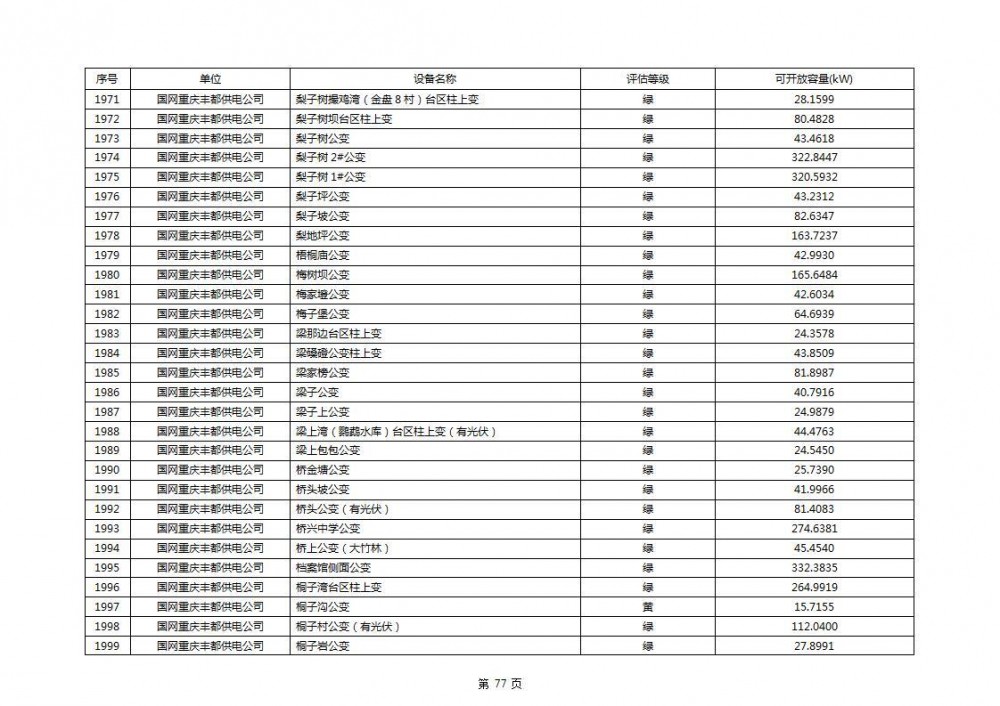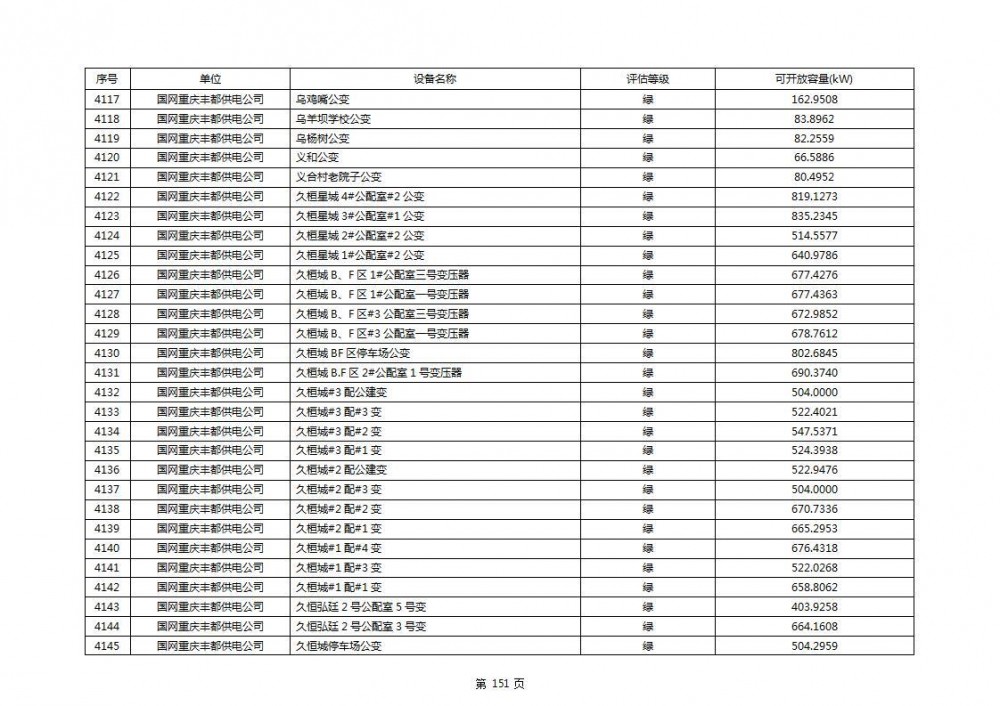 根据公示文件,丰都县10kV线路33个主变全部为绿色,可开放容量651.256MW。126个线路,仅一个黄区,其余全部为绿色,可开放容量为683.855MW。