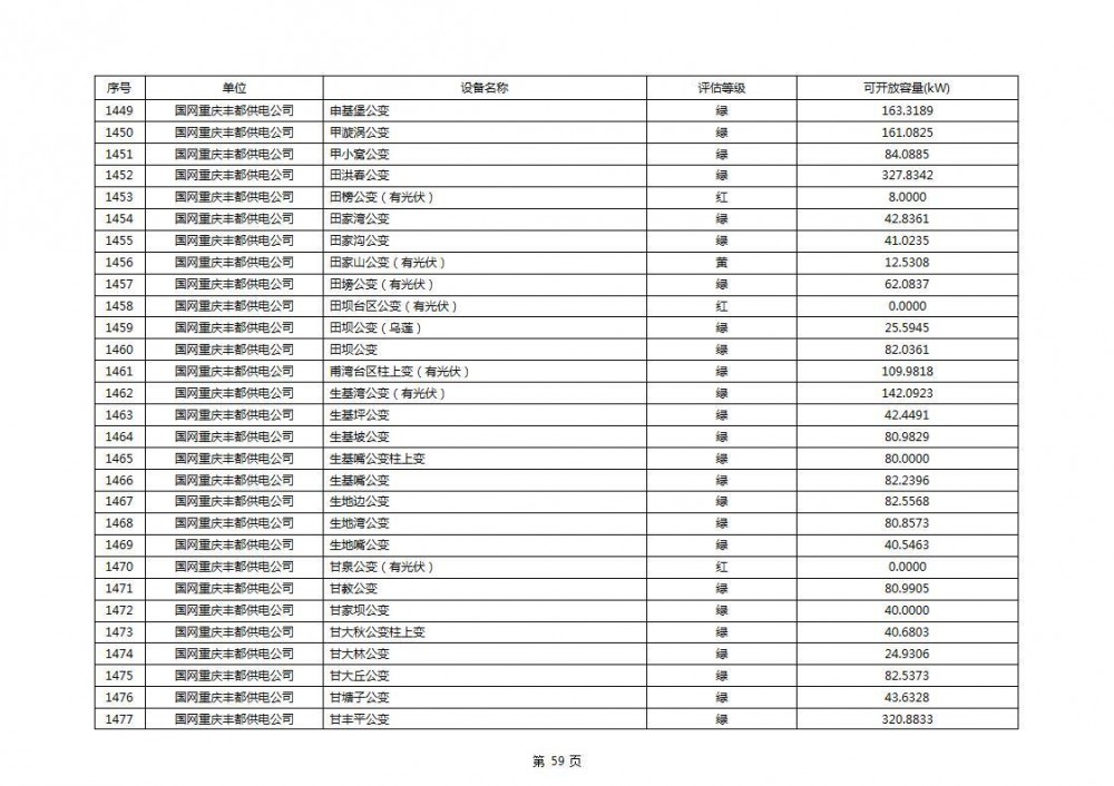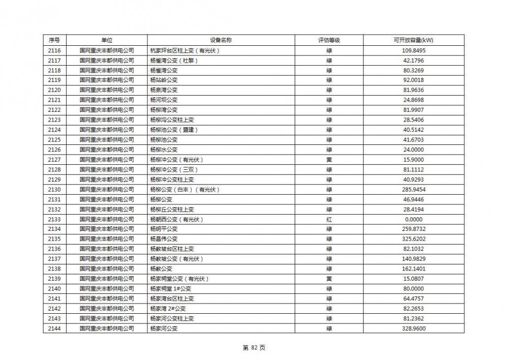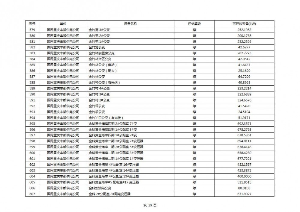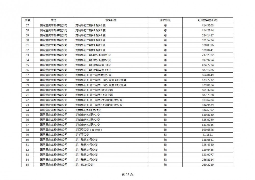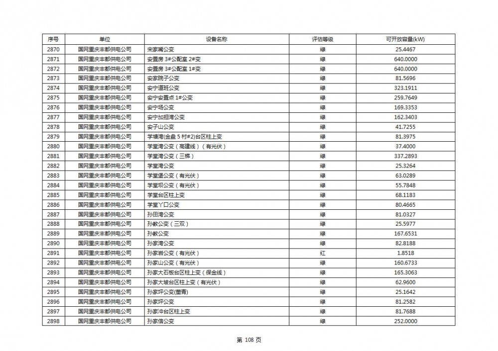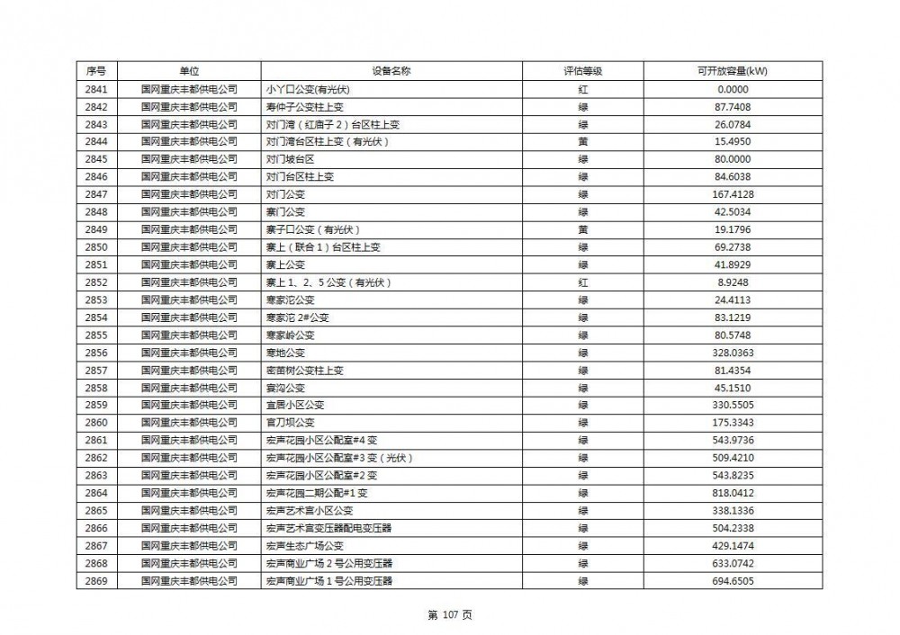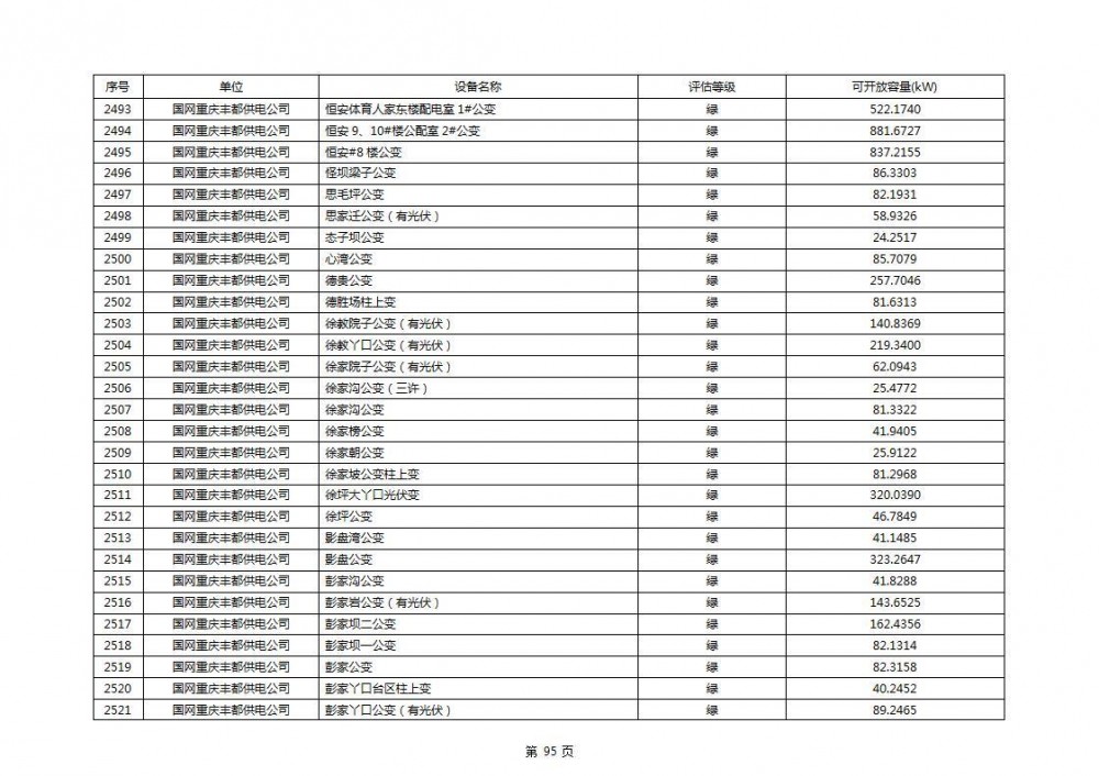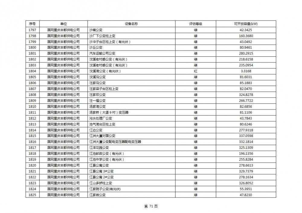 根据公示文件,丰都县10kV线路33个主变全部为绿色,可开放容量651.256MW。126个线路,仅一个黄区,其余全部为绿色,可开放容量为683.855MW。