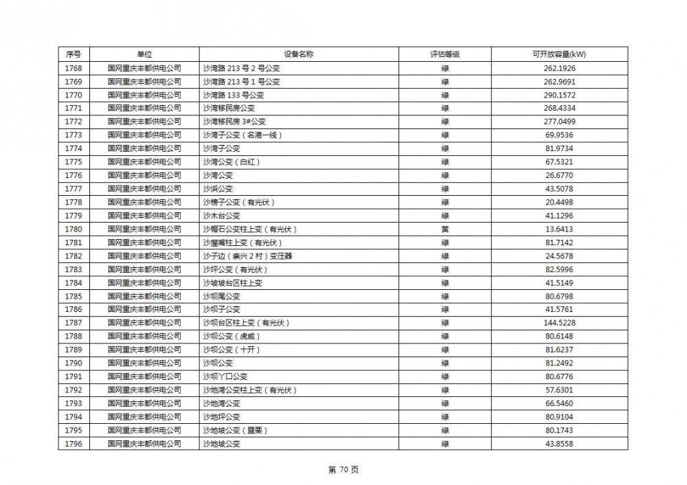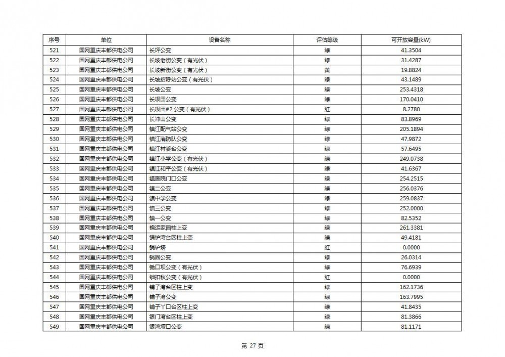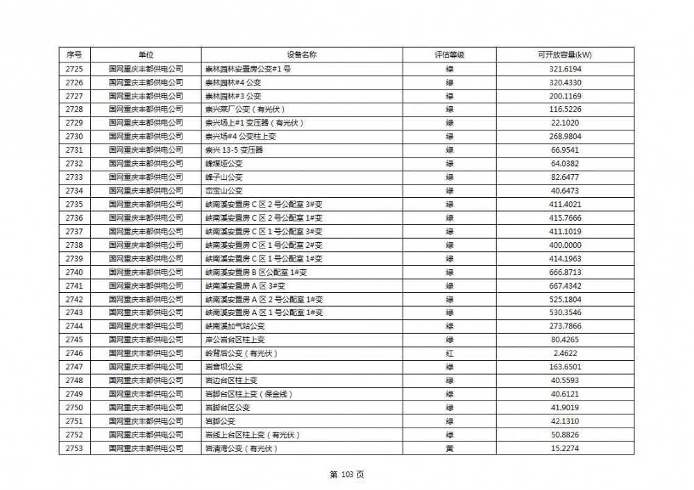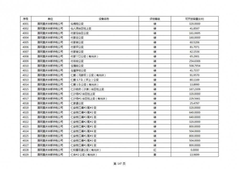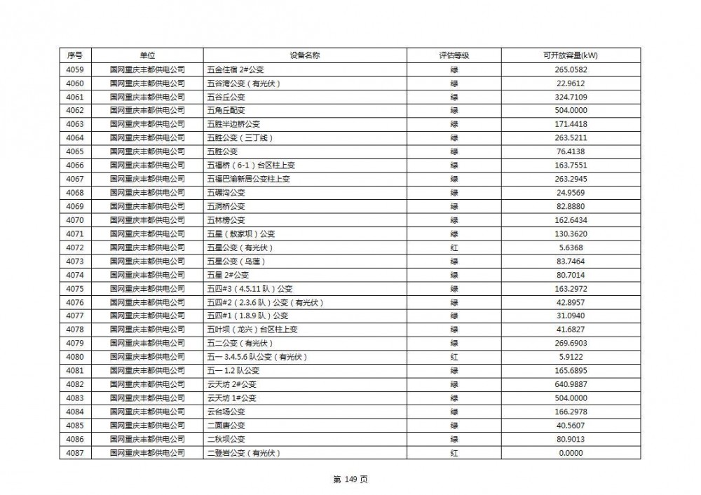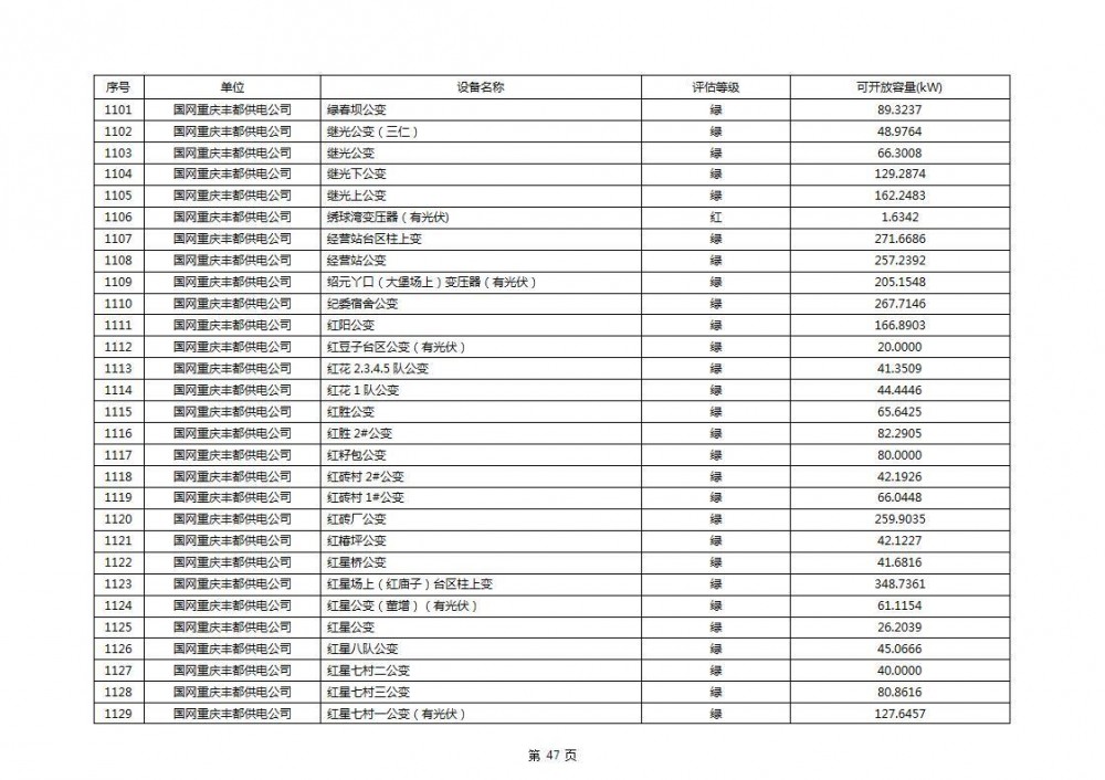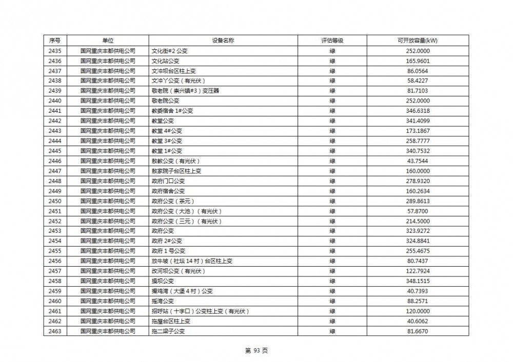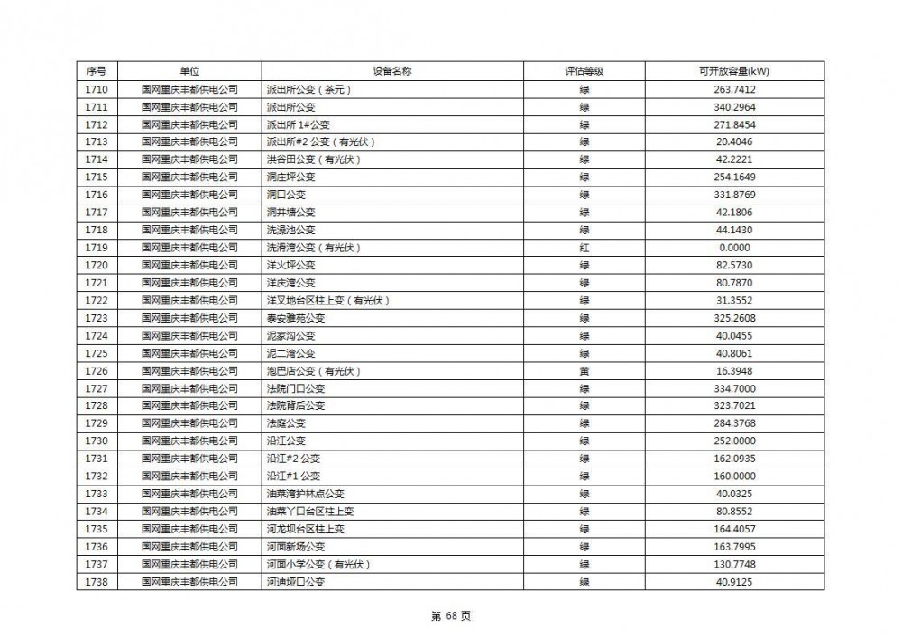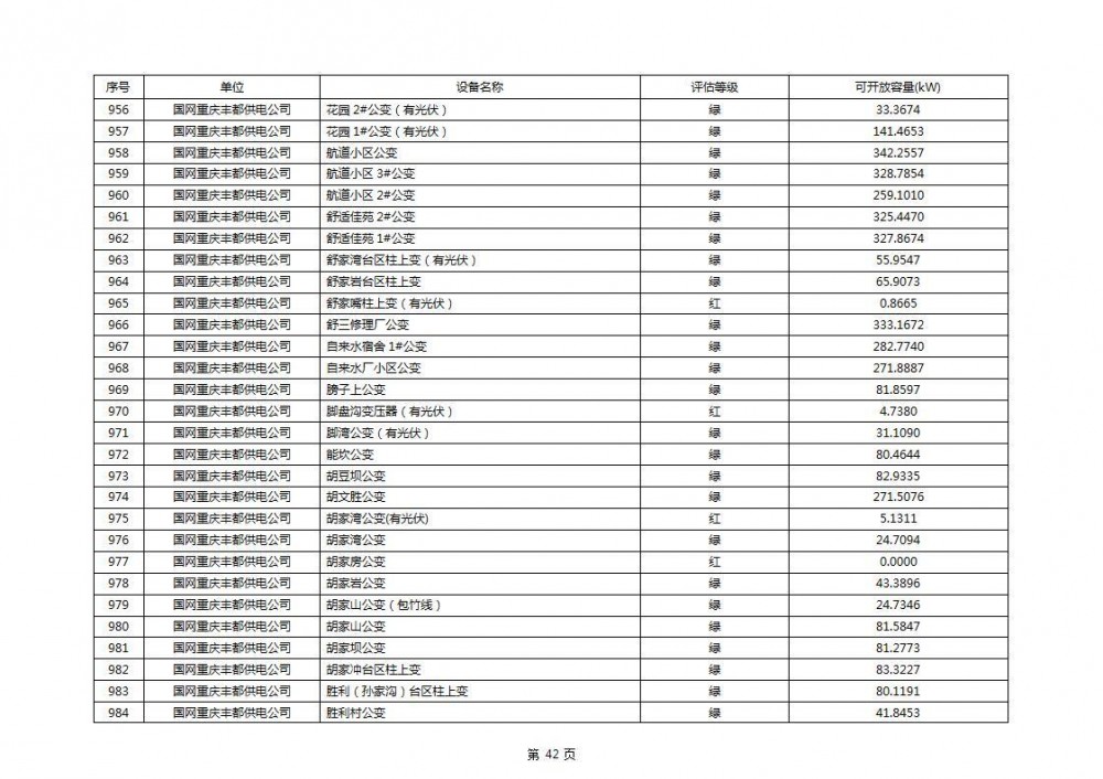 根据公示文件,丰都县10kV线路33个主变全部为绿色,可开放容量651.256MW。126个线路,仅一个黄区,其余全部为绿色,可开放容量为683.855MW。