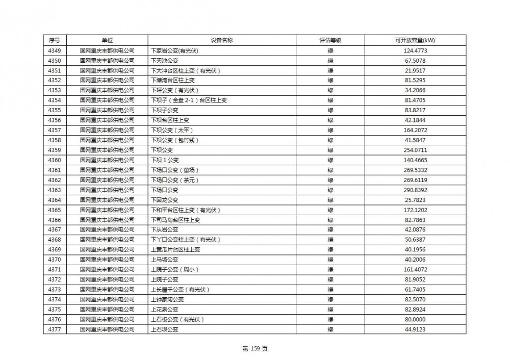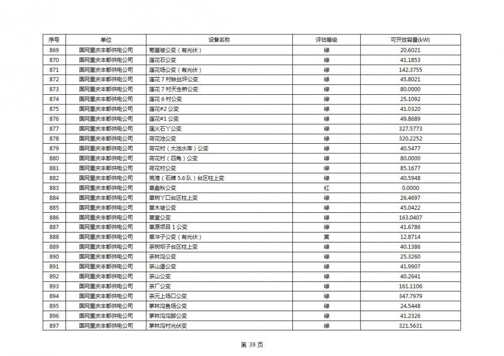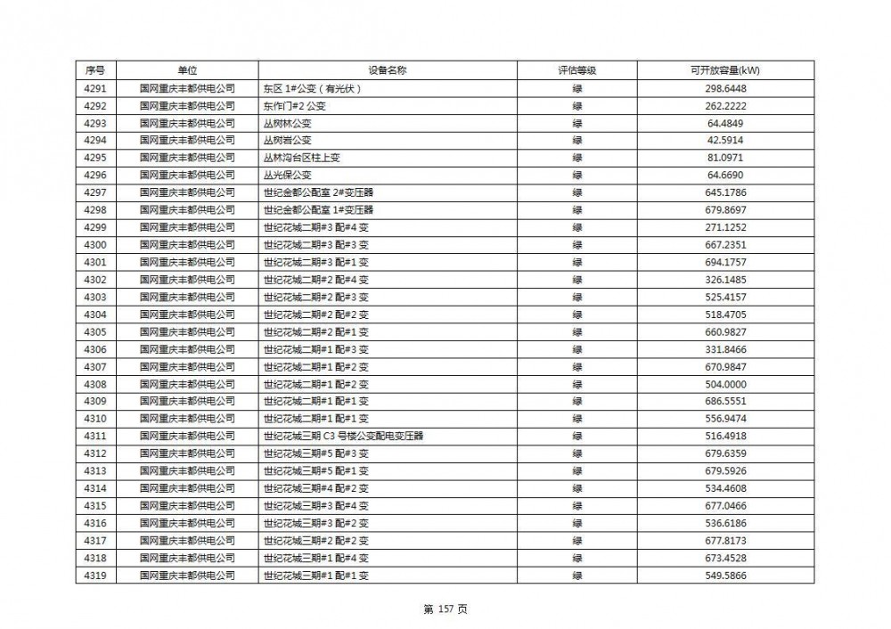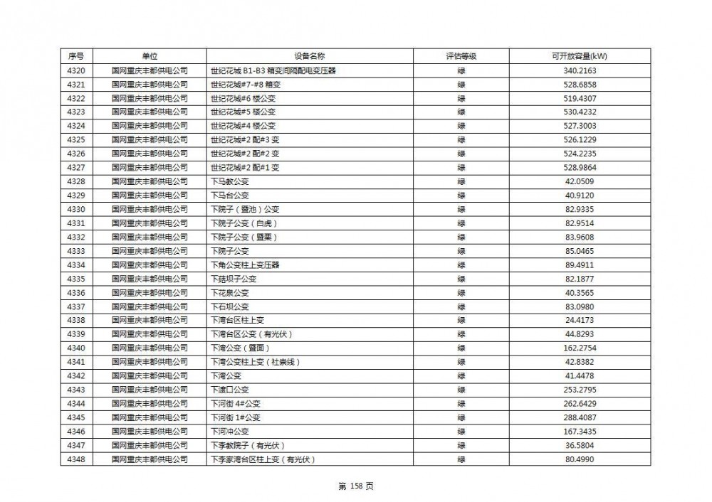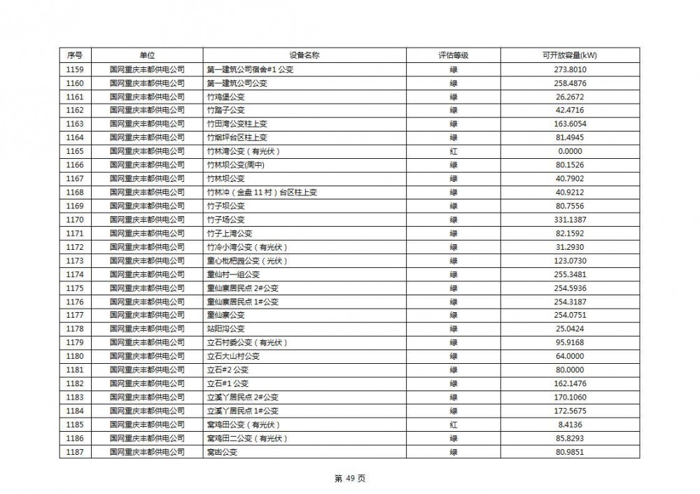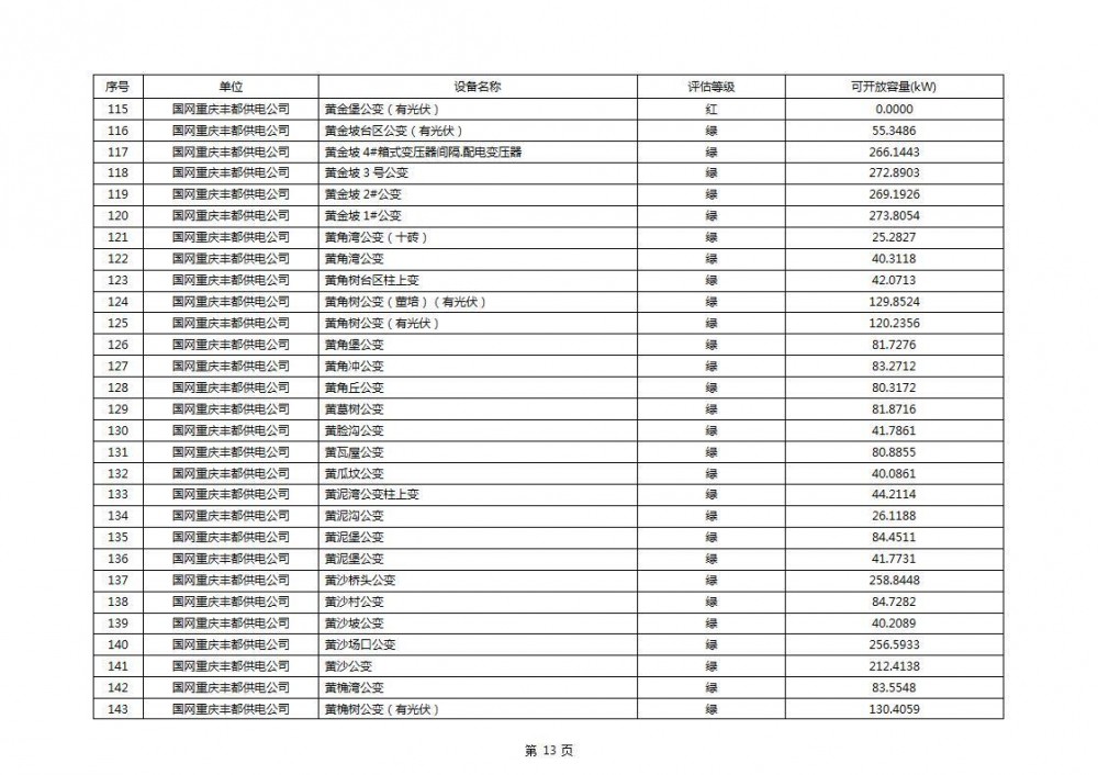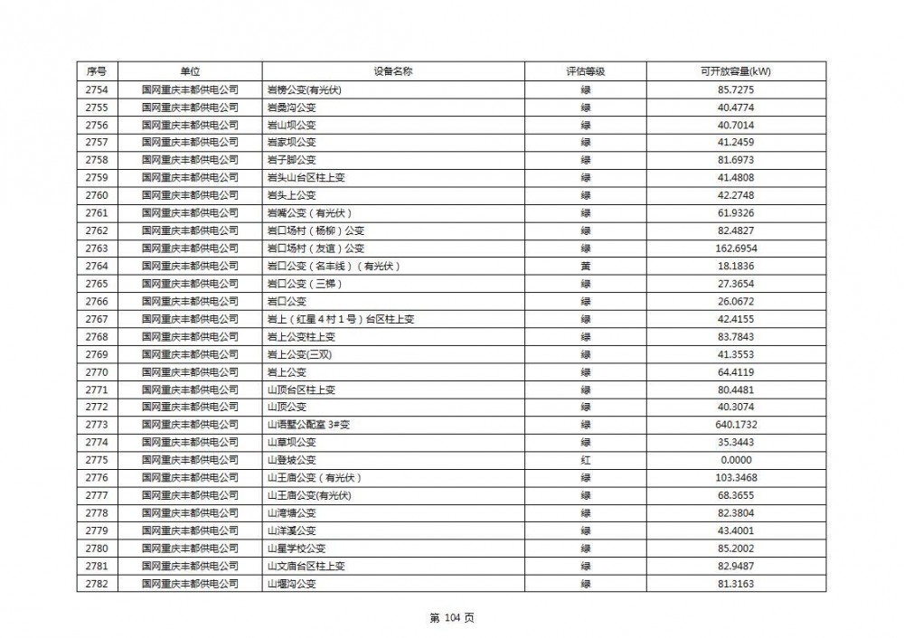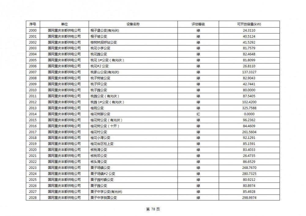 根据公示文件,丰都县10kV线路33个主变全部为绿色,可开放容量651.256MW。126个线路,仅一个黄区,其余全部为绿色,可开放容量为683.855MW。