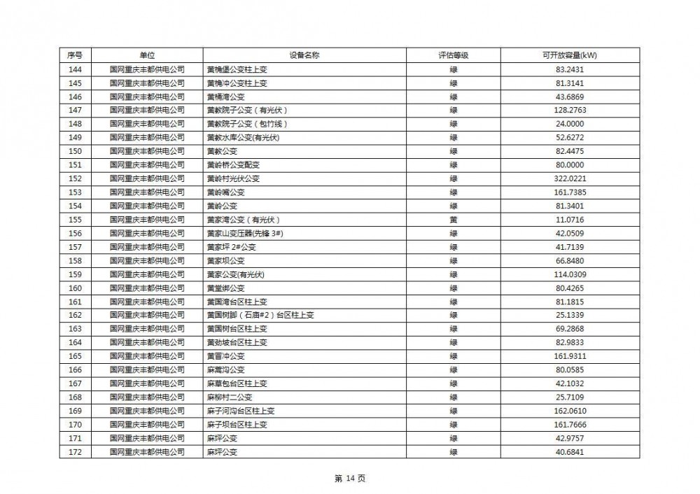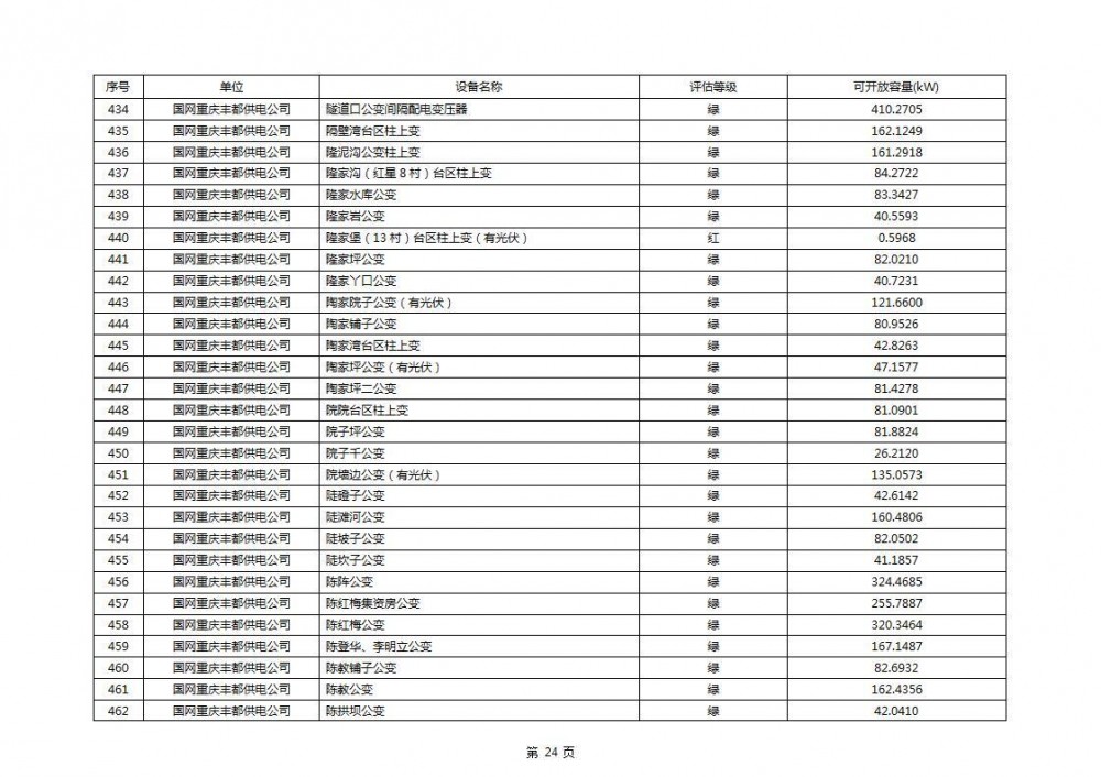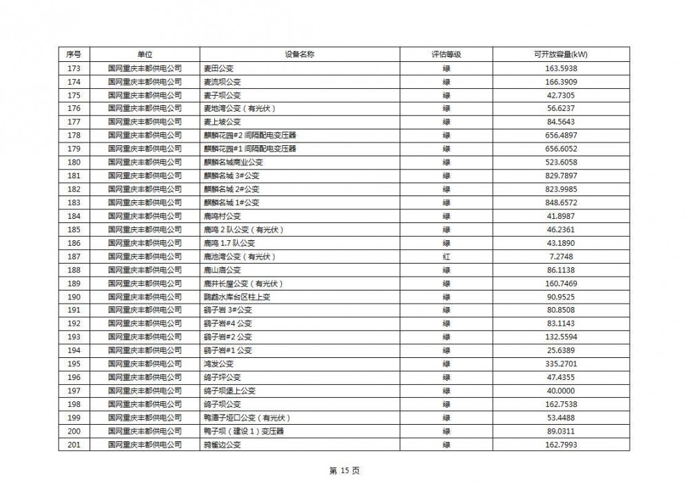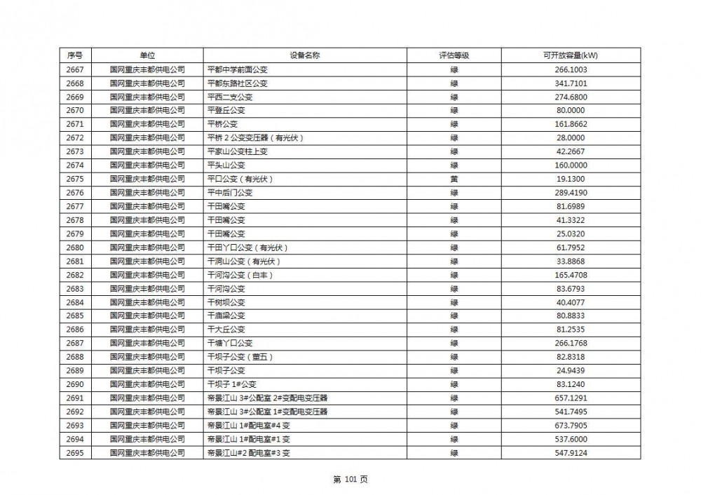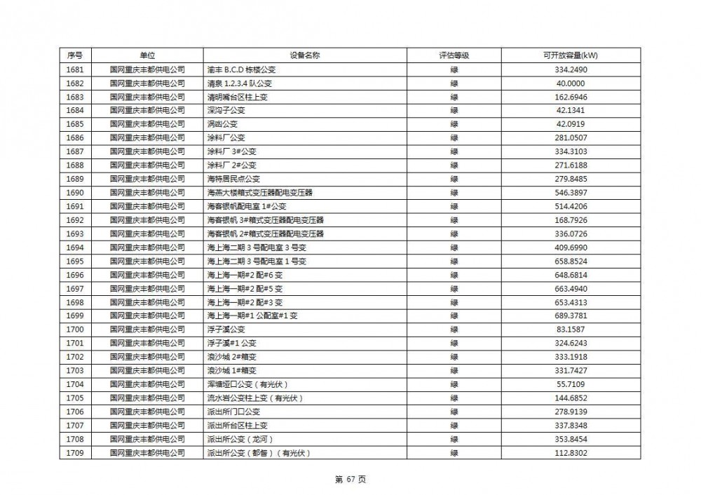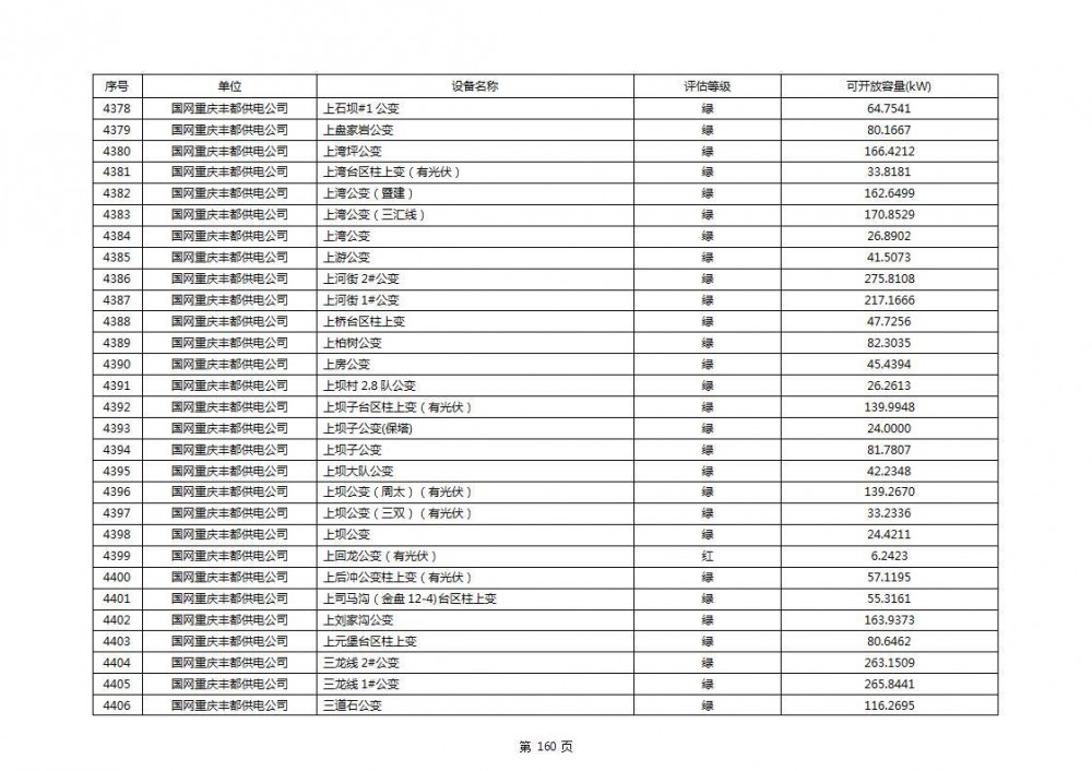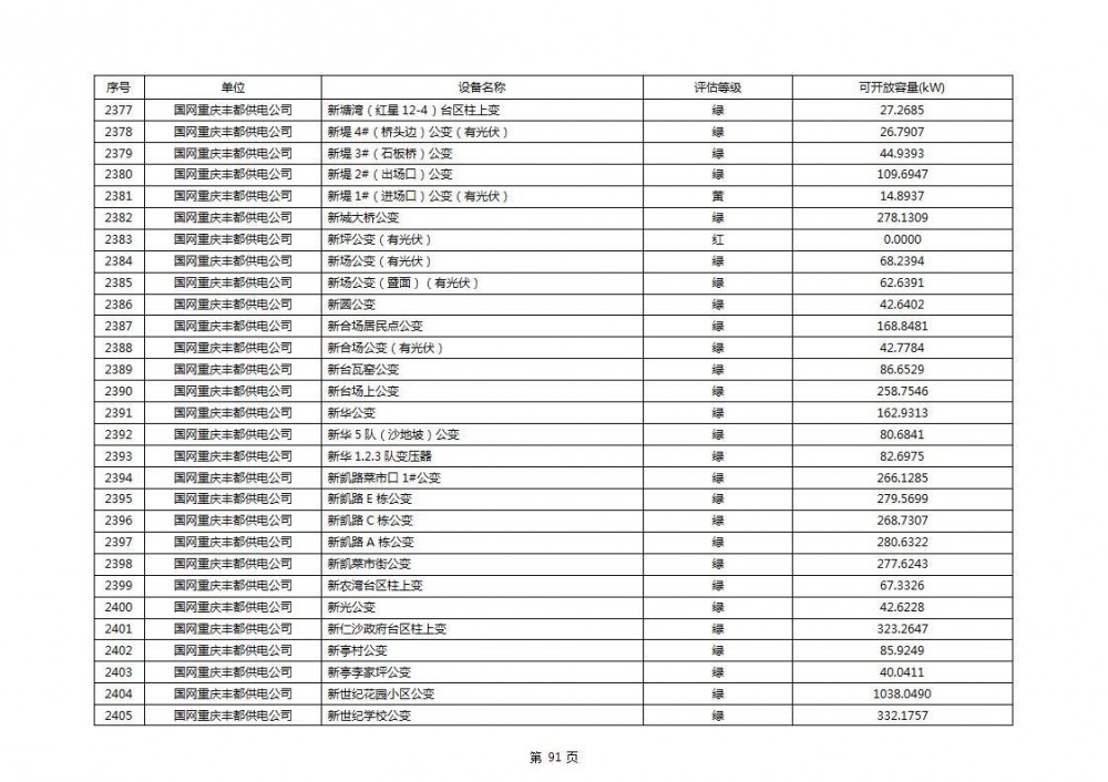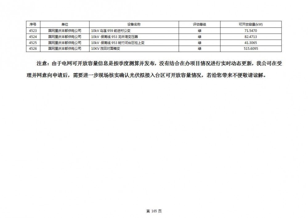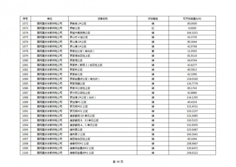 根据公示文件,丰都县10kV线路33个主变全部为绿色,可开放容量651.256MW。126个线路,仅一个黄区,其余全部为绿色,可开放容量为683.855MW。