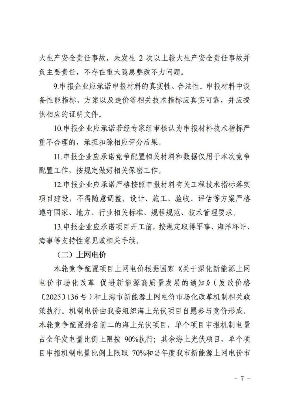 文件明确,本轮竞争配置项目上网电价根据国家《关于深化新能源上网电价市场化改革 促进新能源高质量发展的通知》(发改价格〔2025〕136号)和上海市新能源上网电价市场化改革机制相关政策执行。机制电价由上海市发改委组织海上光伏项目自愿参与竞价形成。本轮竞争配置排名前二的海上光伏项目,单个项目申报机制电量占全年发电量比例上限按90%执行;其余海上光伏项目,单个项目申报机制电量比例上限取70%和当年度我市新能源上网电价市场化改革机制相关政策规定上限的低值。