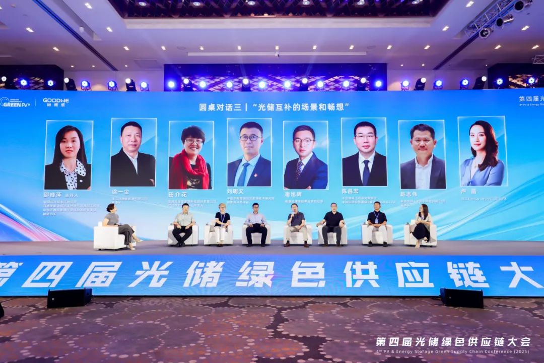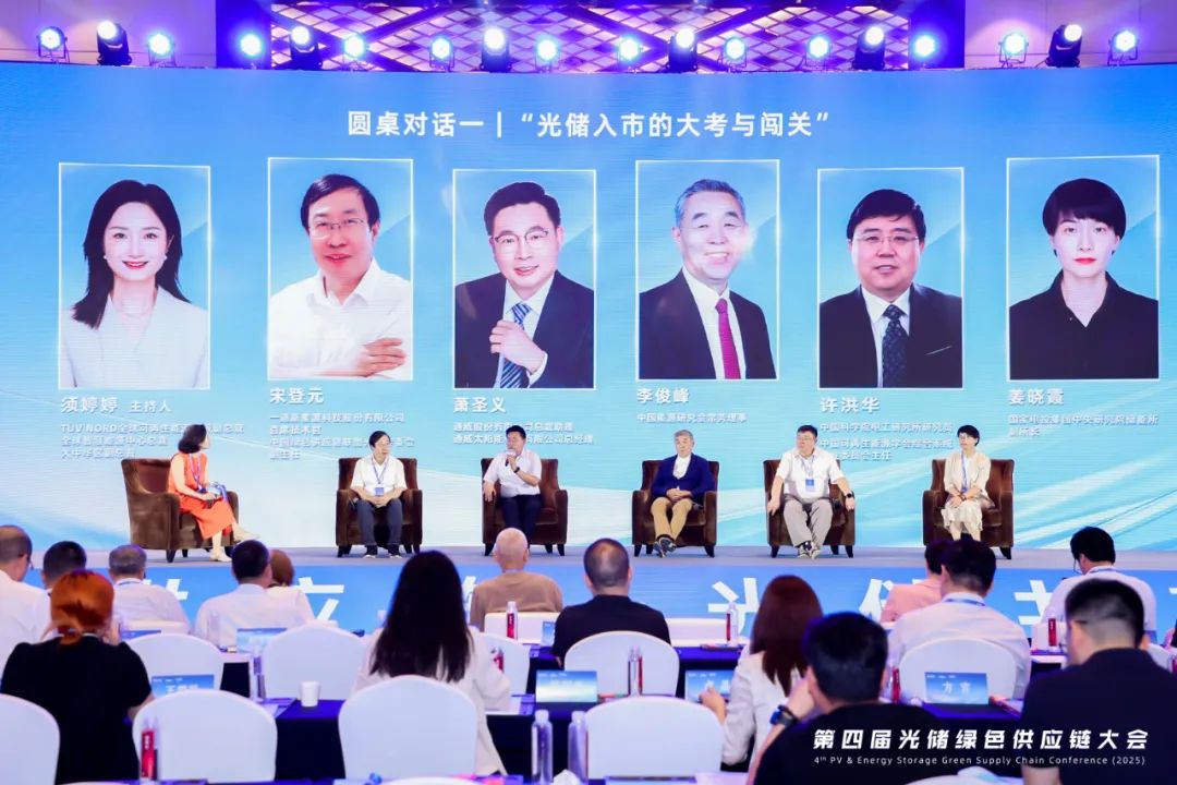 第一场圆桌对话由TÜV NORD全球可再生能源高级副总裁、全球智慧能源中心总裁、大中华区副总裁须婷婷主持。中国能源研究会常务理事李俊峰,中国科学院电工研究所研究员、中国可再生能源学会综合系统专业委员会主任许洪华,国家电投集团中央研究院储能所副所长姜晓霞,通威股份有限公司总裁助理、通威太阳能科技有限公司总经理萧圣义、一道新能源科技股份有限公司首席技术官宋登元,围绕全产业链协同破局路径、光储融合必要性论证、西部基地消纳技术方案、市场断崖风险预警、场景化商业模式转型等核心议题展开深度讨论。